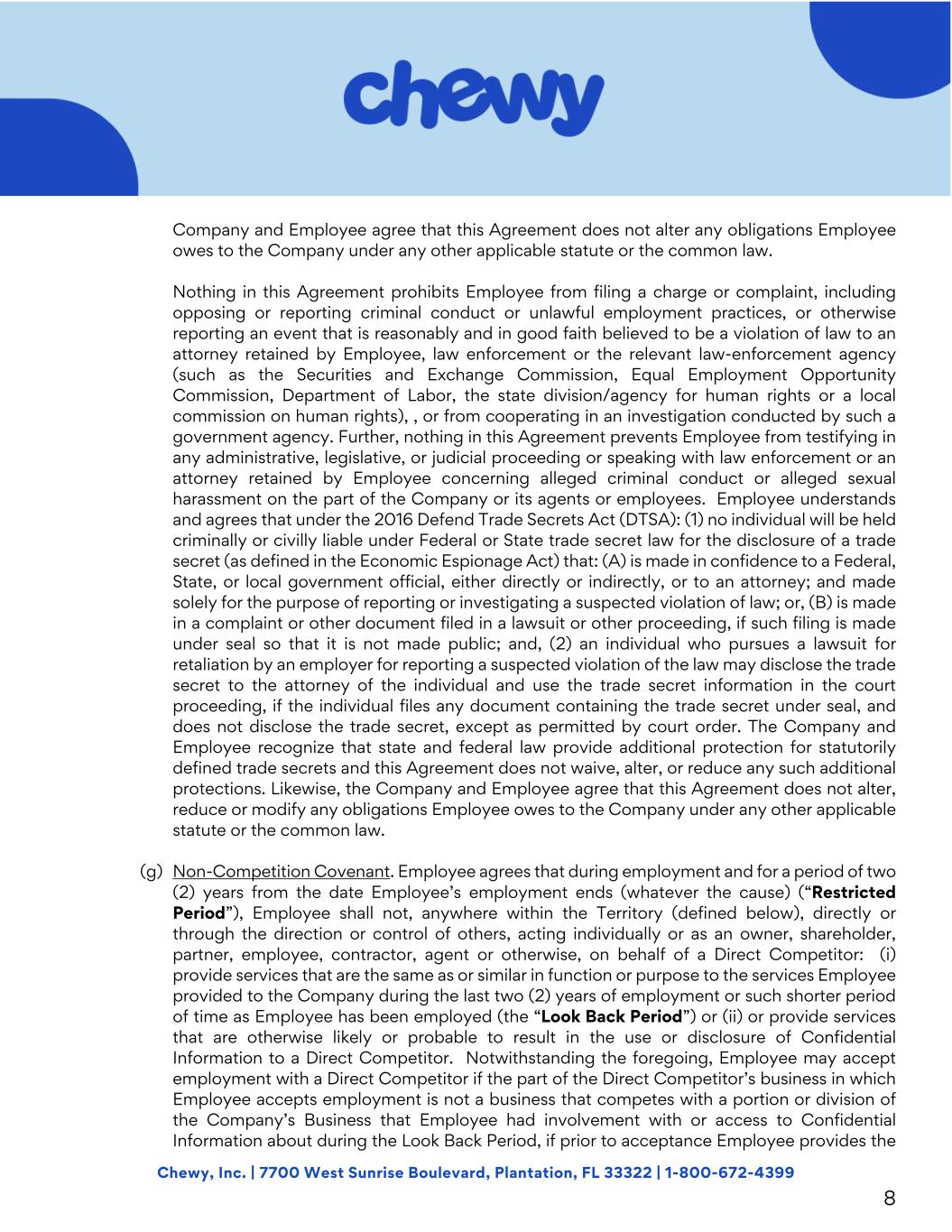 Chewy, Inc. | 7700 West Sunrise Boulevard, Plantation, FL 33322 | 1-800-672-4399 8 Company and Employee agree that this Agreement does not alter any obligations Employee owes to the Company under any other applicable statute or the common law. Nothing in this Agreement prohibits Employee from filing a charge or complaint, including opposing or reporting criminal conduct or unlawful employment practices, or otherwise reporting an event that is reasonably and in good faith believed to be a violation of law to an attorney retained by Employee, law enforcement or the relevant law-enforcement agency (such as the Securities and Exchange Commission, Equal Employment Opportunity Commission, Department of Labor, the state division/agency for human rights or a local commission on human rights), , or from cooperating in an investigation conducted by such a government agency. Further, nothing in this Agreement prevents Employee from testifying in any administrative, legislative, or judicial proceeding or speaking with law enforcement or an attorney retained by Employee concerning alleged criminal conduct or alleged sexual harassment on the part of the Company or its agents or employees. Employee understands and agrees that under the 2016 Defend Trade Secrets Act (DTSA): (1) no individual will be held criminally or civilly liable under Federal or State trade secret law for the disclosure of a trade secret (as defined in the Economic Espionage Act) that: (A) is made in confidence to a Federal, State, or local government official, either directly or indirectly, or to an attorney; and made solely for the purpose of reporting or investigating a suspected violation of law; or, (B) is made in a complaint or other document filed in a lawsuit or other proceeding, if such filing is made under seal so that it is not made public; and, (2) an individual who pursues a lawsuit for retaliation by an employer for reporting a suspected violation of the law may disclose the trade secret to the attorney of the individual and use the trade secret information in the court proceeding, if the individual files any document containing the trade secret under seal, and does not disclose the trade secret, except as permitted by court order. The Company and Employee recognize that state and federal law provide additional protection for statutorily defined trade secrets and this Agreement does not waive, alter, or reduce any such additional protections. Likewise, the Company and Employee agree that this Agreement does not alter, reduce or modify any obligations Employee owes to the Company under any other applicable statute or the common law. (g) Non-Competition Covenant. Employee agrees that during employment and for a period of two (2) years from the date Employee’s employment ends (whatever the cause) (“Restricted Period”), Employee shall not, anywhere within the Territory (defined below), directly or through the direction or control of others, acting individually or as an owner, shareholder, partner, employee, contractor, agent or otherwise, on behalf of a Direct Competitor: (i) provide services that are the same as or similar in function or purpose to the services Employee provided to the Company during the last two (2) years of employment or such shorter period of time as Employee has been employed (the “Look Back Period”) or (ii) or provide services that are otherwise likely or probable to result in the use or disclosure of Confidential Information to a Direct Competitor. Notwithstanding the foregoing, Employee may accept employment with a Direct Competitor if the part of the Direct Competitor’s business in which Employee accepts employment is not a business that competes with a portion or division of the Company’s Business that Employee had involvement with or access to Confidential Information about during the Look Back Period, if prior to acceptance Employee provides the