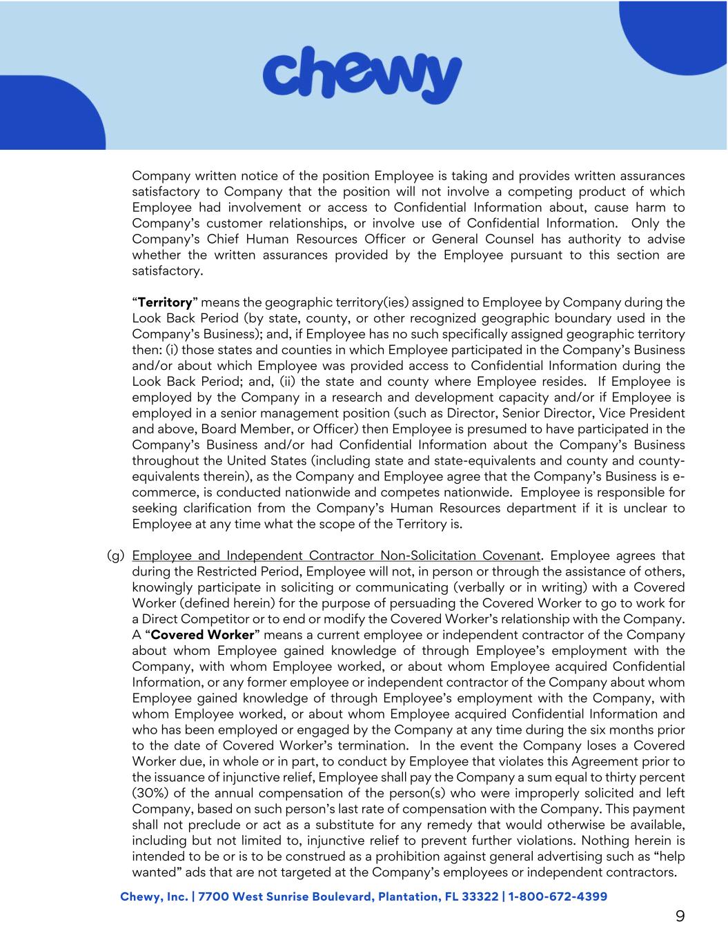 Chewy, Inc. | 7700 West Sunrise Boulevard, Plantation, FL 33322 | 1-800-672-4399 9 Company written notice of the position Employee is taking and provides written assurances satisfactory to Company that the position will not involve a competing product of which Employee had involvement or access to Confidential Information about, cause harm to Company’s customer relationships, or involve use of Confidential Information. Only the Company’s Chief Human Resources Officer or General Counsel has authority to advise whether the written assurances provided by the Employee pursuant to this section are satisfactory. “Territory” means the geographic territory(ies) assigned to Employee by Company during the Look Back Period (by state, county, or other recognized geographic boundary used in the Company’s Business); and, if Employee has no such specifically assigned geographic territory then: (i) those states and counties in which Employee participated in the Company’s Business and/or about which Employee was provided access to Confidential Information during the Look Back Period; and, (ii) the state and county where Employee resides. If Employee is employed by the Company in a research and development capacity and/or if Employee is employed in a senior management position (such as Director, Senior Director, Vice President and above, Board Member, or Officer) then Employee is presumed to have participated in the Company’s Business and/or had Confidential Information about the Company’s Business throughout the United States (including state and state-equivalents and county and county- equivalents therein), as the Company and Employee agree that the Company’s Business is e- commerce, is conducted nationwide and competes nationwide. Employee is responsible for seeking clarification from the Company’s Human Resources department if it is unclear to Employee at any time what the scope of the Territory is. (g) Employee and Independent Contractor Non-Solicitation Covenant. Employee agrees that during the Restricted Period, Employee will not, in person or through the assistance of others, knowingly participate in soliciting or communicating (verbally or in writing) with a Covered Worker (defined herein) for the purpose of persuading the Covered Worker to go to work for a Direct Competitor or to end or modify the Covered Worker’s relationship with the Company. A “Covered Worker” means a current employee or independent contractor of the Company about whom Employee gained knowledge of through Employee’s employment with the Company, with whom Employee worked, or about whom Employee acquired Confidential Information, or any former employee or independent contractor of the Company about whom Employee gained knowledge of through Employee’s employment with the Company, with whom Employee worked, or about whom Employee acquired Confidential Information and who has been employed or engaged by the Company at any time during the six months prior to the date of Covered Worker’s termination. In the event the Company loses a Covered Worker due, in whole or in part, to conduct by Employee that violates this Agreement prior to the issuance of injunctive relief, Employee shall pay the Company a sum equal to thirty percent (30%) of the annual compensation of the person(s) who were improperly solicited and left Company, based on such person’s last rate of compensation with the Company. This payment shall not preclude or act as a substitute for any remedy that would otherwise be available, including but not limited to, injunctive relief to prevent further violations. Nothing herein is intended to be or is to be construed as a prohibition against general advertising such as “help wanted” ads that are not targeted at the Company’s employees or independent contractors.