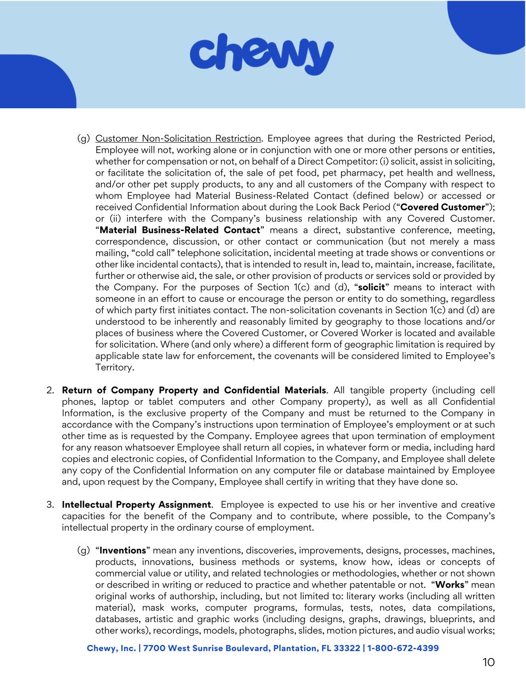 Chewy, Inc. | 7700 West Sunrise Boulevard, Plantation, FL 33322 | 1-800-672-4399 10 (g) Customer Non-Solicitation Restriction. Employee agrees that during the Restricted Period, Employee will not, working alone or in conjunction with one or more other persons or entities, whether for compensation or not, on behalf of a Direct Competitor: (i) solicit, assist in soliciting, or facilitate the solicitation of, the sale of pet food, pet pharmacy, pet health and wellness, and/or other pet supply products, to any and all customers of the Company with respect to whom Employee had Material Business-Related Contact (defined below) or accessed or received Confidential Information about during the Look Back Period (“Covered Customer”); or (ii) interfere with the Company’s business relationship with any Covered Customer. “Material Business-Related Contact” means a direct, substantive conference, meeting, correspondence, discussion, or other contact or communication (but not merely a mass mailing, “cold call” telephone solicitation, incidental meeting at trade shows or conventions or other like incidental contacts), that is intended to result in, lead to, maintain, increase, facilitate, further or otherwise aid, the sale, or other provision of products or services sold or provided by the Company. For the purposes of Section 1(c) and (d), “solicit” means to interact with someone in an effort to cause or encourage the person or entity to do something, regardless of which party first initiates contact. The non-solicitation covenants in Section 1(c) and (d) are understood to be inherently and reasonably limited by geography to those locations and/or places of business where the Covered Customer, or Covered Worker is located and available for solicitation. Where (and only where) a different form of geographic limitation is required by applicable state law for enforcement, the covenants will be considered limited to Employee’s Territory. 2. Return of Company Property and Confidential Materials. All tangible property (including cell phones, laptop or tablet computers and other Company property), as well as all Confidential Information, is the exclusive property of the Company and must be returned to the Company in accordance with the Company’s instructions upon termination of Employee’s employment or at such other time as is requested by the Company. Employee agrees that upon termination of employment for any reason whatsoever Employee shall return all copies, in whatever form or media, including hard copies and electronic copies, of Confidential Information to the Company, and Employee shall delete any copy of the Confidential Information on any computer file or database maintained by Employee and, upon request by the Company, Employee shall certify in writing that they have done so. 3. Intellectual Property Assignment. Employee is expected to use his or her inventive and creative capacities for the benefit of the Company and to contribute, where possible, to the Company’s intellectual property in the ordinary course of employment. (g) “Inventions” mean any inventions, discoveries, improvements, designs, processes, machines, products, innovations, business methods or systems, know how, ideas or concepts of commercial value or utility, and related technologies or methodologies, whether or not shown or described in writing or reduced to practice and whether patentable or not. “Works” mean original works of authorship, including, but not limited to: literary works (including all written material), mask works, computer programs, formulas, tests, notes, data compilations, databases, artistic and graphic works (including designs, graphs, drawings, blueprints, and other works), recordings, models, photographs, slides, motion pictures, and audio visual works;