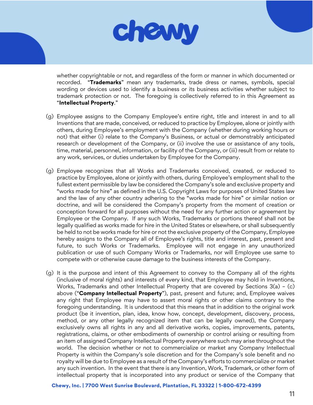 Chewy, Inc. | 7700 West Sunrise Boulevard, Plantation, FL 33322 | 1-800-672-4399 11 whether copyrightable or not, and regardless of the form or manner in which documented or recorded. “Trademarks” mean any trademarks, trade dress or names, symbols, special wording or devices used to identify a business or its business activities whether subject to trademark protection or not. The foregoing is collectively referred to in this Agreement as “Intellectual Property.” (g) Employee assigns to the Company Employee’s entire right, title and interest in and to all Inventions that are made, conceived, or reduced to practice by Employee, alone or jointly with others, during Employee’s employment with the Company (whether during working hours or not) that either (i) relate to the Company’s Business, or actual or demonstrably anticipated research or development of the Company, or (ii) involve the use or assistance of any tools, time, material, personnel, information, or facility of the Company, or (iii) result from or relate to any work, services, or duties undertaken by Employee for the Company. (g) Employee recognizes that all Works and Trademarks conceived, created, or reduced to practice by Employee, alone or jointly with others, during Employee’s employment shall to the fullest extent permissible by law be considered the Company’s sole and exclusive property and “works made for hire” as defined in the U.S. Copyright Laws for purposes of United States law and the law of any other country adhering to the “works made for hire” or similar notion or doctrine, and will be considered the Company’s property from the moment of creation or conception forward for all purposes without the need for any further action or agreement by Employee or the Company. If any such Works, Trademarks or portions thereof shall not be legally qualified as works made for hire in the United States or elsewhere, or shall subsequently be held to not be works made for hire or not the exclusive property of the Company, Employee hereby assigns to the Company all of Employee’s rights, title and interest, past, present and future, to such Works or Trademarks. Employee will not engage in any unauthorized publication or use of such Company Works or Trademarks, nor will Employee use same to compete with or otherwise cause damage to the business interests of the Company. (g) It is the purpose and intent of this Agreement to convey to the Company all of the rights (inclusive of moral rights) and interests of every kind, that Employee may hold in Inventions, Works, Trademarks and other Intellectual Property that are covered by Sections 3(a) – (c) above (“Company Intellectual Property”), past, present and future; and, Employee waives any right that Employee may have to assert moral rights or other claims contrary to the foregoing understanding. It is understood that this means that in addition to the original work product (be it invention, plan, idea, know how, concept, development, discovery, process, method, or any other legally recognized item that can be legally owned), the Company exclusively owns all rights in any and all derivative works, copies, improvements, patents, registrations, claims, or other embodiments of ownership or control arising or resulting from an item of assigned Company Intellectual Property everywhere such may arise throughout the world. The decision whether or not to commercialize or market any Company Intellectual Property is within the Company’s sole discretion and for the Company’s sole benefit and no royalty will be due to Employee as a result of the Company’s efforts to commercialize or market any such invention. In the event that there is any Invention, Work, Trademark, or other form of intellectual property that is incorporated into any product or service of the Company that