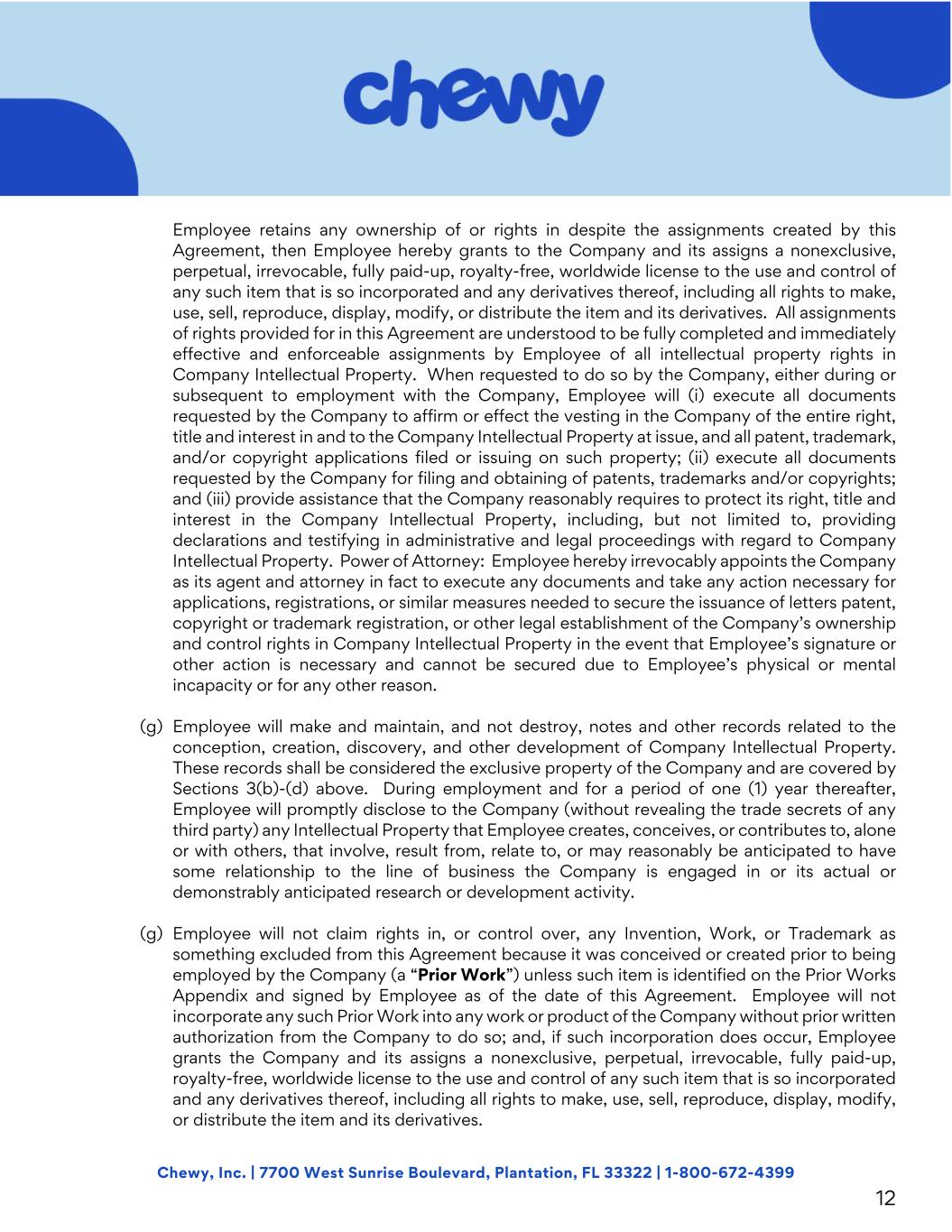 Chewy, Inc. | 7700 West Sunrise Boulevard, Plantation, FL 33322 | 1-800-672-4399 12 Employee retains any ownership of or rights in despite the assignments created by this Agreement, then Employee hereby grants to the Company and its assigns a nonexclusive, perpetual, irrevocable, fully paid-up, royalty-free, worldwide license to the use and control of any such item that is so incorporated and any derivatives thereof, including all rights to make, use, sell, reproduce, display, modify, or distribute the item and its derivatives. All assignments of rights provided for in this Agreement are understood to be fully completed and immediately effective and enforceable assignments by Employee of all intellectual property rights in Company Intellectual Property. When requested to do so by the Company, either during or subsequent to employment with the Company, Employee will (i) execute all documents requested by the Company to affirm or effect the vesting in the Company of the entire right, title and interest in and to the Company Intellectual Property at issue, and all patent, trademark, and/or copyright applications filed or issuing on such property; (ii) execute all documents requested by the Company for filing and obtaining of patents, trademarks and/or copyrights; and (iii) provide assistance that the Company reasonably requires to protect its right, title and interest in the Company Intellectual Property, including, but not limited to, providing declarations and testifying in administrative and legal proceedings with regard to Company Intellectual Property. Power of Attorney: Employee hereby irrevocably appoints the Company as its agent and attorney in fact to execute any documents and take any action necessary for applications, registrations, or similar measures needed to secure the issuance of letters patent, copyright or trademark registration, or other legal establishment of the Company’s ownership and control rights in Company Intellectual Property in the event that Employee’s signature or other action is necessary and cannot be secured due to Employee’s physical or mental incapacity or for any other reason. (g) Employee will make and maintain, and not destroy, notes and other records related to the conception, creation, discovery, and other development of Company Intellectual Property. These records shall be considered the exclusive property of the Company and are covered by Sections 3(b)-(d) above. During employment and for a period of one (1) year thereafter, Employee will promptly disclose to the Company (without revealing the trade secrets of any third party) any Intellectual Property that Employee creates, conceives, or contributes to, alone or with others, that involve, result from, relate to, or may reasonably be anticipated to have some relationship to the line of business the Company is engaged in or its actual or demonstrably anticipated research or development activity. (g) Employee will not claim rights in, or control over, any Invention, Work, or Trademark as something excluded from this Agreement because it was conceived or created prior to being employed by the Company (a “Prior Work”) unless such item is identified on the Prior Works Appendix and signed by Employee as of the date of this Agreement. Employee will not incorporate any such Prior Work into any work or product of the Company without prior written authorization from the Company to do so; and, if such incorporation does occur, Employee grants the Company and its assigns a nonexclusive, perpetual, irrevocable, fully paid-up, royalty-free, worldwide license to the use and control of any such item that is so incorporated and any derivatives thereof, including all rights to make, use, sell, reproduce, display, modify, or distribute the item and its derivatives.