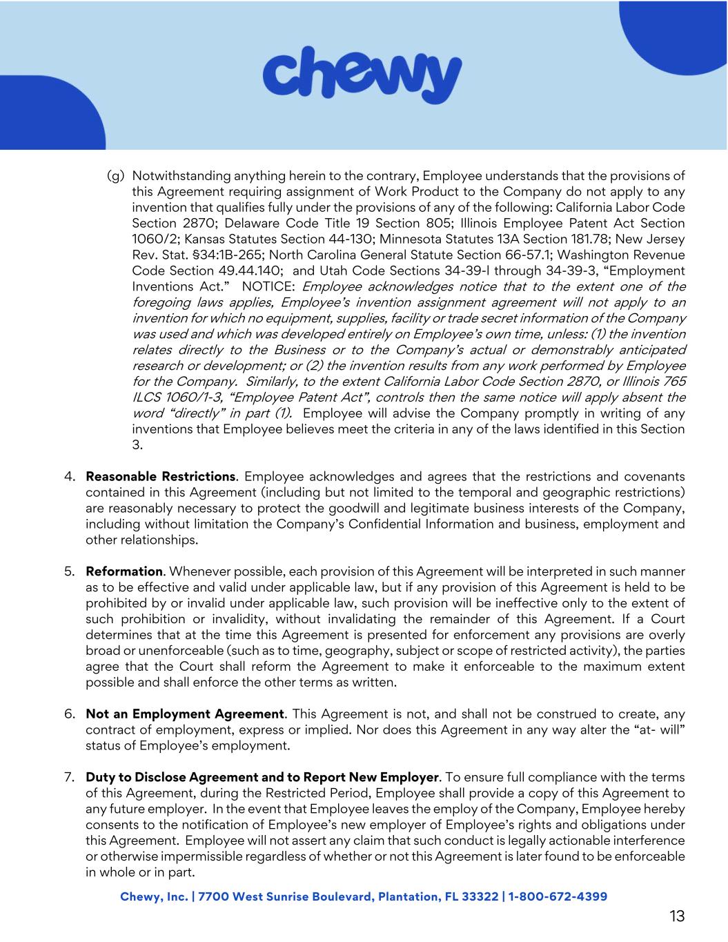 Chewy, Inc. | 7700 West Sunrise Boulevard, Plantation, FL 33322 | 1-800-672-4399 13 (g) Notwithstanding anything herein to the contrary, Employee understands that the provisions of this Agreement requiring assignment of Work Product to the Company do not apply to any invention that qualifies fully under the provisions of any of the following: California Labor Code Section 2870; Delaware Code Title 19 Section 805; Illinois Employee Patent Act Section 1060/2; Kansas Statutes Section 44-130; Minnesota Statutes 13A Section 181.78; New Jersey Rev. Stat. §34:1B-265; North Carolina General Statute Section 66-57.1; Washington Revenue Code Section 49.44.140; and Utah Code Sections 34-39-l through 34-39-3, “Employment Inventions Act.” NOTICE: Employee acknowledges notice that to the extent one of the foregoing laws applies, Employee’s invention assignment agreement will not apply to an invention for which no equipment, supplies, facility or trade secret information of the Company was used and which was developed entirely on Employee’s own time, unless: (1) the invention relates directly to the Business or to the Company’s actual or demonstrably anticipated research or development; or (2) the invention results from any work performed by Employee for the Company. Similarly, to the extent California Labor Code Section 2870, or Illinois 765 ILCS 1060/1-3, “Employee Patent Act”, controls then the same notice will apply absent the word “directly” in part (1). Employee will advise the Company promptly in writing of any inventions that Employee believes meet the criteria in any of the laws identified in this Section 3. 4. Reasonable Restrictions. Employee acknowledges and agrees that the restrictions and covenants contained in this Agreement (including but not limited to the temporal and geographic restrictions) are reasonably necessary to protect the goodwill and legitimate business interests of the Company, including without limitation the Company’s Confidential Information and business, employment and other relationships. 5. Reformation. Whenever possible, each provision of this Agreement will be interpreted in such manner as to be effective and valid under applicable law, but if any provision of this Agreement is held to be prohibited by or invalid under applicable law, such provision will be ineffective only to the extent of such prohibition or invalidity, without invalidating the remainder of this Agreement. If a Court determines that at the time this Agreement is presented for enforcement any provisions are overly broad or unenforceable (such as to time, geography, subject or scope of restricted activity), the parties agree that the Court shall reform the Agreement to make it enforceable to the maximum extent possible and shall enforce the other terms as written. 6. Not an Employment Agreement. This Agreement is not, and shall not be construed to create, any contract of employment, express or implied. Nor does this Agreement in any way alter the “at- will” status of Employee’s employment. 7. Duty to Disclose Agreement and to Report New Employer. To ensure full compliance with the terms of this Agreement, during the Restricted Period, Employee shall provide a copy of this Agreement to any future employer. In the event that Employee leaves the employ of the Company, Employee hereby consents to the notification of Employee’s new employer of Employee’s rights and obligations under this Agreement. Employee will not assert any claim that such conduct is legally actionable interference or otherwise impermissible regardless of whether or not this Agreement is later found to be enforceable in whole or in part.