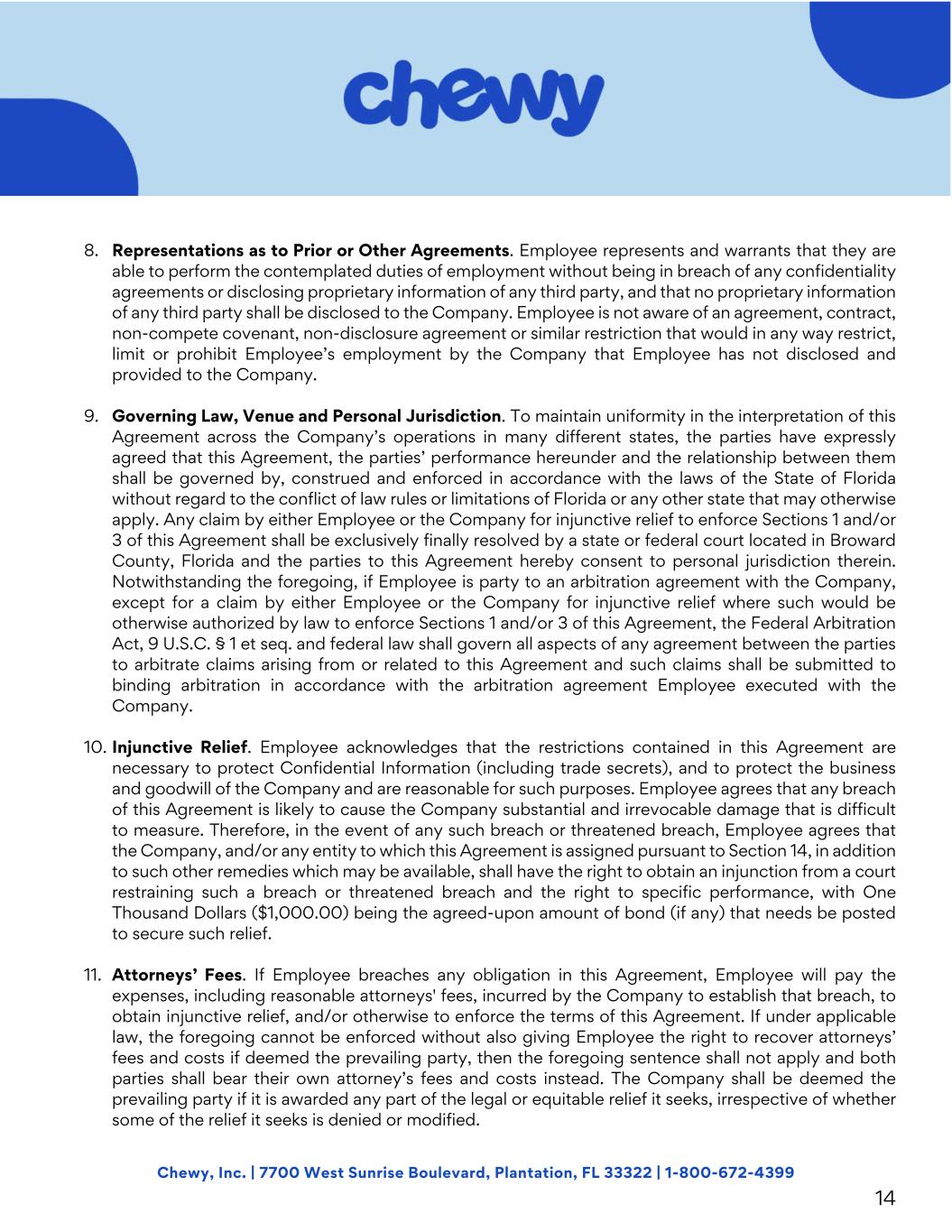 Chewy, Inc. | 7700 West Sunrise Boulevard, Plantation, FL 33322 | 1-800-672-4399 14 8. Representations as to Prior or Other Agreements. Employee represents and warrants that they are able to perform the contemplated duties of employment without being in breach of any confidentiality agreements or disclosing proprietary information of any third party, and that no proprietary information of any third party shall be disclosed to the Company. Employee is not aware of an agreement, contract, non-compete covenant, non-disclosure agreement or similar restriction that would in any way restrict, limit or prohibit Employee’s employment by the Company that Employee has not disclosed and provided to the Company. 9. Governing Law, Venue and Personal Jurisdiction. To maintain uniformity in the interpretation of this Agreement across the Company’s operations in many different states, the parties have expressly agreed that this Agreement, the parties’ performance hereunder and the relationship between them shall be governed by, construed and enforced in accordance with the laws of the State of Florida without regard to the conflict of law rules or limitations of Florida or any other state that may otherwise apply. Any claim by either Employee or the Company for injunctive relief to enforce Sections 1 and/or 3 of this Agreement shall be exclusively finally resolved by a state or federal court located in Broward County, Florida and the parties to this Agreement hereby consent to personal jurisdiction therein. Notwithstanding the foregoing, if Employee is party to an arbitration agreement with the Company, except for a claim by either Employee or the Company for injunctive relief where such would be otherwise authorized by law to enforce Sections 1 and/or 3 of this Agreement, the Federal Arbitration Act, 9 U.S.C. § 1 et seq. and federal law shall govern all aspects of any agreement between the parties to arbitrate claims arising from or related to this Agreement and such claims shall be submitted to binding arbitration in accordance with the arbitration agreement Employee executed with the Company. 10. Injunctive Relief. Employee acknowledges that the restrictions contained in this Agreement are necessary to protect Confidential Information (including trade secrets), and to protect the business and goodwill of the Company and are reasonable for such purposes. Employee agrees that any breach of this Agreement is likely to cause the Company substantial and irrevocable damage that is difficult to measure. Therefore, in the event of any such breach or threatened breach, Employee agrees that the Company, and/or any entity to which this Agreement is assigned pursuant to Section 14, in addition to such other remedies which may be available, shall have the right to obtain an injunction from a court restraining such a breach or threatened breach and the right to specific performance, with One Thousand Dollars ($1,000.00) being the agreed-upon amount of bond (if any) that needs be posted to secure such relief. 11. Attorneys’ Fees. If Employee breaches any obligation in this Agreement, Employee will pay the expenses, including reasonable attorneys' fees, incurred by the Company to establish that breach, to obtain injunctive relief, and/or otherwise to enforce the terms of this Agreement. If under applicable law, the foregoing cannot be enforced without also giving Employee the right to recover attorneys’ fees and costs if deemed the prevailing party, then the foregoing sentence shall not apply and both parties shall bear their own attorney’s fees and costs instead. The Company shall be deemed the prevailing party if it is awarded any part of the legal or equitable relief it seeks, irrespective of whether some of the relief it seeks is denied or modified.