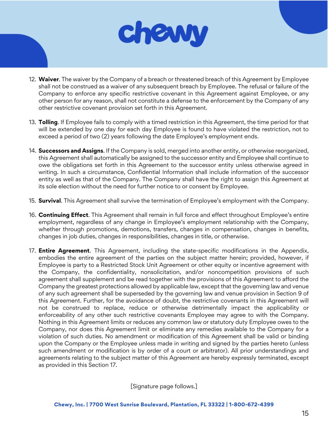Chewy, Inc. | 7700 West Sunrise Boulevard, Plantation, FL 33322 | 1-800-672-4399 15 12. Waiver. The waiver by the Company of a breach or threatened breach of this Agreement by Employee shall not be construed as a waiver of any subsequent breach by Employee. The refusal or failure of the Company to enforce any specific restrictive covenant in this Agreement against Employee, or any other person for any reason, shall not constitute a defense to the enforcement by the Company of any other restrictive covenant provision set forth in this Agreement. 13. Tolling. If Employee fails to comply with a timed restriction in this Agreement, the time period for that will be extended by one day for each day Employee is found to have violated the restriction, not to exceed a period of two (2) years following the date Employee’s employment ends. 14. Successors and Assigns. If the Company is sold, merged into another entity, or otherwise reorganized, this Agreement shall automatically be assigned to the successor entity and Employee shall continue to owe the obligations set forth in this Agreement to the successor entity unless otherwise agreed in writing. In such a circumstance, Confidential Information shall include information of the successor entity as well as that of the Company. The Company shall have the right to assign this Agreement at its sole election without the need for further notice to or consent by Employee. 15. Survival. This Agreement shall survive the termination of Employee’s employment with the Company. 16. Continuing Effect. This Agreement shall remain in full force and effect throughout Employee’s entire employment, regardless of any change in Employee’s employment relationship with the Company, whether through promotions, demotions, transfers, changes in compensation, changes in benefits, changes in job duties, changes in responsibilities, changes in title, or otherwise. 17. Entire Agreement. This Agreement, including the state-specific modifications in the Appendix, embodies the entire agreement of the parties on the subject matter herein; provided, however, if Employee is party to a Restricted Stock Unit Agreement or other equity or incentive agreement with the Company, the confidentiality, nonsolicitation, and/or noncompetition provisions of such agreement shall supplement and be read together with the provisions of this Agreement to afford the Company the greatest protections allowed by applicable law, except that the governing law and venue of any such agreement shall be superseded by the governing law and venue provision in Section 9 of this Agreement. Further, for the avoidance of doubt, the restrictive covenants in this Agreement will not be construed to replace, reduce or otherwise detrimentally impact the applicability or enforceability of any other such restrictive covenants Employee may agree to with the Company. Nothing in this Agreement limits or reduces any common law or statutory duty Employee owes to the Company, nor does this Agreement limit or eliminate any remedies available to the Company for a violation of such duties. No amendment or modification of this Agreement shall be valid or binding upon the Company or the Employee unless made in writing and signed by the parties hereto (unless such amendment or modification is by order of a court or arbitrator). All prior understandings and agreements relating to the subject matter of this Agreement are hereby expressly terminated, except as provided in this Section 17. [Signature page follows.]