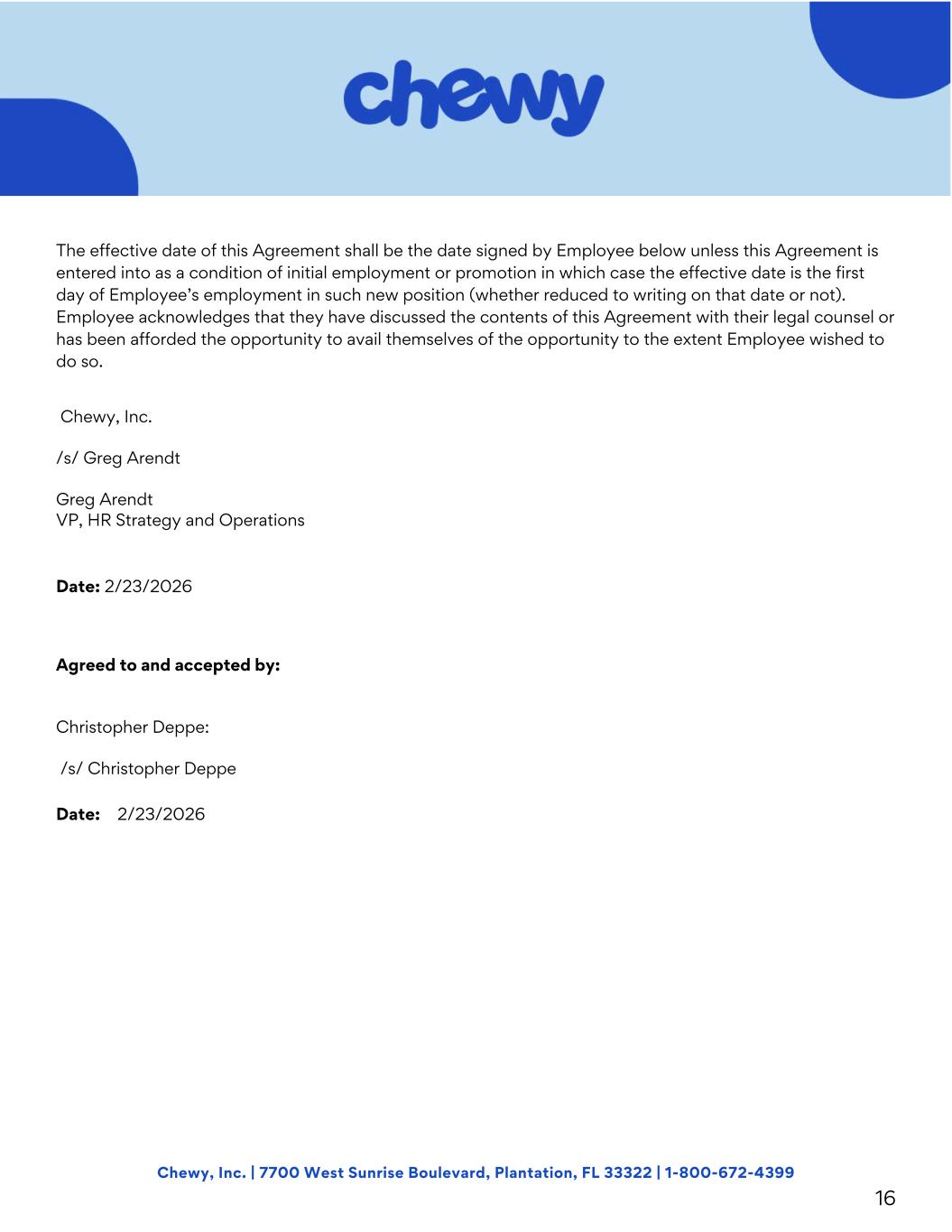 16 The effective date of this Agreement shall be the date signed by Employee below unless this Agreement is entered into as a condition of initial employment or promotion in which case the effective date is the first day of Employee’s employment in such new position (whether reduced to writing on that date or not). Employee acknowledges that they have discussed the contents of this Agreement with their legal counsel or has been afforded the opportunity to avail themselves of the opportunity to the extent Employee wished to do so. Chewy, Inc. /s/ Greg Arendt Greg Arendt VP, HR Strategy and Operations Date: 2/23/2026 Agreed to and accepted by: Christopher Deppe: /s/ Christopher Deppe Date: 2/23/2026 Chewy, Inc. | 7700 West Sunrise Boulevard, Plantation, FL 33322 | 1-800-672-4399
