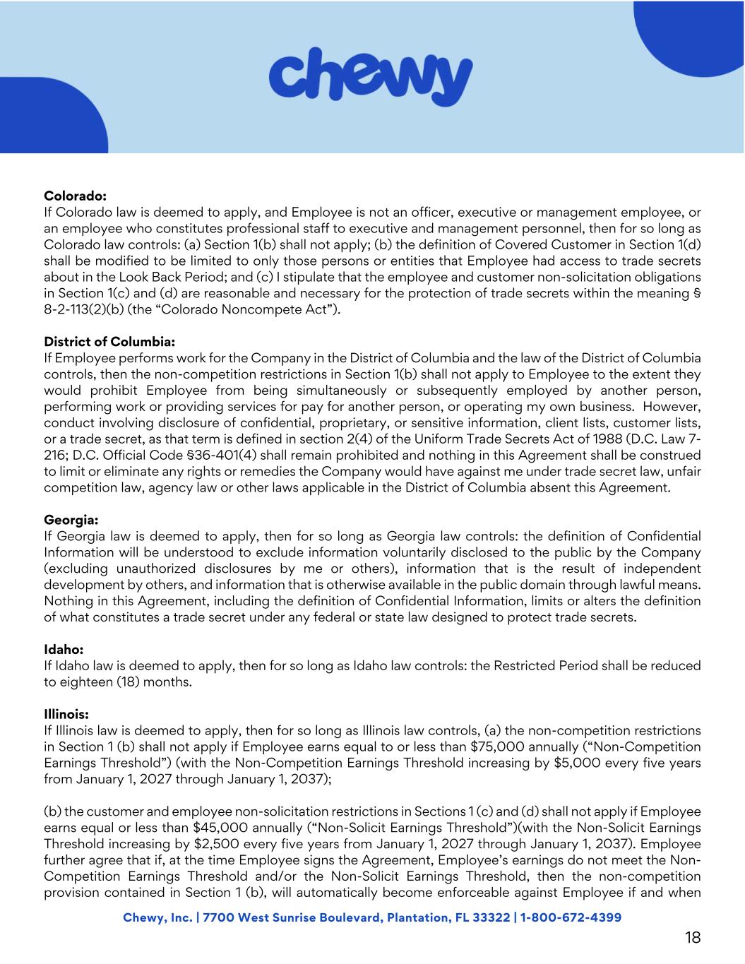 Chewy, Inc. | 7700 West Sunrise Boulevard, Plantation, FL 33322 | 1-800-672-4399 18 Colorado: If Colorado law is deemed to apply, and Employee is not an officer, executive or management employee, or an employee who constitutes professional staff to executive and management personnel, then for so long as Colorado law controls: (a) Section 1(b) shall not apply; (b) the definition of Covered Customer in Section 1(d) shall be modified to be limited to only those persons or entities that Employee had access to trade secrets about in the Look Back Period; and (c) I stipulate that the employee and customer non-solicitation obligations in Section 1(c) and (d) are reasonable and necessary for the protection of trade secrets within the meaning § 8-2-113(2)(b) (the “Colorado Noncompete Act”). District of Columbia: If Employee performs work for the Company in the District of Columbia and the law of the District of Columbia controls, then the non-competition restrictions in Section 1(b) shall not apply to Employee to the extent they would prohibit Employee from being simultaneously or subsequently employed by another person, performing work or providing services for pay for another person, or operating my own business. However, conduct involving disclosure of confidential, proprietary, or sensitive information, client lists, customer lists, or a trade secret, as that term is defined in section 2(4) of the Uniform Trade Secrets Act of 1988 (D.C. Law 7- 216; D.C. Official Code §36-401(4) shall remain prohibited and nothing in this Agreement shall be construed to limit or eliminate any rights or remedies the Company would have against me under trade secret law, unfair competition law, agency law or other laws applicable in the District of Columbia absent this Agreement. Georgia: If Georgia law is deemed to apply, then for so long as Georgia law controls: the definition of Confidential Information will be understood to exclude information voluntarily disclosed to the public by the Company (excluding unauthorized disclosures by me or others), information that is the result of independent development by others, and information that is otherwise available in the public domain through lawful means. Nothing in this Agreement, including the definition of Confidential Information, limits or alters the definition of what constitutes a trade secret under any federal or state law designed to protect trade secrets. Idaho: If Idaho law is deemed to apply, then for so long as Idaho law controls: the Restricted Period shall be reduced to eighteen (18) months. Illinois: If Illinois law is deemed to apply, then for so long as Illinois law controls, (a) the non-competition restrictions in Section 1 (b) shall not apply if Employee earns equal to or less than $75,000 annually (“Non-Competition Earnings Threshold”) (with the Non-Competition Earnings Threshold increasing by $5,000 every five years from January 1, 2027 through January 1, 2037); (b) the customer and employee non-solicitation restrictions in Sections 1 (c) and (d) shall not apply if Employee earns equal or less than $45,000 annually (“Non-Solicit Earnings Threshold”)(with the Non-Solicit Earnings Threshold increasing by $2,500 every five years from January 1, 2027 through January 1, 2037). Employee further agree that if, at the time Employee signs the Agreement, Employee’s earnings do not meet the Non- Competition Earnings Threshold and/or the Non-Solicit Earnings Threshold, then the non-competition provision contained in Section 1 (b), will automatically become enforceable against Employee if and when