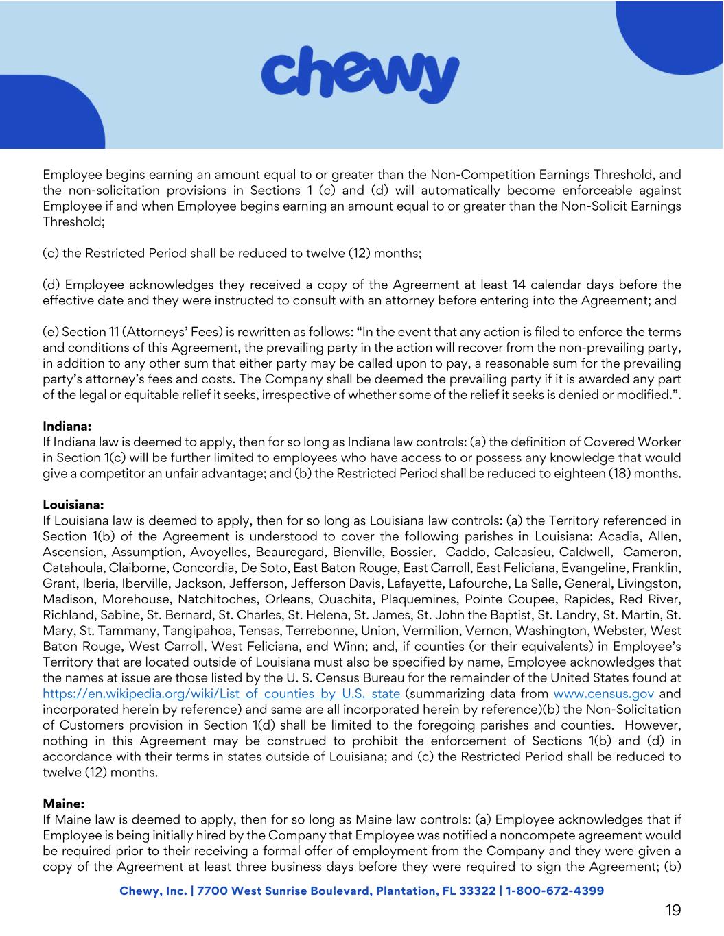 Chewy, Inc. | 7700 West Sunrise Boulevard, Plantation, FL 33322 | 1-800-672-4399 19 Employee begins earning an amount equal to or greater than the Non-Competition Earnings Threshold, and the non-solicitation provisions in Sections 1 (c) and (d) will automatically become enforceable against Employee if and when Employee begins earning an amount equal to or greater than the Non-Solicit Earnings Threshold; (c) the Restricted Period shall be reduced to twelve (12) months; (d) Employee acknowledges they received a copy of the Agreement at least 14 calendar days before the effective date and they were instructed to consult with an attorney before entering into the Agreement; and (e) Section 11 (Attorneys’ Fees) is rewritten as follows: “In the event that any action is filed to enforce the terms and conditions of this Agreement, the prevailing party in the action will recover from the non-prevailing party, in addition to any other sum that either party may be called upon to pay, a reasonable sum for the prevailing party’s attorney’s fees and costs. The Company shall be deemed the prevailing party if it is awarded any part of the legal or equitable relief it seeks, irrespective of whether some of the relief it seeks is denied or modified.”. Indiana: If Indiana law is deemed to apply, then for so long as Indiana law controls: (a) the definition of Covered Worker in Section 1(c) will be further limited to employees who have access to or possess any knowledge that would give a competitor an unfair advantage; and (b) the Restricted Period shall be reduced to eighteen (18) months. Louisiana: If Louisiana law is deemed to apply, then for so long as Louisiana law controls: (a) the Territory referenced in Section 1(b) of the Agreement is understood to cover the following parishes in Louisiana: Acadia, Allen, Ascension, Assumption, Avoyelles, Beauregard, Bienville, Bossier, Caddo, Calcasieu, Caldwell, Cameron, Catahoula, Claiborne, Concordia, De Soto, East Baton Rouge, East Carroll, East Feliciana, Evangeline, Franklin, Grant, Iberia, Iberville, Jackson, Jefferson, Jefferson Davis, Lafayette, Lafourche, La Salle, General, Livingston, Madison, Morehouse, Natchitoches, Orleans, Ouachita, Plaquemines, Pointe Coupee, Rapides, Red River, Richland, Sabine, St. Bernard, St. Charles, St. Helena, St. James, St. John the Baptist, St. Landry, St. Martin, St. Mary, St. Tammany, Tangipahoa, Tensas, Terrebonne, Union, Vermilion, Vernon, Washington, Webster, West Baton Rouge, West Carroll, West Feliciana, and Winn; and, if counties (or their equivalents) in Employee’s Territory that are located outside of Louisiana must also be specified by name, Employee acknowledges that the names at issue are those listed by the U. S. Census Bureau for the remainder of the United States found at https://en.wikipedia.org/wiki/List of counties by U.S. state (summarizing data from www.census.gov and incorporated herein by reference) and same are all incorporated herein by reference)(b) the Non-Solicitation of Customers provision in Section 1(d) shall be limited to the foregoing parishes and counties. However, nothing in this Agreement may be construed to prohibit the enforcement of Sections 1(b) and (d) in accordance with their terms in states outside of Louisiana; and (c) the Restricted Period shall be reduced to twelve (12) months. Maine: If Maine law is deemed to apply, then for so long as Maine law controls: (a) Employee acknowledges that if Employee is being initially hired by the Company that Employee was notified a noncompete agreement would be required prior to their receiving a formal offer of employment from the Company and they were given a copy of the Agreement at least three business days before they were required to sign the Agreement; (b)