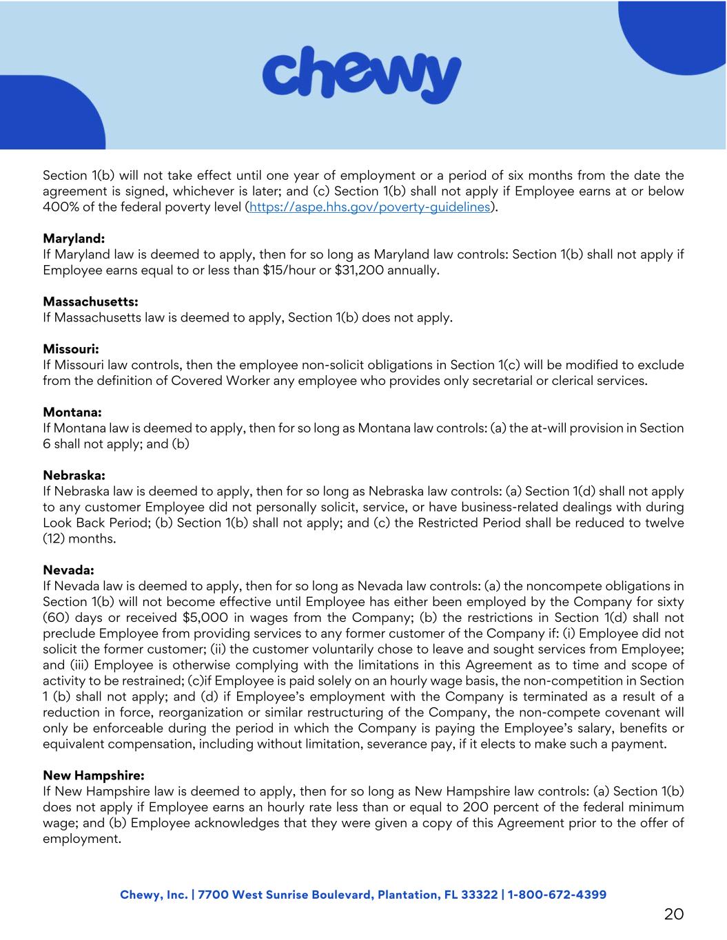 Chewy, Inc. | 7700 West Sunrise Boulevard, Plantation, FL 33322 | 1-800-672-4399 20 Section 1(b) will not take effect until one year of employment or a period of six months from the date the agreement is signed, whichever is later; and (c) Section 1(b) shall not apply if Employee earns at or below 400% of the federal poverty level (https://aspe.hhs.gov/poverty-guidelines). Maryland: If Maryland law is deemed to apply, then for so long as Maryland law controls: Section 1(b) shall not apply if Employee earns equal to or less than $15/hour or $31,200 annually. Massachusetts: If Massachusetts law is deemed to apply, Section 1(b) does not apply. Missouri: If Missouri law controls, then the employee non-solicit obligations in Section 1(c) will be modified to exclude from the definition of Covered Worker any employee who provides only secretarial or clerical services. Montana: If Montana law is deemed to apply, then for so long as Montana law controls: (a) the at-will provision in Section 6 shall not apply; and (b) Nebraska: If Nebraska law is deemed to apply, then for so long as Nebraska law controls: (a) Section 1(d) shall not apply to any customer Employee did not personally solicit, service, or have business-related dealings with during Look Back Period; (b) Section 1(b) shall not apply; and (c) the Restricted Period shall be reduced to twelve (12) months. Nevada: If Nevada law is deemed to apply, then for so long as Nevada law controls: (a) the noncompete obligations in Section 1(b) will not become effective until Employee has either been employed by the Company for sixty (60) days or received $5,000 in wages from the Company; (b) the restrictions in Section 1(d) shall not preclude Employee from providing services to any former customer of the Company if: (i) Employee did not solicit the former customer; (ii) the customer voluntarily chose to leave and sought services from Employee; and (iii) Employee is otherwise complying with the limitations in this Agreement as to time and scope of activity to be restrained; (c)if Employee is paid solely on an hourly wage basis, the non-competition in Section 1 (b) shall not apply; and (d) if Employee’s employment with the Company is terminated as a result of a reduction in force, reorganization or similar restructuring of the Company, the non-compete covenant will only be enforceable during the period in which the Company is paying the Employee’s salary, benefits or equivalent compensation, including without limitation, severance pay, if it elects to make such a payment. New Hampshire: If New Hampshire law is deemed to apply, then for so long as New Hampshire law controls: (a) Section 1(b) does not apply if Employee earns an hourly rate less than or equal to 200 percent of the federal minimum wage; and (b) Employee acknowledges that they were given a copy of this Agreement prior to the offer of employment.