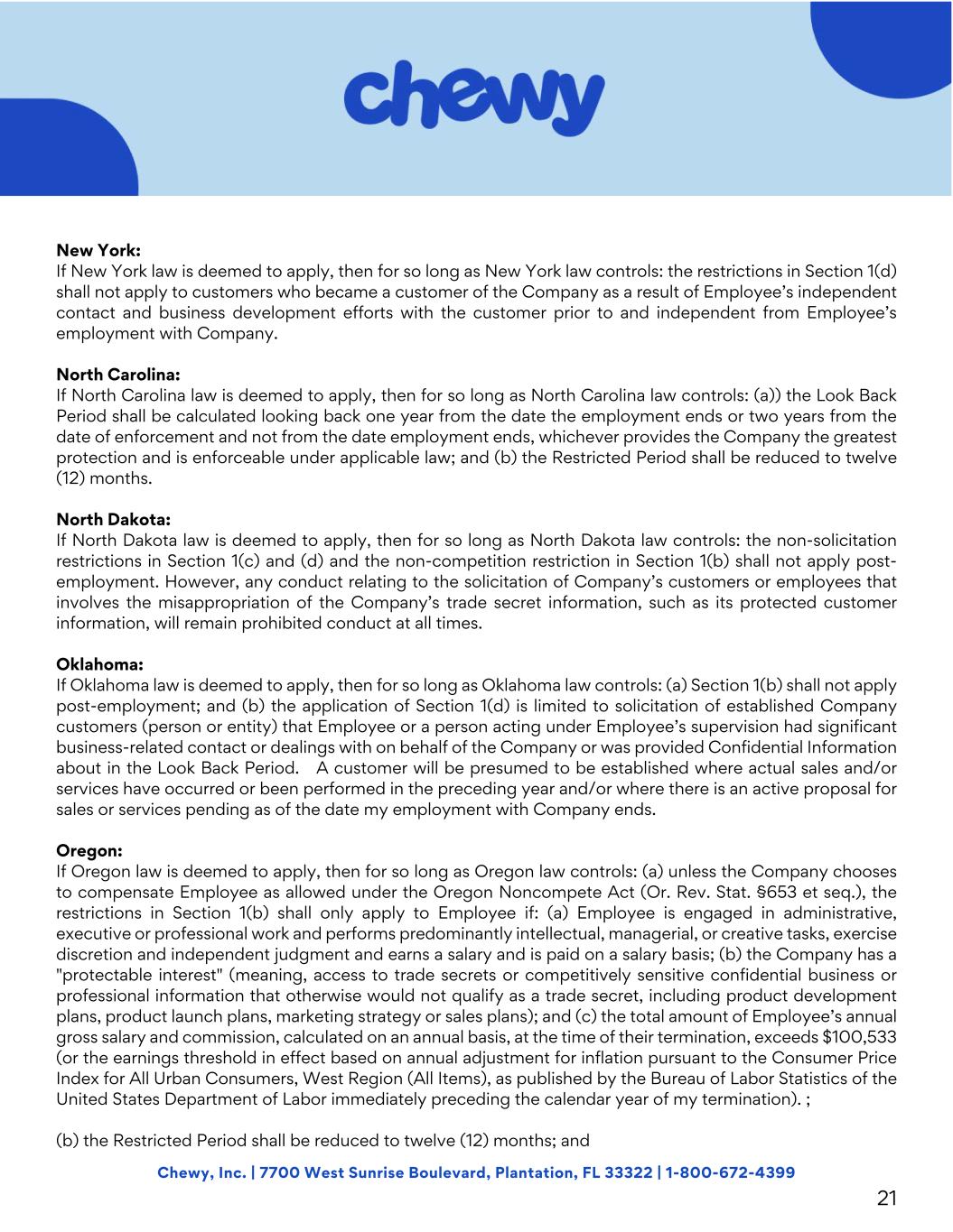 Chewy, Inc. | 7700 West Sunrise Boulevard, Plantation, FL 33322 | 1-800-672-4399 21 New York: If New York law is deemed to apply, then for so long as New York law controls: the restrictions in Section 1(d) shall not apply to customers who became a customer of the Company as a result of Employee’s independent contact and business development efforts with the customer prior to and independent from Employee’s employment with Company. North Carolina: If North Carolina law is deemed to apply, then for so long as North Carolina law controls: (a)) the Look Back Period shall be calculated looking back one year from the date the employment ends or two years from the date of enforcement and not from the date employment ends, whichever provides the Company the greatest protection and is enforceable under applicable law; and (b) the Restricted Period shall be reduced to twelve (12) months. North Dakota: If North Dakota law is deemed to apply, then for so long as North Dakota law controls: the non-solicitation restrictions in Section 1(c) and (d) and the non-competition restriction in Section 1(b) shall not apply post- employment. However, any conduct relating to the solicitation of Company’s customers or employees that involves the misappropriation of the Company’s trade secret information, such as its protected customer information, will remain prohibited conduct at all times. Oklahoma: If Oklahoma law is deemed to apply, then for so long as Oklahoma law controls: (a) Section 1(b) shall not apply post-employment; and (b) the application of Section 1(d) is limited to solicitation of established Company customers (person or entity) that Employee or a person acting under Employee’s supervision had significant business-related contact or dealings with on behalf of the Company or was provided Confidential Information about in the Look Back Period. A customer will be presumed to be established where actual sales and/or services have occurred or been performed in the preceding year and/or where there is an active proposal for sales or services pending as of the date my employment with Company ends. Oregon: If Oregon law is deemed to apply, then for so long as Oregon law controls: (a) unless the Company chooses to compensate Employee as allowed under the Oregon Noncompete Act (Or. Rev. Stat. §653 et seq.), the restrictions in Section 1(b) shall only apply to Employee if: (a) Employee is engaged in administrative, executive or professional work and performs predominantly intellectual, managerial, or creative tasks, exercise discretion and independent judgment and earns a salary and is paid on a salary basis; (b) the Company has a "protectable interest" (meaning, access to trade secrets or competitively sensitive confidential business or professional information that otherwise would not qualify as a trade secret, including product development plans, product launch plans, marketing strategy or sales plans); and (c) the total amount of Employee’s annual gross salary and commission, calculated on an annual basis, at the time of their termination, exceeds $100,533 (or the earnings threshold in effect based on annual adjustment for inflation pursuant to the Consumer Price Index for All Urban Consumers, West Region (All Items), as published by the Bureau of Labor Statistics of the United States Department of Labor immediately preceding the calendar year of my termination). ; (b) the Restricted Period shall be reduced to twelve (12) months; and