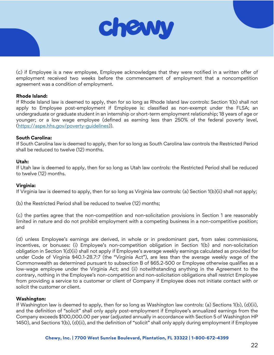 Chewy, Inc. | 7700 West Sunrise Boulevard, Plantation, FL 33322 | 1-800-672-4399 22 (c) if Employee is a new employee, Employee acknowledges that they were notified in a written offer of employment received two weeks before the commencement of employment that a noncompetition agreement was a condition of employment. Rhode Island: If Rhode Island law is deemed to apply, then for so long as Rhode Island law controls: Section 1(b) shall not apply to Employee post-employment if Employee is: classified as non-exempt under the FLSA; an undergraduate or graduate student in an internship or short-term employment relationship; 18 years of age or younger; or a low wage employee (defined as earning less than 250% of the federal poverty level, (https://aspe.hhs.gov/poverty-guidelines)). South Carolina: If South Carolina law is deemed to apply, then for so long as South Carolina law controls the Restricted Period shall be reduced to twelve (12) months. Utah: If Utah law is deemed to apply, then for so long as Utah law controls: the Restricted Period shall be reduced to twelve (12) months. Virginia: If Virginia law is deemed to apply, then for so long as Virginia law controls: (a) Section 1(b)(ii) shall not apply; (b) the Restricted Period shall be reduced to twelve (12) months; (c) the parties agree that the non-competition and non-solicitation provisions in Section 1 are reasonably limited in nature and do not prohibit employment with a competing business in a non-competitive position; and (d) unless Employee’s earnings are derived, in whole or in predominant part, from sales commissions, incentives, or bonuses: (i) Employee’s non-competition obligation in Section 1(b) and non-solicitation obligation in Section 1(d)(ii) shall not apply if Employee’s average weekly earnings calculated as provided for under Code of Virginia §40.1-28.7:7 (the “Virginia Act”), are less than the average weekly wage of the Commonwealth as determined pursuant to subsection B of §65.2-500 or Employee otherwise qualifies as a low-wage employee under the Virginia Act; and (ii) notwithstanding anything in the Agreement to the contrary, nothing in the Employee’s non-competition and non-solicitation obligations shall restrict Employee from providing a service to a customer or client of Company if Employee does not initiate contact with or solicit the customer or client. Washington: If Washington law is deemed to apply, then for so long as Washington law controls: (a) Sections 1(b), (d)(ii), and the definition of “solicit” shall only apply post-employment if Employee’s annualized earnings from the Company exceeds $100,000.00 per year (adjusted annually in accordance with Section 5 of Washington HP 1450), and Sections 1(b), (d)(ii), and the definition of “solicit” shall only apply during employment if Employee