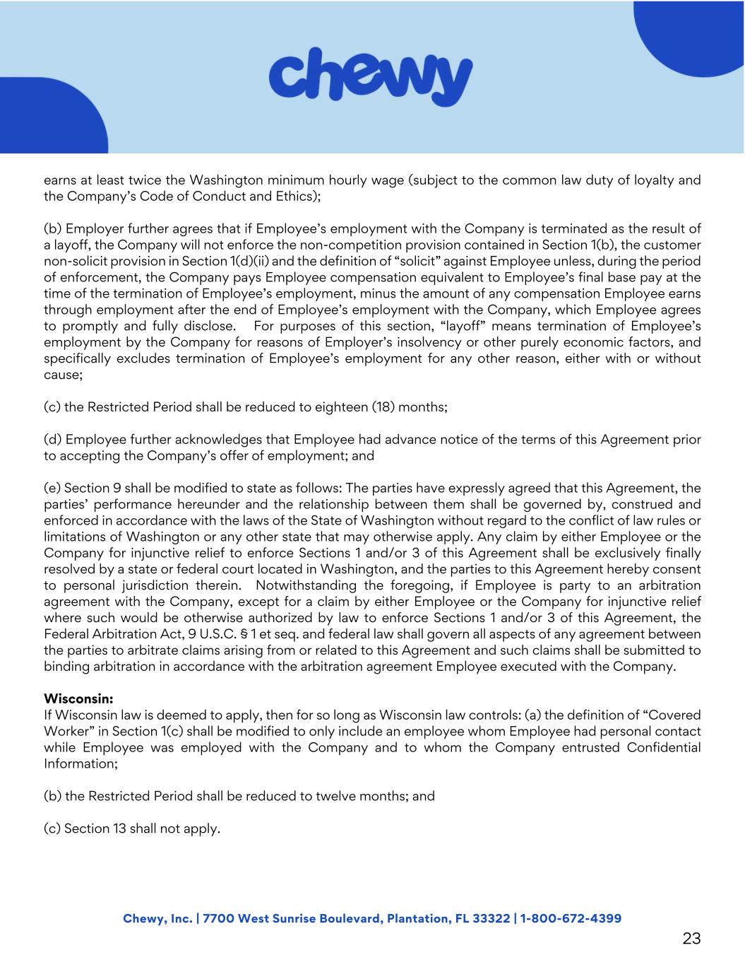 Chewy, Inc. | 7700 West Sunrise Boulevard, Plantation, FL 33322 | 1-800-672-4399 23 earns at least twice the Washington minimum hourly wage (subject to the common law duty of loyalty and the Company’s Code of Conduct and Ethics); (b) Employer further agrees that if Employee’s employment with the Company is terminated as the result of a layoff, the Company will not enforce the non-competition provision contained in Section 1(b), the customer non-solicit provision in Section 1(d)(ii) and the definition of “solicit” against Employee unless, during the period of enforcement, the Company pays Employee compensation equivalent to Employee’s final base pay at the time of the termination of Employee’s employment, minus the amount of any compensation Employee earns through employment after the end of Employee’s employment with the Company, which Employee agrees to promptly and fully disclose. For purposes of this section, “layoff” means termination of Employee’s employment by the Company for reasons of Employer’s insolvency or other purely economic factors, and specifically excludes termination of Employee’s employment for any other reason, either with or without cause; (c) the Restricted Period shall be reduced to eighteen (18) months; (d) Employee further acknowledges that Employee had advance notice of the terms of this Agreement prior to accepting the Company’s offer of employment; and (e) Section 9 shall be modified to state as follows: The parties have expressly agreed that this Agreement, the parties’ performance hereunder and the relationship between them shall be governed by, construed and enforced in accordance with the laws of the State of Washington without regard to the conflict of law rules or limitations of Washington or any other state that may otherwise apply. Any claim by either Employee or the Company for injunctive relief to enforce Sections 1 and/or 3 of this Agreement shall be exclusively finally resolved by a state or federal court located in Washington, and the parties to this Agreement hereby consent to personal jurisdiction therein. Notwithstanding the foregoing, if Employee is party to an arbitration agreement with the Company, except for a claim by either Employee or the Company for injunctive relief where such would be otherwise authorized by law to enforce Sections 1 and/or 3 of this Agreement, the Federal Arbitration Act, 9 U.S.C. § 1 et seq. and federal law shall govern all aspects of any agreement between the parties to arbitrate claims arising from or related to this Agreement and such claims shall be submitted to binding arbitration in accordance with the arbitration agreement Employee executed with the Company. Wisconsin: If Wisconsin law is deemed to apply, then for so long as Wisconsin law controls: (a) the definition of “Covered Worker” in Section 1(c) shall be modified to only include an employee whom Employee had personal contact while Employee was employed with the Company and to whom the Company entrusted Confidential Information; (b) the Restricted Period shall be reduced to twelve months; and (c) Section 13 shall not apply.