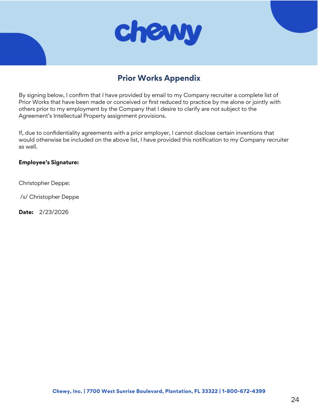 Chewy, Inc. | 7700 West Sunrise Boulevard, Plantation, FL 33322 | 1-800-672-4399 24 Prior Works Appendix By signing below, I confirm that I have provided by email to my Company recruiter a complete list of Prior Works that have been made or conceived or first reduced to practice by me alone or jointly with others prior to my employment by the Company that I desire to clarify are not subject to the Agreement’s Intellectual Property assignment provisions. If, due to confidentiality agreements with a prior employer, I cannot disclose certain inventions that would otherwise be included on the above list, I have provided this notification to my Company recruiter as well. Employee’s Signature: Christopher Deppe: /s/ Christopher Deppe Date: 2/23/2026