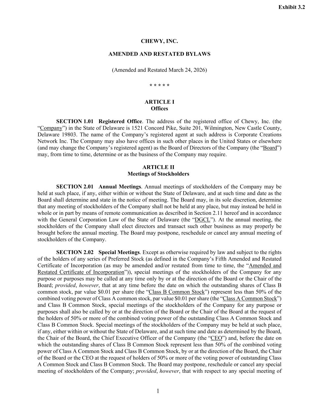 1 CHEWY, INC. AMENDED AND RESTATED BYLAWS (Amended and Restated March 24, 2026) * * * * * ARTICLE I Offices SECTION 1.01 Registered Office. The address of the registered office of Chewy, Inc. (the “Company”) in the State of Delaware is 1521 Concord Pike, Suite 201, Wilmington, New Castle County, Delaware 19803. The name of the Company’s registered agent at such address is Corporate Creations Network Inc. The Company may also have offices in such other places in the United States or elsewhere (and may change the Company’s registered agent) as the Board of Directors of the Company (the “Board”) may, from time to time, determine or as the business of the Company may require. ARTICLE II Meetings of Stockholders SECTION 2.01 Annual Meetings. Annual meetings of stockholders of the Company may be held at such place, if any, either within or without the State of Delaware, and at such time and date as the Board shall determine and state in the notice of meeting. The Board may, in its sole discretion, determine that any meeting of stockholders of the Company shall not be held at any place, but may instead be held in whole or in part by means of remote communication as described in Section 2.11 hereof and in accordance with the General Corporation Law of the State of Delaware (the “DGCL”). At the annual meeting, the stockholders of the Company shall elect directors and transact such other business as may properly be brought before the annual meeting. The Board may postpone, reschedule or cancel any annual meeting of stockholders of the Company. SECTION 2.02 Special Meetings. Except as otherwise required by law and subject to the rights of the holders of any series of Preferred Stock (as defined in the Company’s Fifth Amended and Restated Certificate of Incorporation (as may be amended and/or restated from time to time, the “Amended and Restated Certificate of Incorporation”)), special meetings of the stockholders of the Company for any purpose or purposes may be called at any time only by or at the direction of the Board or the Chair of the Board; provided, however, that at any time before the date on which the outstanding shares of Class B common stock, par value $0.01 per share (the “Class B Common Stock”) represent less than 50% of the combined voting power of Class A common stock, par value $0.01 per share (the “Class A Common Stock”) and Class B Common Stock, special meetings of the stockholders of the Company for any purpose or purposes shall also be called by or at the direction of the Board or the Chair of the Board at the request of the holders of 50% or more of the combined voting power of the outstanding Class A Common Stock and Class B Common Stock. Special meetings of the stockholders of the Company may be held at such place, if any, either within or without the State of Delaware, and at such time and date as determined by the Board, the Chair of the Board, the Chief Executive Officer of the Company (the “CEO”) and, before the date on which the outstanding shares of Class B Common Stock represent less than 50% of the combined voting power of Class A Common Stock and Class B Common Stock, by or at the direction of the Board, the Chair of the Board or the CEO at the request of holders of 50% or more of the voting power of outstanding Class A Common Stock and Class B Common Stock. The Board may postpone, reschedule or cancel any special meeting of stockholders of the Company; provided, however, that with respect to any special meeting of Exhibit 3.2