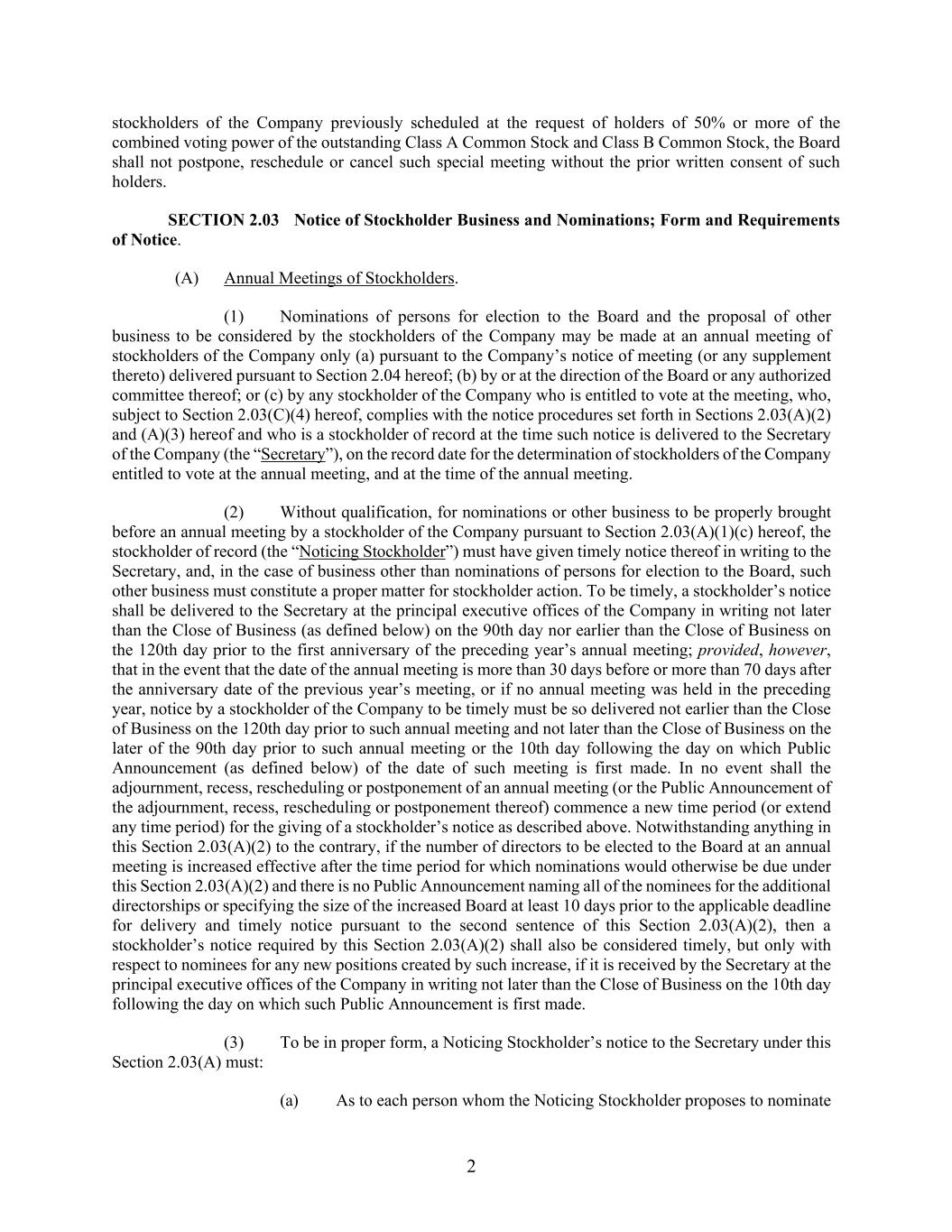 2 stockholders of the Company previously scheduled at the request of holders of 50% or more of the combined voting power of the outstanding Class A Common Stock and Class B Common Stock, the Board shall not postpone, reschedule or cancel such special meeting without the prior written consent of such holders. SECTION 2.03 Notice of Stockholder Business and Nominations; Form and Requirements of Notice. (A) Annual Meetings of Stockholders. (1) Nominations of persons for election to the Board and the proposal of other business to be considered by the stockholders of the Company may be made at an annual meeting of stockholders of the Company only (a) pursuant to the Company’s notice of meeting (or any supplement thereto) delivered pursuant to Section 2.04 hereof; (b) by or at the direction of the Board or any authorized committee thereof; or (c) by any stockholder of the Company who is entitled to vote at the meeting, who, subject to Section 2.03(C)(4) hereof, complies with the notice procedures set forth in Sections 2.03(A)(2) and (A)(3) hereof and who is a stockholder of record at the time such notice is delivered to the Secretary of the Company (the “Secretary”), on the record date for the determination of stockholders of the Company entitled to vote at the annual meeting, and at the time of the annual meeting. (2) Without qualification, for nominations or other business to be properly brought before an annual meeting by a stockholder of the Company pursuant to Section 2.03(A)(1)(c) hereof, the stockholder of record (the “Noticing Stockholder”) must have given timely notice thereof in writing to the Secretary, and, in the case of business other than nominations of persons for election to the Board, such other business must constitute a proper matter for stockholder action. To be timely, a stockholder’s notice shall be delivered to the Secretary at the principal executive offices of the Company in writing not later than the Close of Business (as defined below) on the 90th day nor earlier than the Close of Business on the 120th day prior to the first anniversary of the preceding year’s annual meeting; provided, however, that in the event that the date of the annual meeting is more than 30 days before or more than 70 days after the anniversary date of the previous year’s meeting, or if no annual meeting was held in the preceding year, notice by a stockholder of the Company to be timely must be so delivered not earlier than the Close of Business on the 120th day prior to such annual meeting and not later than the Close of Business on the later of the 90th day prior to such annual meeting or the 10th day following the day on which Public Announcement (as defined below) of the date of such meeting is first made. In no event shall the adjournment, recess, rescheduling or postponement of an annual meeting (or the Public Announcement of the adjournment, recess, rescheduling or postponement thereof) commence a new time period (or extend any time period) for the giving of a stockholder’s notice as described above. Notwithstanding anything in this Section 2.03(A)(2) to the contrary, if the number of directors to be elected to the Board at an annual meeting is increased effective after the time period for which nominations would otherwise be due under this Section 2.03(A)(2) and there is no Public Announcement naming all of the nominees for the additional directorships or specifying the size of the increased Board at least 10 days prior to the applicable deadline for delivery and timely notice pursuant to the second sentence of this Section 2.03(A)(2), then a stockholder’s notice required by this Section 2.03(A)(2) shall also be considered timely, but only with respect to nominees for any new positions created by such increase, if it is received by the Secretary at the principal executive offices of the Company in writing not later than the Close of Business on the 10th day following the day on which such Public Announcement is first made. (3) To be in proper form, a Noticing Stockholder’s notice to the Secretary under this Section 2.03(A) must: (a) As to each person whom the Noticing Stockholder proposes to nominate