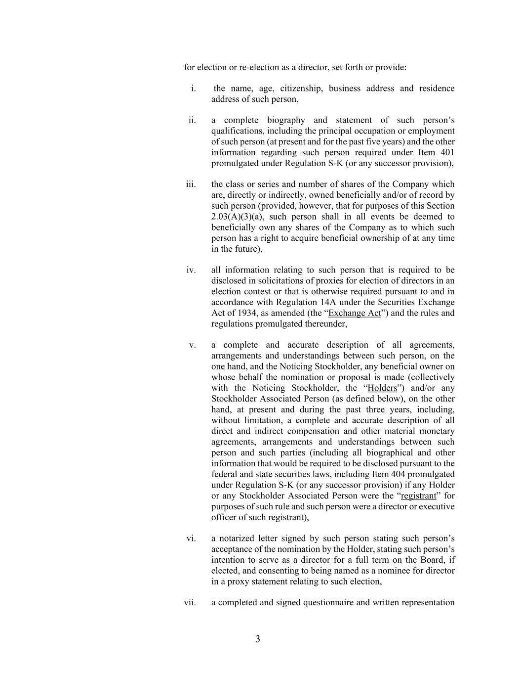 3 for election or re-election as a director, set forth or provide: i. the name, age, citizenship, business address and residence address of such person, ii. a complete biography and statement of such person’s qualifications, including the principal occupation or employment of such person (at present and for the past five years) and the other information regarding such person required under Item 401 promulgated under Regulation S-K (or any successor provision), iii. the class or series and number of shares of the Company which are, directly or indirectly, owned beneficially and/or of record by such person (provided, however, that for purposes of this Section 2.03(A)(3)(a), such person shall in all events be deemed to beneficially own any shares of the Company as to which such person has a right to acquire beneficial ownership of at any time in the future), iv. all information relating to such person that is required to be disclosed in solicitations of proxies for election of directors in an election contest or that is otherwise required pursuant to and in accordance with Regulation 14A under the Securities Exchange Act of 1934, as amended (the “Exchange Act”) and the rules and regulations promulgated thereunder, v. a complete and accurate description of all agreements, arrangements and understandings between such person, on the one hand, and the Noticing Stockholder, any beneficial owner on whose behalf the nomination or proposal is made (collectively with the Noticing Stockholder, the “Holders”) and/or any Stockholder Associated Person (as defined below), on the other hand, at present and during the past three years, including, without limitation, a complete and accurate description of all direct and indirect compensation and other material monetary agreements, arrangements and understandings between such person and such parties (including all biographical and other information that would be required to be disclosed pursuant to the federal and state securities laws, including Item 404 promulgated under Regulation S-K (or any successor provision) if any Holder or any Stockholder Associated Person were the “registrant” for purposes of such rule and such person were a director or executive officer of such registrant), vi. a notarized letter signed by such person stating such person’s acceptance of the nomination by the Holder, stating such person’s intention to serve as a director for a full term on the Board, if elected, and consenting to being named as a nominee for director in a proxy statement relating to such election, vii. a completed and signed questionnaire and written representation