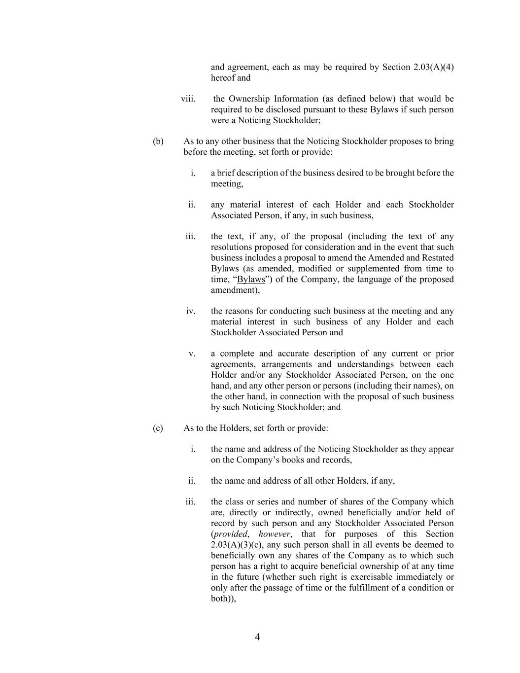 4 and agreement, each as may be required by Section 2.03(A)(4) hereof and viii. the Ownership Information (as defined below) that would be required to be disclosed pursuant to these Bylaws if such person were a Noticing Stockholder; (b) As to any other business that the Noticing Stockholder proposes to bring before the meeting, set forth or provide: i. a brief description of the business desired to be brought before the meeting, ii. any material interest of each Holder and each Stockholder Associated Person, if any, in such business, iii. the text, if any, of the proposal (including the text of any resolutions proposed for consideration and in the event that such business includes a proposal to amend the Amended and Restated Bylaws (as amended, modified or supplemented from time to time, “Bylaws”) of the Company, the language of the proposed amendment), iv. the reasons for conducting such business at the meeting and any material interest in such business of any Holder and each Stockholder Associated Person and v. a complete and accurate description of any current or prior agreements, arrangements and understandings between each Holder and/or any Stockholder Associated Person, on the one hand, and any other person or persons (including their names), on the other hand, in connection with the proposal of such business by such Noticing Stockholder; and (c) As to the Holders, set forth or provide: i. the name and address of the Noticing Stockholder as they appear on the Company’s books and records, ii. the name and address of all other Holders, if any, iii. the class or series and number of shares of the Company which are, directly or indirectly, owned beneficially and/or held of record by such person and any Stockholder Associated Person (provided, however, that for purposes of this Section 2.03(A)(3)(c), any such person shall in all events be deemed to beneficially own any shares of the Company as to which such person has a right to acquire beneficial ownership of at any time in the future (whether such right is exercisable immediately or only after the passage of time or the fulfillment of a condition or both)),