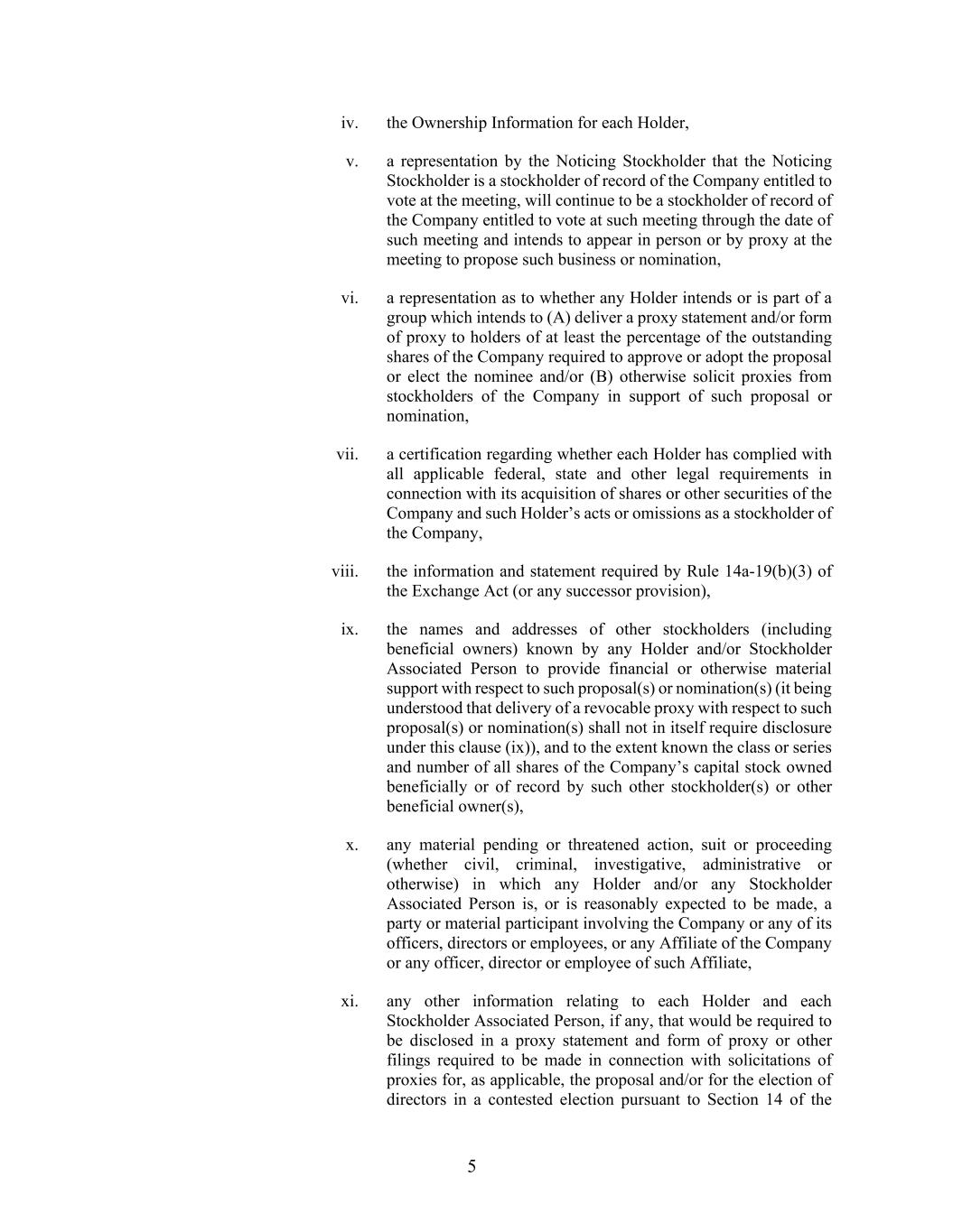 5 iv. the Ownership Information for each Holder, v. a representation by the Noticing Stockholder that the Noticing Stockholder is a stockholder of record of the Company entitled to vote at the meeting, will continue to be a stockholder of record of the Company entitled to vote at such meeting through the date of such meeting and intends to appear in person or by proxy at the meeting to propose such business or nomination, vi. a representation as to whether any Holder intends or is part of a group which intends to (A) deliver a proxy statement and/or form of proxy to holders of at least the percentage of the outstanding shares of the Company required to approve or adopt the proposal or elect the nominee and/or (B) otherwise solicit proxies from stockholders of the Company in support of such proposal or nomination, vii. a certification regarding whether each Holder has complied with all applicable federal, state and other legal requirements in connection with its acquisition of shares or other securities of the Company and such Holder’s acts or omissions as a stockholder of the Company, viii. the information and statement required by Rule 14a-19(b)(3) of the Exchange Act (or any successor provision), ix. the names and addresses of other stockholders (including beneficial owners) known by any Holder and/or Stockholder Associated Person to provide financial or otherwise material support with respect to such proposal(s) or nomination(s) (it being understood that delivery of a revocable proxy with respect to such proposal(s) or nomination(s) shall not in itself require disclosure under this clause (ix)), and to the extent known the class or series and number of all shares of the Company’s capital stock owned beneficially or of record by such other stockholder(s) or other beneficial owner(s), x. any material pending or threatened action, suit or proceeding (whether civil, criminal, investigative, administrative or otherwise) in which any Holder and/or any Stockholder Associated Person is, or is reasonably expected to be made, a party or material participant involving the Company or any of its officers, directors or employees, or any Affiliate of the Company or any officer, director or employee of such Affiliate, xi. any other information relating to each Holder and each Stockholder Associated Person, if any, that would be required to be disclosed in a proxy statement and form of proxy or other filings required to be made in connection with solicitations of proxies for, as applicable, the proposal and/or for the election of directors in a contested election pursuant to Section 14 of the