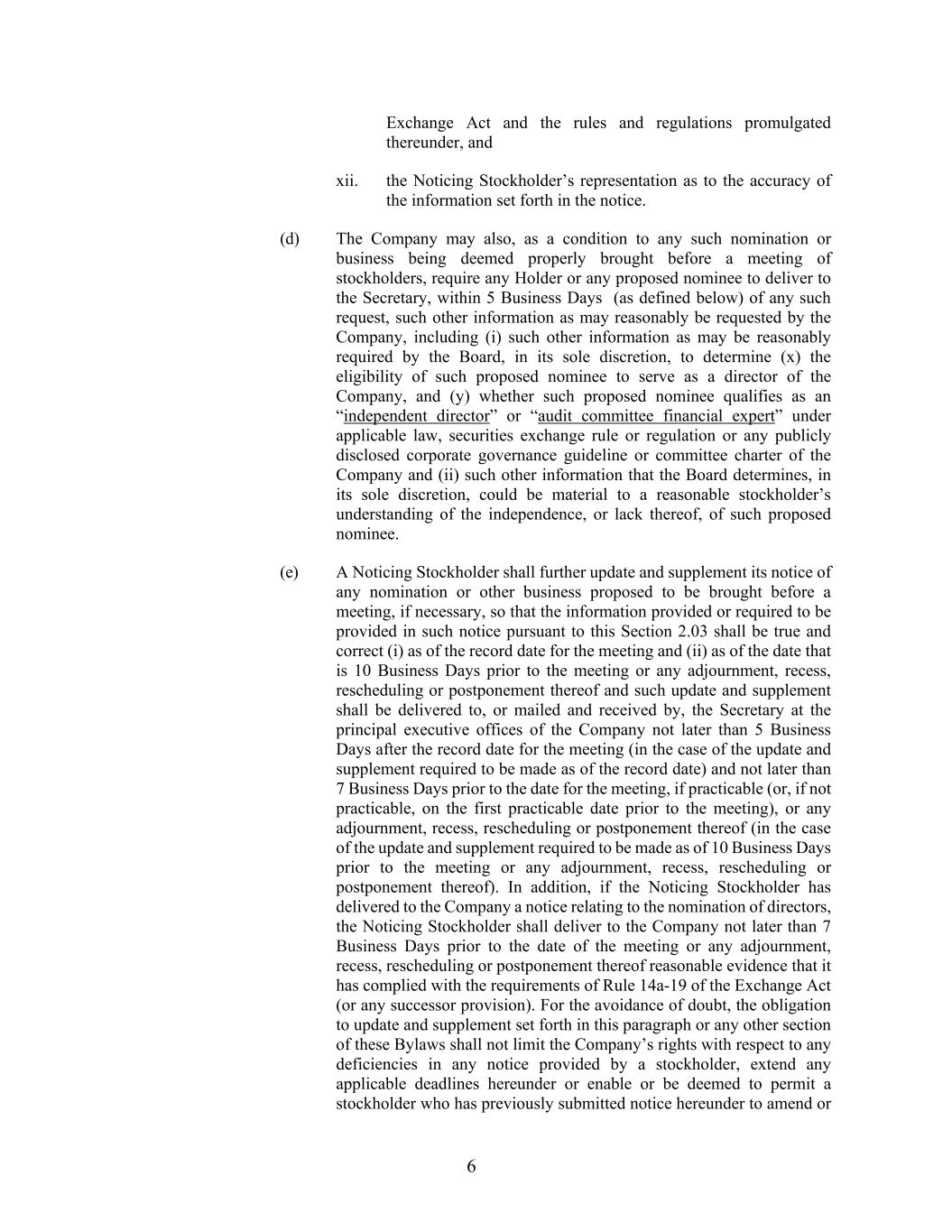 6 Exchange Act and the rules and regulations promulgated thereunder, and xii. the Noticing Stockholder’s representation as to the accuracy of the information set forth in the notice. (d) The Company may also, as a condition to any such nomination or business being deemed properly brought before a meeting of stockholders, require any Holder or any proposed nominee to deliver to the Secretary, within 5 Business Days (as defined below) of any such request, such other information as may reasonably be requested by the Company, including (i) such other information as may be reasonably required by the Board, in its sole discretion, to determine (x) the eligibility of such proposed nominee to serve as a director of the Company, and (y) whether such proposed nominee qualifies as an “independent director” or “audit committee financial expert” under applicable law, securities exchange rule or regulation or any publicly disclosed corporate governance guideline or committee charter of the Company and (ii) such other information that the Board determines, in its sole discretion, could be material to a reasonable stockholder’s understanding of the independence, or lack thereof, of such proposed nominee. (e) A Noticing Stockholder shall further update and supplement its notice of any nomination or other business proposed to be brought before a meeting, if necessary, so that the information provided or required to be provided in such notice pursuant to this Section 2.03 shall be true and correct (i) as of the record date for the meeting and (ii) as of the date that is 10 Business Days prior to the meeting or any adjournment, recess, rescheduling or postponement thereof and such update and supplement shall be delivered to, or mailed and received by, the Secretary at the principal executive offices of the Company not later than 5 Business Days after the record date for the meeting (in the case of the update and supplement required to be made as of the record date) and not later than 7 Business Days prior to the date for the meeting, if practicable (or, if not practicable, on the first practicable date prior to the meeting), or any adjournment, recess, rescheduling or postponement thereof (in the case of the update and supplement required to be made as of 10 Business Days prior to the meeting or any adjournment, recess, rescheduling or postponement thereof). In addition, if the Noticing Stockholder has delivered to the Company a notice relating to the nomination of directors, the Noticing Stockholder shall deliver to the Company not later than 7 Business Days prior to the date of the meeting or any adjournment, recess, rescheduling or postponement thereof reasonable evidence that it has complied with the requirements of Rule 14a-19 of the Exchange Act (or any successor provision). For the avoidance of doubt, the obligation to update and supplement set forth in this paragraph or any other section of these Bylaws shall not limit the Company’s rights with respect to any deficiencies in any notice provided by a stockholder, extend any applicable deadlines hereunder or enable or be deemed to permit a stockholder who has previously submitted notice hereunder to amend or