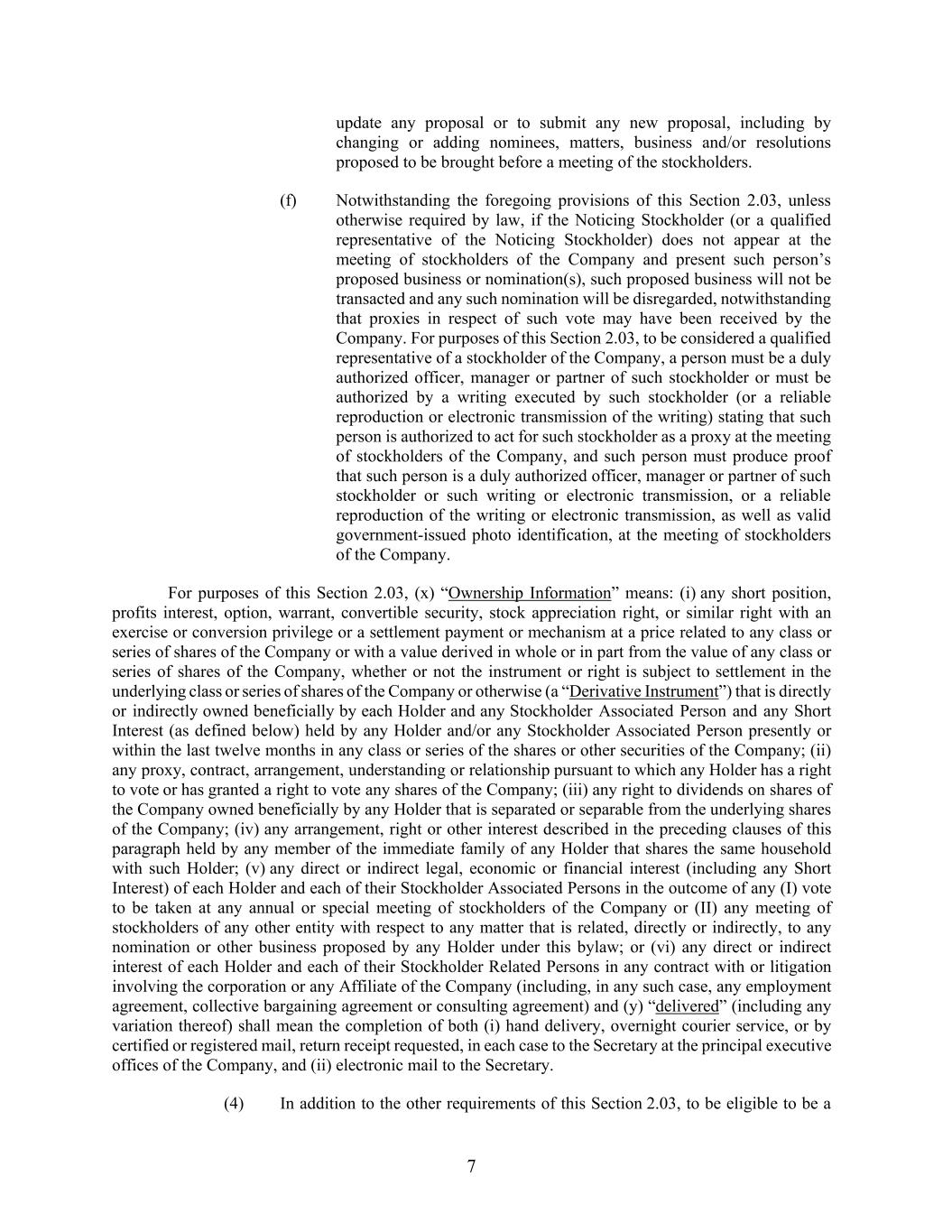 7 update any proposal or to submit any new proposal, including by changing or adding nominees, matters, business and/or resolutions proposed to be brought before a meeting of the stockholders. (f) Notwithstanding the foregoing provisions of this Section 2.03, unless otherwise required by law, if the Noticing Stockholder (or a qualified representative of the Noticing Stockholder) does not appear at the meeting of stockholders of the Company and present such person’s proposed business or nomination(s), such proposed business will not be transacted and any such nomination will be disregarded, notwithstanding that proxies in respect of such vote may have been received by the Company. For purposes of this Section 2.03, to be considered a qualified representative of a stockholder of the Company, a person must be a duly authorized officer, manager or partner of such stockholder or must be authorized by a writing executed by such stockholder (or a reliable reproduction or electronic transmission of the writing) stating that such person is authorized to act for such stockholder as a proxy at the meeting of stockholders of the Company, and such person must produce proof that such person is a duly authorized officer, manager or partner of such stockholder or such writing or electronic transmission, or a reliable reproduction of the writing or electronic transmission, as well as valid government-issued photo identification, at the meeting of stockholders of the Company. For purposes of this Section 2.03, (x) “Ownership Information” means: (i) any short position, profits interest, option, warrant, convertible security, stock appreciation right, or similar right with an exercise or conversion privilege or a settlement payment or mechanism at a price related to any class or series of shares of the Company or with a value derived in whole or in part from the value of any class or series of shares of the Company, whether or not the instrument or right is subject to settlement in the underlying class or series of shares of the Company or otherwise (a “Derivative Instrument”) that is directly or indirectly owned beneficially by each Holder and any Stockholder Associated Person and any Short Interest (as defined below) held by any Holder and/or any Stockholder Associated Person presently or within the last twelve months in any class or series of the shares or other securities of the Company; (ii) any proxy, contract, arrangement, understanding or relationship pursuant to which any Holder has a right to vote or has granted a right to vote any shares of the Company; (iii) any right to dividends on shares of the Company owned beneficially by any Holder that is separated or separable from the underlying shares of the Company; (iv) any arrangement, right or other interest described in the preceding clauses of this paragraph held by any member of the immediate family of any Holder that shares the same household with such Holder; (v) any direct or indirect legal, economic or financial interest (including any Short Interest) of each Holder and each of their Stockholder Associated Persons in the outcome of any (I) vote to be taken at any annual or special meeting of stockholders of the Company or (II) any meeting of stockholders of any other entity with respect to any matter that is related, directly or indirectly, to any nomination or other business proposed by any Holder under this bylaw; or (vi) any direct or indirect interest of each Holder and each of their Stockholder Related Persons in any contract with or litigation involving the corporation or any Affiliate of the Company (including, in any such case, any employment agreement, collective bargaining agreement or consulting agreement) and (y) “delivered” (including any variation thereof) shall mean the completion of both (i) hand delivery, overnight courier service, or by certified or registered mail, return receipt requested, in each case to the Secretary at the principal executive offices of the Company, and (ii) electronic mail to the Secretary. (4) In addition to the other requirements of this Section 2.03, to be eligible to be a