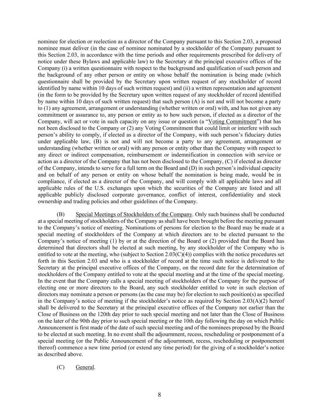 8 nominee for election or reelection as a director of the Company pursuant to this Section 2.03, a proposed nominee must deliver (in the case of nominee nominated by a stockholder of the Company pursuant to this Section 2.03, in accordance with the time periods and other requirements prescribed for delivery of notice under these Bylaws and applicable law) to the Secretary at the principal executive offices of the Company (i) a written questionnaire with respect to the background and qualification of such person and the background of any other person or entity on whose behalf the nomination is being made (which questionnaire shall be provided by the Secretary upon written request of any stockholder of record identified by name within 10 days of such written request) and (ii) a written representation and agreement (in the form to be provided by the Secretary upon written request of any stockholder of record identified by name within 10 days of such written request) that such person (A) is not and will not become a party to (1) any agreement, arrangement or understanding (whether written or oral) with, and has not given any commitment or assurance to, any person or entity as to how such person, if elected as a director of the Company, will act or vote in such capacity on any issue or question (a “Voting Commitment”) that has not been disclosed to the Company or (2) any Voting Commitment that could limit or interfere with such person’s ability to comply, if elected as a director of the Company, with such person’s fiduciary duties under applicable law, (B) is not and will not become a party to any agreement, arrangement or understanding (whether written or oral) with any person or entity other than the Company with respect to any direct or indirect compensation, reimbursement or indemnification in connection with service or action as a director of the Company that has not been disclosed to the Company, (C) if elected as director of the Company, intends to serve for a full term on the Board and (D) in such person’s individual capacity and on behalf of any person or entity on whose behalf the nomination is being made, would be in compliance, if elected as a director of the Company, and will comply with all applicable laws and all applicable rules of the U.S. exchanges upon which the securities of the Company are listed and all applicable publicly disclosed corporate governance, conflict of interest, confidentiality and stock ownership and trading policies and other guidelines of the Company. (B) Special Meetings of Stockholders of the Company. Only such business shall be conducted at a special meeting of stockholders of the Company as shall have been brought before the meeting pursuant to the Company’s notice of meeting. Nominations of persons for election to the Board may be made at a special meeting of stockholders of the Company at which directors are to be elected pursuant to the Company’s notice of meeting (1) by or at the direction of the Board or (2) provided that the Board has determined that directors shall be elected at such meeting, by any stockholder of the Company who is entitled to vote at the meeting, who (subject to Section 2.03(C)(4)) complies with the notice procedures set forth in this Section 2.03 and who is a stockholder of record at the time such notice is delivered to the Secretary at the principal executive offices of the Company, on the record date for the determination of stockholders of the Company entitled to vote at the special meeting and at the time of the special meeting. In the event that the Company calls a special meeting of stockholders of the Company for the purpose of electing one or more directors to the Board, any such stockholder entitled to vote in such election of directors may nominate a person or persons (as the case may be) for election to such position(s) as specified in the Company’s notice of meeting if the stockholder’s notice as required by Section 2.03(A)(2) hereof shall be delivered to the Secretary at the principal executive offices of the Company not earlier than the Close of Business on the 120th day prior to such special meeting and not later than the Close of Business on the later of the 90th day prior to such special meeting or the 10th day following the day on which Public Announcement is first made of the date of such special meeting and of the nominees proposed by the Board to be elected at such meeting. In no event shall the adjournment, recess, rescheduling or postponement of a special meeting (or the Public Announcement of the adjournment, recess, rescheduling or postponement thereof) commence a new time period (or extend any time period) for the giving of a stockholder’s notice as described above. (C) General.