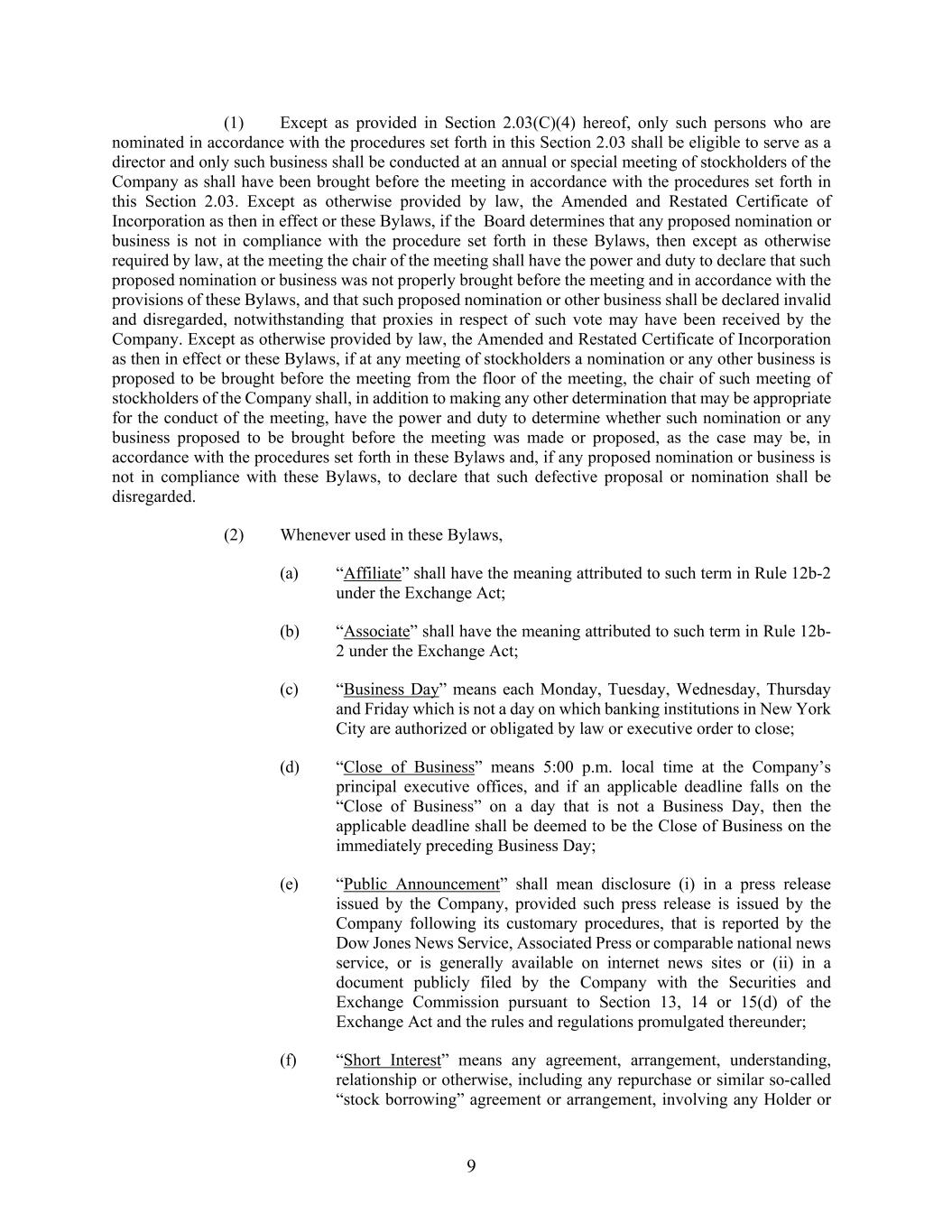 9 (1) Except as provided in Section 2.03(C)(4) hereof, only such persons who are nominated in accordance with the procedures set forth in this Section 2.03 shall be eligible to serve as a director and only such business shall be conducted at an annual or special meeting of stockholders of the Company as shall have been brought before the meeting in accordance with the procedures set forth in this Section 2.03. Except as otherwise provided by law, the Amended and Restated Certificate of Incorporation as then in effect or these Bylaws, if the Board determines that any proposed nomination or business is not in compliance with the procedure set forth in these Bylaws, then except as otherwise required by law, at the meeting the chair of the meeting shall have the power and duty to declare that such proposed nomination or business was not properly brought before the meeting and in accordance with the provisions of these Bylaws, and that such proposed nomination or other business shall be declared invalid and disregarded, notwithstanding that proxies in respect of such vote may have been received by the Company. Except as otherwise provided by law, the Amended and Restated Certificate of Incorporation as then in effect or these Bylaws, if at any meeting of stockholders a nomination or any other business is proposed to be brought before the meeting from the floor of the meeting, the chair of such meeting of stockholders of the Company shall, in addition to making any other determination that may be appropriate for the conduct of the meeting, have the power and duty to determine whether such nomination or any business proposed to be brought before the meeting was made or proposed, as the case may be, in accordance with the procedures set forth in these Bylaws and, if any proposed nomination or business is not in compliance with these Bylaws, to declare that such defective proposal or nomination shall be disregarded. (2) Whenever used in these Bylaws, (a) “Affiliate” shall have the meaning attributed to such term in Rule 12b-2 under the Exchange Act; (b) “Associate” shall have the meaning attributed to such term in Rule 12b- 2 under the Exchange Act; (c) “Business Day” means each Monday, Tuesday, Wednesday, Thursday and Friday which is not a day on which banking institutions in New York City are authorized or obligated by law or executive order to close; (d) “Close of Business” means 5:00 p.m. local time at the Company’s principal executive offices, and if an applicable deadline falls on the “Close of Business” on a day that is not a Business Day, then the applicable deadline shall be deemed to be the Close of Business on the immediately preceding Business Day; (e) “Public Announcement” shall mean disclosure (i) in a press release issued by the Company, provided such press release is issued by the Company following its customary procedures, that is reported by the Dow Jones News Service, Associated Press or comparable national news service, or is generally available on internet news sites or (ii) in a document publicly filed by the Company with the Securities and Exchange Commission pursuant to Section 13, 14 or 15(d) of the Exchange Act and the rules and regulations promulgated thereunder; (f) “Short Interest” means any agreement, arrangement, understanding, relationship or otherwise, including any repurchase or similar so-called “stock borrowing” agreement or arrangement, involving any Holder or