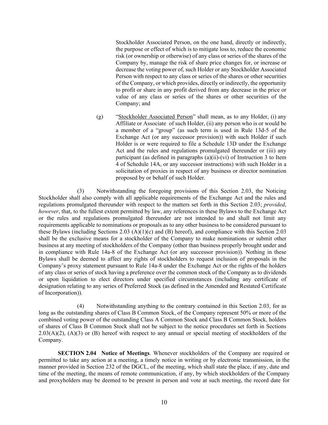 10 Stockholder Associated Person, on the one hand, directly or indirectly, the purpose or effect of which is to mitigate loss to, reduce the economic risk (or ownership or otherwise) of any class or series of the shares of the Company by, manage the risk of share price changes for, or increase or decrease the voting power of, such Holder or any Stockholder Associated Person with respect to any class or series of the shares or other securities of the Company, or which provides, directly or indirectly, the opportunity to profit or share in any profit derived from any decrease in the price or value of any class or series of the shares or other securities of the Company; and (g) “Stockholder Associated Person” shall mean, as to any Holder, (i) any Affiliate or Associate of such Holder, (ii) any person who is or would be a member of a “group” (as such term is used in Rule 13d-5 of the Exchange Act (or any successor provision)) with such Holder if such Holder is or were required to file a Schedule 13D under the Exchange Act and the rules and regulations promulgated thereunder or (iii) any participant (as defined in paragraphs (a)(ii)-(vi) of Instruction 3 to Item 4 of Schedule 14A, or any successor instructions) with such Holder in a solicitation of proxies in respect of any business or director nomination proposed by or behalf of such Holder. (3) Notwithstanding the foregoing provisions of this Section 2.03, the Noticing Stockholder shall also comply with all applicable requirements of the Exchange Act and the rules and regulations promulgated thereunder with respect to the matters set forth in this Section 2.03; provided, however, that, to the fullest extent permitted by law, any references in these Bylaws to the Exchange Act or the rules and regulations promulgated thereunder are not intended to and shall not limit any requirements applicable to nominations or proposals as to any other business to be considered pursuant to these Bylaws (including Sections 2.03 (A)(1)(c) and (B) hereof), and compliance with this Section 2.03 shall be the exclusive means for a stockholder of the Company to make nominations or submit other business at any meeting of stockholders of the Company (other than business properly brought under and in compliance with Rule 14a-8 of the Exchange Act (or any successor provision)). Nothing in these Bylaws shall be deemed to affect any rights of stockholders to request inclusion of proposals in the Company’s proxy statement pursuant to Rule 14a-8 under the Exchange Act or the rights of the holders of any class or series of stock having a preference over the common stock of the Company as to dividends or upon liquidation to elect directors under specified circumstances (including any certificate of designation relating to any series of Preferred Stock (as defined in the Amended and Restated Certificate of Incorporation)). (4) Notwithstanding anything to the contrary contained in this Section 2.03, for as long as the outstanding shares of Class B Common Stock, of the Company represent 50% or more of the combined voting power of the outstanding Class A Common Stock and Class B Common Stock, holders of shares of Class B Common Stock shall not be subject to the notice procedures set forth in Sections 2.03(A)(2), (A)(3) or (B) hereof with respect to any annual or special meeting of stockholders of the Company. SECTION 2.04 Notice of Meetings. Whenever stockholders of the Company are required or permitted to take any action at a meeting, a timely notice in writing or by electronic transmission, in the manner provided in Section 232 of the DGCL, of the meeting, which shall state the place, if any, date and time of the meeting, the means of remote communication, if any, by which stockholders of the Company and proxyholders may be deemed to be present in person and vote at such meeting, the record date for