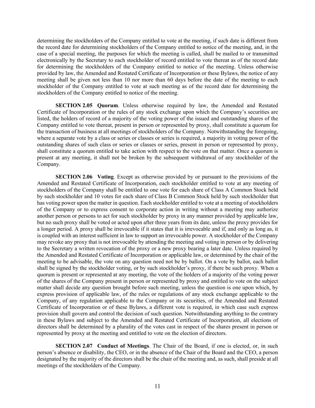 11 determining the stockholders of the Company entitled to vote at the meeting, if such date is different from the record date for determining stockholders of the Company entitled to notice of the meeting, and, in the case of a special meeting, the purposes for which the meeting is called, shall be mailed to or transmitted electronically by the Secretary to each stockholder of record entitled to vote thereat as of the record date for determining the stockholders of the Company entitled to notice of the meeting. Unless otherwise provided by law, the Amended and Restated Certificate of Incorporation or these Bylaws, the notice of any meeting shall be given not less than 10 nor more than 60 days before the date of the meeting to each stockholder of the Company entitled to vote at such meeting as of the record date for determining the stockholders of the Company entitled to notice of the meeting. SECTION 2.05 Quorum. Unless otherwise required by law, the Amended and Restated Certificate of Incorporation or the rules of any stock exchange upon which the Company’s securities are listed, the holders of record of a majority of the voting power of the issued and outstanding shares of the Company entitled to vote thereat, present in person or represented by proxy, shall constitute a quorum for the transaction of business at all meetings of stockholders of the Company. Notwithstanding the foregoing, where a separate vote by a class or series or classes or series is required, a majority in voting power of the outstanding shares of such class or series or classes or series, present in person or represented by proxy, shall constitute a quorum entitled to take action with respect to the vote on that matter. Once a quorum is present at any meeting, it shall not be broken by the subsequent withdrawal of any stockholder of the Company. SECTION 2.06 Voting. Except as otherwise provided by or pursuant to the provisions of the Amended and Restated Certificate of Incorporation, each stockholder entitled to vote at any meeting of stockholders of the Company shall be entitled to one vote for each share of Class A Common Stock held by such stockholder and 10 votes for each share of Class B Common Stock held by such stockholder that has voting power upon the matter in question. Each stockholder entitled to vote at a meeting of stockholders of the Company or to express consent to corporate action in writing without a meeting may authorize another person or persons to act for such stockholder by proxy in any manner provided by applicable law, but no such proxy shall be voted or acted upon after three years from its date, unless the proxy provides for a longer period. A proxy shall be irrevocable if it states that it is irrevocable and if, and only as long as, it is coupled with an interest sufficient in law to support an irrevocable power. A stockholder of the Company may revoke any proxy that is not irrevocable by attending the meeting and voting in person or by delivering to the Secretary a written revocation of the proxy or a new proxy bearing a later date. Unless required by the Amended and Restated Certificate of Incorporation or applicable law, or determined by the chair of the meeting to be advisable, the vote on any question need not be by ballot. On a vote by ballot, each ballot shall be signed by the stockholder voting, or by such stockholder’s proxy, if there be such proxy. When a quorum is present or represented at any meeting, the vote of the holders of a majority of the voting power of the shares of the Company present in person or represented by proxy and entitled to vote on the subject matter shall decide any question brought before such meeting, unless the question is one upon which, by express provision of applicable law, of the rules or regulations of any stock exchange applicable to the Company, of any regulation applicable to the Company or its securities, of the Amended and Restated Certificate of Incorporation or of these Bylaws, a different vote is required, in which case such express provision shall govern and control the decision of such question. Notwithstanding anything to the contrary in these Bylaws and subject to the Amended and Restated Certificate of Incorporation, all elections of directors shall be determined by a plurality of the votes cast in respect of the shares present in person or represented by proxy at the meeting and entitled to vote on the election of directors. SECTION 2.07 Conduct of Meetings. The Chair of the Board, if one is elected, or, in such person’s absence or disability, the CEO, or in the absence of the Chair of the Board and the CEO, a person designated by the majority of the directors shall be the chair of the meeting and, as such, shall preside at all meetings of the stockholders of the Company.