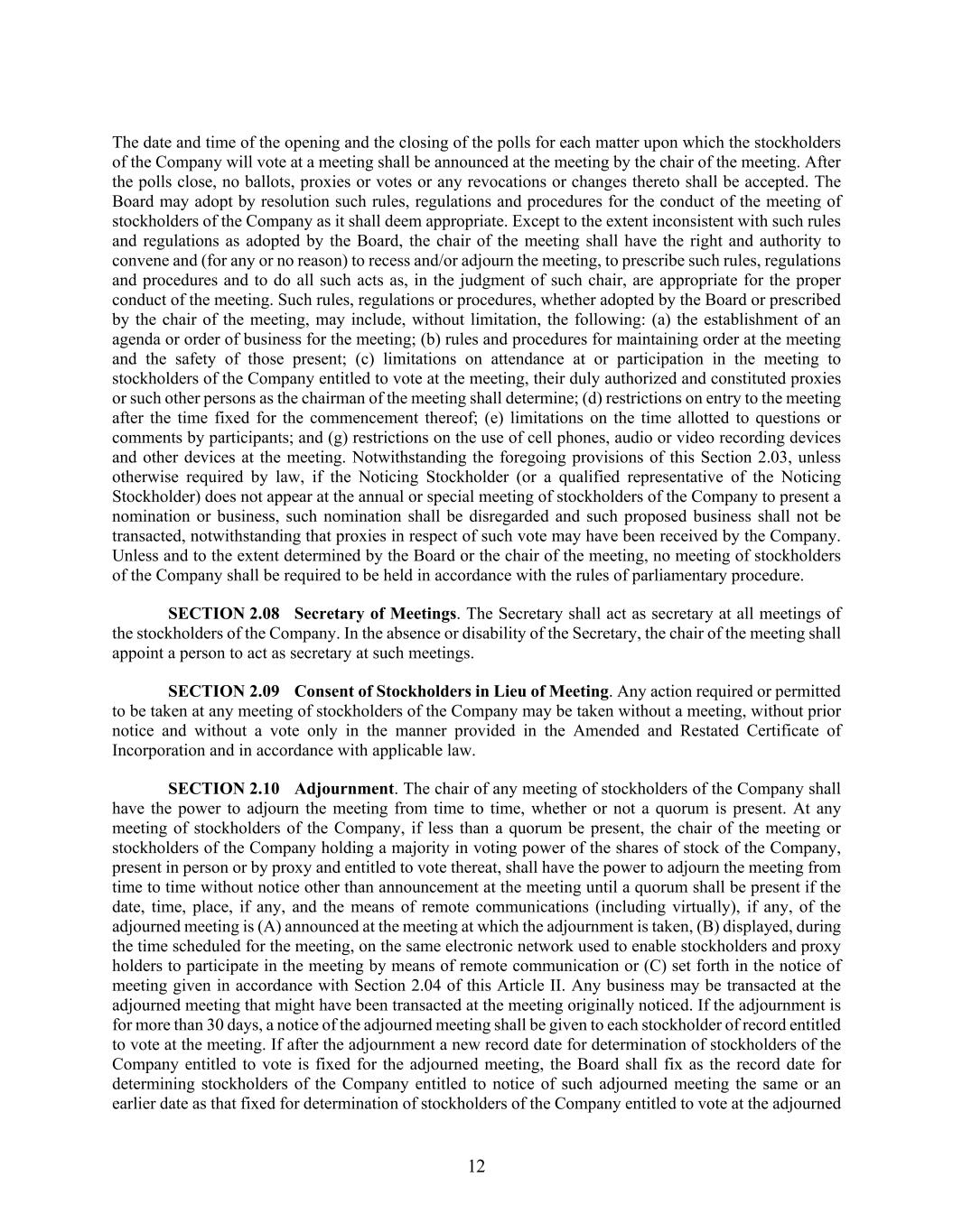 12 The date and time of the opening and the closing of the polls for each matter upon which the stockholders of the Company will vote at a meeting shall be announced at the meeting by the chair of the meeting. After the polls close, no ballots, proxies or votes or any revocations or changes thereto shall be accepted. The Board may adopt by resolution such rules, regulations and procedures for the conduct of the meeting of stockholders of the Company as it shall deem appropriate. Except to the extent inconsistent with such rules and regulations as adopted by the Board, the chair of the meeting shall have the right and authority to convene and (for any or no reason) to recess and/or adjourn the meeting, to prescribe such rules, regulations and procedures and to do all such acts as, in the judgment of such chair, are appropriate for the proper conduct of the meeting. Such rules, regulations or procedures, whether adopted by the Board or prescribed by the chair of the meeting, may include, without limitation, the following: (a) the establishment of an agenda or order of business for the meeting; (b) rules and procedures for maintaining order at the meeting and the safety of those present; (c) limitations on attendance at or participation in the meeting to stockholders of the Company entitled to vote at the meeting, their duly authorized and constituted proxies or such other persons as the chairman of the meeting shall determine; (d) restrictions on entry to the meeting after the time fixed for the commencement thereof; (e) limitations on the time allotted to questions or comments by participants; and (g) restrictions on the use of cell phones, audio or video recording devices and other devices at the meeting. Notwithstanding the foregoing provisions of this Section 2.03, unless otherwise required by law, if the Noticing Stockholder (or a qualified representative of the Noticing Stockholder) does not appear at the annual or special meeting of stockholders of the Company to present a nomination or business, such nomination shall be disregarded and such proposed business shall not be transacted, notwithstanding that proxies in respect of such vote may have been received by the Company. Unless and to the extent determined by the Board or the chair of the meeting, no meeting of stockholders of the Company shall be required to be held in accordance with the rules of parliamentary procedure. SECTION 2.08 Secretary of Meetings. The Secretary shall act as secretary at all meetings of the stockholders of the Company. In the absence or disability of the Secretary, the chair of the meeting shall appoint a person to act as secretary at such meetings. SECTION 2.09 Consent of Stockholders in Lieu of Meeting. Any action required or permitted to be taken at any meeting of stockholders of the Company may be taken without a meeting, without prior notice and without a vote only in the manner provided in the Amended and Restated Certificate of Incorporation and in accordance with applicable law. SECTION 2.10 Adjournment. The chair of any meeting of stockholders of the Company shall have the power to adjourn the meeting from time to time, whether or not a quorum is present. At any meeting of stockholders of the Company, if less than a quorum be present, the chair of the meeting or stockholders of the Company holding a majority in voting power of the shares of stock of the Company, present in person or by proxy and entitled to vote thereat, shall have the power to adjourn the meeting from time to time without notice other than announcement at the meeting until a quorum shall be present if the date, time, place, if any, and the means of remote communications (including virtually), if any, of the adjourned meeting is (A) announced at the meeting at which the adjournment is taken, (B) displayed, during the time scheduled for the meeting, on the same electronic network used to enable stockholders and proxy holders to participate in the meeting by means of remote communication or (C) set forth in the notice of meeting given in accordance with Section 2.04 of this Article II. Any business may be transacted at the adjourned meeting that might have been transacted at the meeting originally noticed. If the adjournment is for more than 30 days, a notice of the adjourned meeting shall be given to each stockholder of record entitled to vote at the meeting. If after the adjournment a new record date for determination of stockholders of the Company entitled to vote is fixed for the adjourned meeting, the Board shall fix as the record date for determining stockholders of the Company entitled to notice of such adjourned meeting the same or an earlier date as that fixed for determination of stockholders of the Company entitled to vote at the adjourned