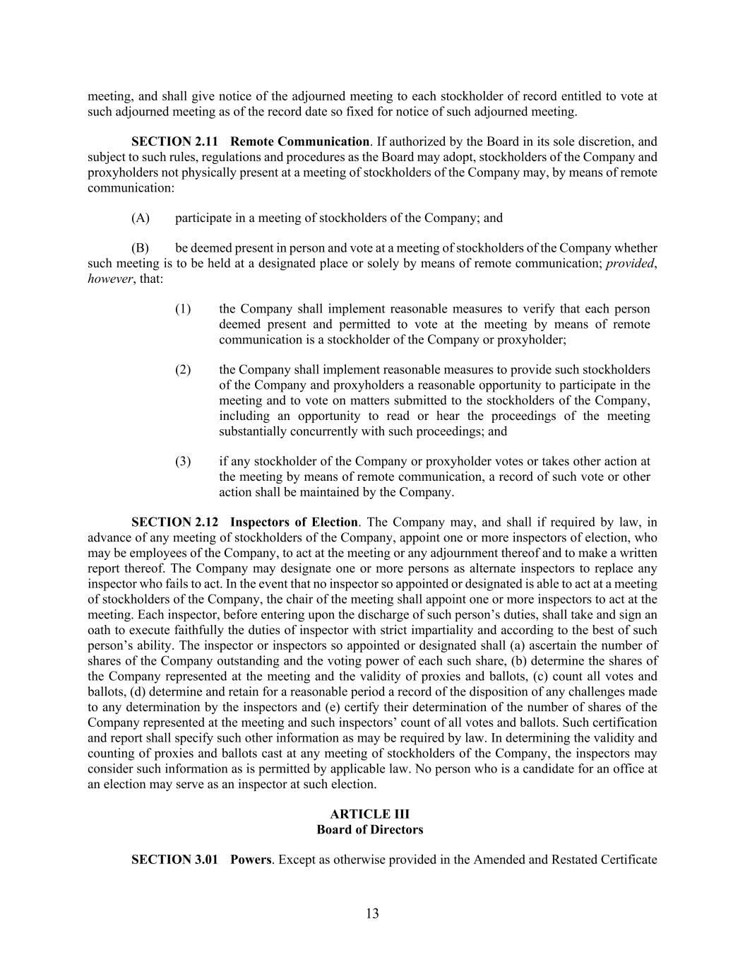 13 meeting, and shall give notice of the adjourned meeting to each stockholder of record entitled to vote at such adjourned meeting as of the record date so fixed for notice of such adjourned meeting. SECTION 2.11 Remote Communication. If authorized by the Board in its sole discretion, and subject to such rules, regulations and procedures as the Board may adopt, stockholders of the Company and proxyholders not physically present at a meeting of stockholders of the Company may, by means of remote communication: (A) participate in a meeting of stockholders of the Company; and (B) be deemed present in person and vote at a meeting of stockholders of the Company whether such meeting is to be held at a designated place or solely by means of remote communication; provided, however, that: (1) the Company shall implement reasonable measures to verify that each person deemed present and permitted to vote at the meeting by means of remote communication is a stockholder of the Company or proxyholder; (2) the Company shall implement reasonable measures to provide such stockholders of the Company and proxyholders a reasonable opportunity to participate in the meeting and to vote on matters submitted to the stockholders of the Company, including an opportunity to read or hear the proceedings of the meeting substantially concurrently with such proceedings; and (3) if any stockholder of the Company or proxyholder votes or takes other action at the meeting by means of remote communication, a record of such vote or other action shall be maintained by the Company. SECTION 2.12 Inspectors of Election. The Company may, and shall if required by law, in advance of any meeting of stockholders of the Company, appoint one or more inspectors of election, who may be employees of the Company, to act at the meeting or any adjournment thereof and to make a written report thereof. The Company may designate one or more persons as alternate inspectors to replace any inspector who fails to act. In the event that no inspector so appointed or designated is able to act at a meeting of stockholders of the Company, the chair of the meeting shall appoint one or more inspectors to act at the meeting. Each inspector, before entering upon the discharge of such person’s duties, shall take and sign an oath to execute faithfully the duties of inspector with strict impartiality and according to the best of such person’s ability. The inspector or inspectors so appointed or designated shall (a) ascertain the number of shares of the Company outstanding and the voting power of each such share, (b) determine the shares of the Company represented at the meeting and the validity of proxies and ballots, (c) count all votes and ballots, (d) determine and retain for a reasonable period a record of the disposition of any challenges made to any determination by the inspectors and (e) certify their determination of the number of shares of the Company represented at the meeting and such inspectors’ count of all votes and ballots. Such certification and report shall specify such other information as may be required by law. In determining the validity and counting of proxies and ballots cast at any meeting of stockholders of the Company, the inspectors may consider such information as is permitted by applicable law. No person who is a candidate for an office at an election may serve as an inspector at such election. ARTICLE III Board of Directors SECTION 3.01 Powers. Except as otherwise provided in the Amended and Restated Certificate