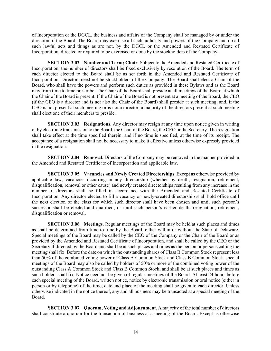 14 of Incorporation or the DGCL, the business and affairs of the Company shall be managed by or under the direction of the Board. The Board may exercise all such authority and powers of the Company and do all such lawful acts and things as are not, by the DGCL or the Amended and Restated Certificate of Incorporation, directed or required to be exercised or done by the stockholders of the Company. SECTION 3.02 Number and Term; Chair. Subject to the Amended and Restated Certificate of Incorporation, the number of directors shall be fixed exclusively by resolution of the Board. The term of each director elected to the Board shall be as set forth in the Amended and Restated Certificate of Incorporation. Directors need not be stockholders of the Company. The Board shall elect a Chair of the Board, who shall have the powers and perform such duties as provided in these Bylaws and as the Board may from time to time prescribe. The Chair of the Board shall preside at all meetings of the Board at which the Chair of the Board is present. If the Chair of the Board is not present at a meeting of the Board, the CEO (if the CEO is a director and is not also the Chair of the Board) shall preside at such meeting, and, if the CEO is not present at such meeting or is not a director, a majority of the directors present at such meeting shall elect one of their members to preside. SECTION 3.03 Resignations. Any director may resign at any time upon notice given in writing or by electronic transmission to the Board, the Chair of the Board, the CEO or the Secretary. The resignation shall take effect at the time specified therein, and if no time is specified, at the time of its receipt. The acceptance of a resignation shall not be necessary to make it effective unless otherwise expressly provided in the resignation. SECTION 3.04 Removal. Directors of the Company may be removed in the manner provided in the Amended and Restated Certificate of Incorporation and applicable law. SECTION 3.05 Vacancies and Newly Created Directorships. Except as otherwise provided by applicable law, vacancies occurring in any directorship (whether by death, resignation, retirement, disqualification, removal or other cause) and newly created directorships resulting from any increase in the number of directors shall be filled in accordance with the Amended and Restated Certificate of Incorporation. Any director elected to fill a vacancy or newly-created directorship shall hold office until the next election of the class for which such director shall have been chosen and until such person’s successor shall be elected and qualified, or until such person’s earlier death, resignation, retirement, disqualification or removal. SECTION 3.06 Meetings. Regular meetings of the Board may be held at such places and times as shall be determined from time to time by the Board, either within or without the State of Delaware. Special meetings of the Board may be called by the CEO of the Company or the Chair of the Board or as provided by the Amended and Restated Certificate of Incorporation, and shall be called by the CEO or the Secretary if directed by the Board and shall be at such places and times as the person or persons calling the meeting shall fix. Before the date on which the outstanding shares of Class B Common Stock represent less than 50% of the combined voting power of Class A Common Stock and Class B Common Stock, special meetings of the Board may also be called by holders of 50% or more of the combined voting power of the outstanding Class A Common Stock and Class B Common Stock, and shall be at such places and times as such holders shall fix. Notice need not be given of regular meetings of the Board. At least 24 hours before each special meeting of the Board, written notice, notice by electronic transmission or oral notice (either in person or by telephone) of the time, date and place of the meeting shall be given to each director. Unless otherwise indicated in the notice thereof, any and all business may be transacted at a special meeting of the Board. SECTION 3.07 Quorum, Voting and Adjournment. A majority of the total number of directors shall constitute a quorum for the transaction of business at a meeting of the Board. Except as otherwise