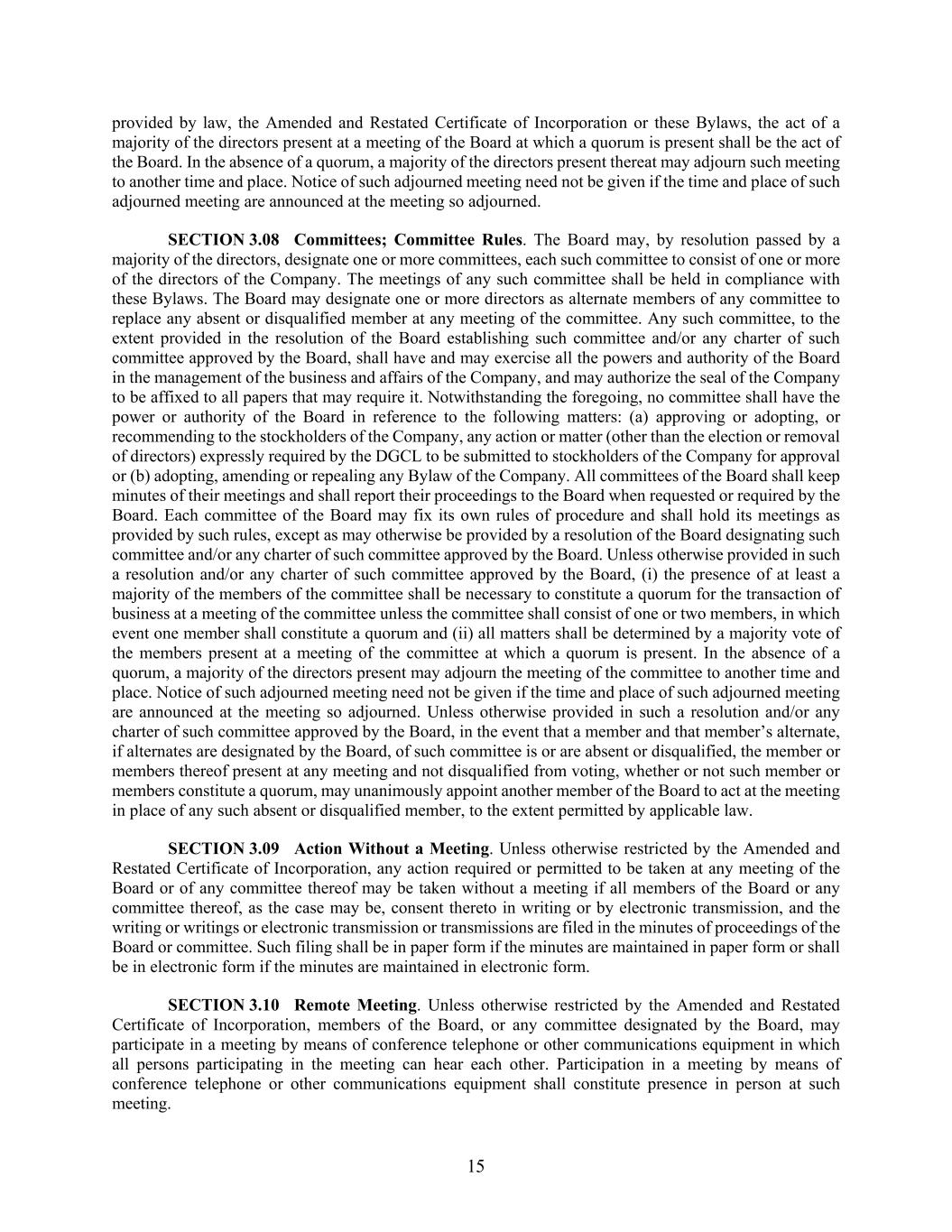 15 provided by law, the Amended and Restated Certificate of Incorporation or these Bylaws, the act of a majority of the directors present at a meeting of the Board at which a quorum is present shall be the act of the Board. In the absence of a quorum, a majority of the directors present thereat may adjourn such meeting to another time and place. Notice of such adjourned meeting need not be given if the time and place of such adjourned meeting are announced at the meeting so adjourned. SECTION 3.08 Committees; Committee Rules. The Board may, by resolution passed by a majority of the directors, designate one or more committees, each such committee to consist of one or more of the directors of the Company. The meetings of any such committee shall be held in compliance with these Bylaws. The Board may designate one or more directors as alternate members of any committee to replace any absent or disqualified member at any meeting of the committee. Any such committee, to the extent provided in the resolution of the Board establishing such committee and/or any charter of such committee approved by the Board, shall have and may exercise all the powers and authority of the Board in the management of the business and affairs of the Company, and may authorize the seal of the Company to be affixed to all papers that may require it. Notwithstanding the foregoing, no committee shall have the power or authority of the Board in reference to the following matters: (a) approving or adopting, or recommending to the stockholders of the Company, any action or matter (other than the election or removal of directors) expressly required by the DGCL to be submitted to stockholders of the Company for approval or (b) adopting, amending or repealing any Bylaw of the Company. All committees of the Board shall keep minutes of their meetings and shall report their proceedings to the Board when requested or required by the Board. Each committee of the Board may fix its own rules of procedure and shall hold its meetings as provided by such rules, except as may otherwise be provided by a resolution of the Board designating such committee and/or any charter of such committee approved by the Board. Unless otherwise provided in such a resolution and/or any charter of such committee approved by the Board, (i) the presence of at least a majority of the members of the committee shall be necessary to constitute a quorum for the transaction of business at a meeting of the committee unless the committee shall consist of one or two members, in which event one member shall constitute a quorum and (ii) all matters shall be determined by a majority vote of the members present at a meeting of the committee at which a quorum is present. In the absence of a quorum, a majority of the directors present may adjourn the meeting of the committee to another time and place. Notice of such adjourned meeting need not be given if the time and place of such adjourned meeting are announced at the meeting so adjourned. Unless otherwise provided in such a resolution and/or any charter of such committee approved by the Board, in the event that a member and that member’s alternate, if alternates are designated by the Board, of such committee is or are absent or disqualified, the member or members thereof present at any meeting and not disqualified from voting, whether or not such member or members constitute a quorum, may unanimously appoint another member of the Board to act at the meeting in place of any such absent or disqualified member, to the extent permitted by applicable law. SECTION 3.09 Action Without a Meeting. Unless otherwise restricted by the Amended and Restated Certificate of Incorporation, any action required or permitted to be taken at any meeting of the Board or of any committee thereof may be taken without a meeting if all members of the Board or any committee thereof, as the case may be, consent thereto in writing or by electronic transmission, and the writing or writings or electronic transmission or transmissions are filed in the minutes of proceedings of the Board or committee. Such filing shall be in paper form if the minutes are maintained in paper form or shall be in electronic form if the minutes are maintained in electronic form. SECTION 3.10 Remote Meeting. Unless otherwise restricted by the Amended and Restated Certificate of Incorporation, members of the Board, or any committee designated by the Board, may participate in a meeting by means of conference telephone or other communications equipment in which all persons participating in the meeting can hear each other. Participation in a meeting by means of conference telephone or other communications equipment shall constitute presence in person at such meeting.