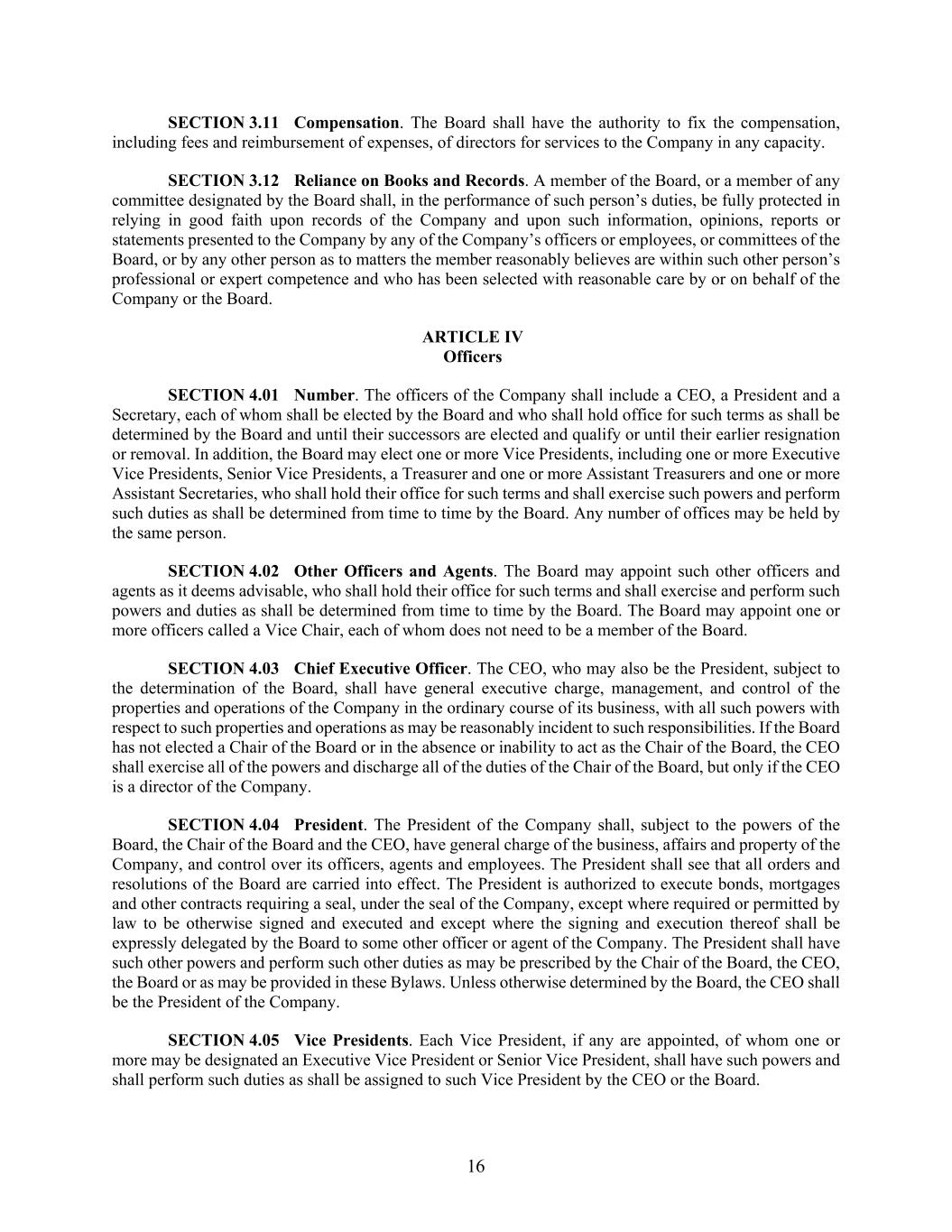 16 SECTION 3.11 Compensation. The Board shall have the authority to fix the compensation, including fees and reimbursement of expenses, of directors for services to the Company in any capacity. SECTION 3.12 Reliance on Books and Records. A member of the Board, or a member of any committee designated by the Board shall, in the performance of such person’s duties, be fully protected in relying in good faith upon records of the Company and upon such information, opinions, reports or statements presented to the Company by any of the Company’s officers or employees, or committees of the Board, or by any other person as to matters the member reasonably believes are within such other person’s professional or expert competence and who has been selected with reasonable care by or on behalf of the Company or the Board. ARTICLE IV Officers SECTION 4.01 Number. The officers of the Company shall include a CEO, a President and a Secretary, each of whom shall be elected by the Board and who shall hold office for such terms as shall be determined by the Board and until their successors are elected and qualify or until their earlier resignation or removal. In addition, the Board may elect one or more Vice Presidents, including one or more Executive Vice Presidents, Senior Vice Presidents, a Treasurer and one or more Assistant Treasurers and one or more Assistant Secretaries, who shall hold their office for such terms and shall exercise such powers and perform such duties as shall be determined from time to time by the Board. Any number of offices may be held by the same person. SECTION 4.02 Other Officers and Agents. The Board may appoint such other officers and agents as it deems advisable, who shall hold their office for such terms and shall exercise and perform such powers and duties as shall be determined from time to time by the Board. The Board may appoint one or more officers called a Vice Chair, each of whom does not need to be a member of the Board. SECTION 4.03 Chief Executive Officer. The CEO, who may also be the President, subject to the determination of the Board, shall have general executive charge, management, and control of the properties and operations of the Company in the ordinary course of its business, with all such powers with respect to such properties and operations as may be reasonably incident to such responsibilities. If the Board has not elected a Chair of the Board or in the absence or inability to act as the Chair of the Board, the CEO shall exercise all of the powers and discharge all of the duties of the Chair of the Board, but only if the CEO is a director of the Company. SECTION 4.04 President. The President of the Company shall, subject to the powers of the Board, the Chair of the Board and the CEO, have general charge of the business, affairs and property of the Company, and control over its officers, agents and employees. The President shall see that all orders and resolutions of the Board are carried into effect. The President is authorized to execute bonds, mortgages and other contracts requiring a seal, under the seal of the Company, except where required or permitted by law to be otherwise signed and executed and except where the signing and execution thereof shall be expressly delegated by the Board to some other officer or agent of the Company. The President shall have such other powers and perform such other duties as may be prescribed by the Chair of the Board, the CEO, the Board or as may be provided in these Bylaws. Unless otherwise determined by the Board, the CEO shall be the President of the Company. SECTION 4.05 Vice Presidents. Each Vice President, if any are appointed, of whom one or more may be designated an Executive Vice President or Senior Vice President, shall have such powers and shall perform such duties as shall be assigned to such Vice President by the CEO or the Board.