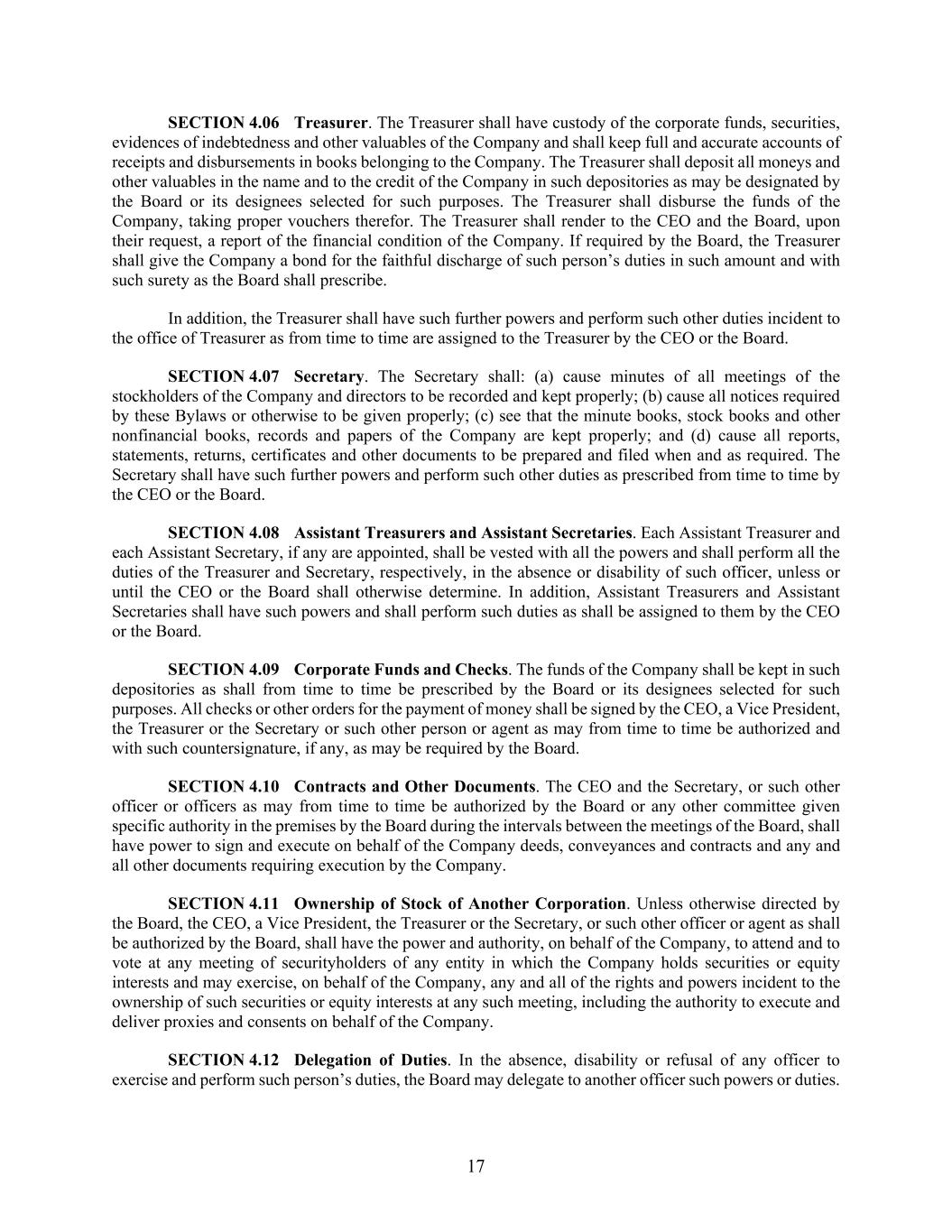 17 SECTION 4.06 Treasurer. The Treasurer shall have custody of the corporate funds, securities, evidences of indebtedness and other valuables of the Company and shall keep full and accurate accounts of receipts and disbursements in books belonging to the Company. The Treasurer shall deposit all moneys and other valuables in the name and to the credit of the Company in such depositories as may be designated by the Board or its designees selected for such purposes. The Treasurer shall disburse the funds of the Company, taking proper vouchers therefor. The Treasurer shall render to the CEO and the Board, upon their request, a report of the financial condition of the Company. If required by the Board, the Treasurer shall give the Company a bond for the faithful discharge of such person’s duties in such amount and with such surety as the Board shall prescribe. In addition, the Treasurer shall have such further powers and perform such other duties incident to the office of Treasurer as from time to time are assigned to the Treasurer by the CEO or the Board. SECTION 4.07 Secretary. The Secretary shall: (a) cause minutes of all meetings of the stockholders of the Company and directors to be recorded and kept properly; (b) cause all notices required by these Bylaws or otherwise to be given properly; (c) see that the minute books, stock books and other nonfinancial books, records and papers of the Company are kept properly; and (d) cause all reports, statements, returns, certificates and other documents to be prepared and filed when and as required. The Secretary shall have such further powers and perform such other duties as prescribed from time to time by the CEO or the Board. SECTION 4.08 Assistant Treasurers and Assistant Secretaries. Each Assistant Treasurer and each Assistant Secretary, if any are appointed, shall be vested with all the powers and shall perform all the duties of the Treasurer and Secretary, respectively, in the absence or disability of such officer, unless or until the CEO or the Board shall otherwise determine. In addition, Assistant Treasurers and Assistant Secretaries shall have such powers and shall perform such duties as shall be assigned to them by the CEO or the Board. SECTION 4.09 Corporate Funds and Checks. The funds of the Company shall be kept in such depositories as shall from time to time be prescribed by the Board or its designees selected for such purposes. All checks or other orders for the payment of money shall be signed by the CEO, a Vice President, the Treasurer or the Secretary or such other person or agent as may from time to time be authorized and with such countersignature, if any, as may be required by the Board. SECTION 4.10 Contracts and Other Documents. The CEO and the Secretary, or such other officer or officers as may from time to time be authorized by the Board or any other committee given specific authority in the premises by the Board during the intervals between the meetings of the Board, shall have power to sign and execute on behalf of the Company deeds, conveyances and contracts and any and all other documents requiring execution by the Company. SECTION 4.11 Ownership of Stock of Another Corporation. Unless otherwise directed by the Board, the CEO, a Vice President, the Treasurer or the Secretary, or such other officer or agent as shall be authorized by the Board, shall have the power and authority, on behalf of the Company, to attend and to vote at any meeting of securityholders of any entity in which the Company holds securities or equity interests and may exercise, on behalf of the Company, any and all of the rights and powers incident to the ownership of such securities or equity interests at any such meeting, including the authority to execute and deliver proxies and consents on behalf of the Company. SECTION 4.12 Delegation of Duties. In the absence, disability or refusal of any officer to exercise and perform such person’s duties, the Board may delegate to another officer such powers or duties.
