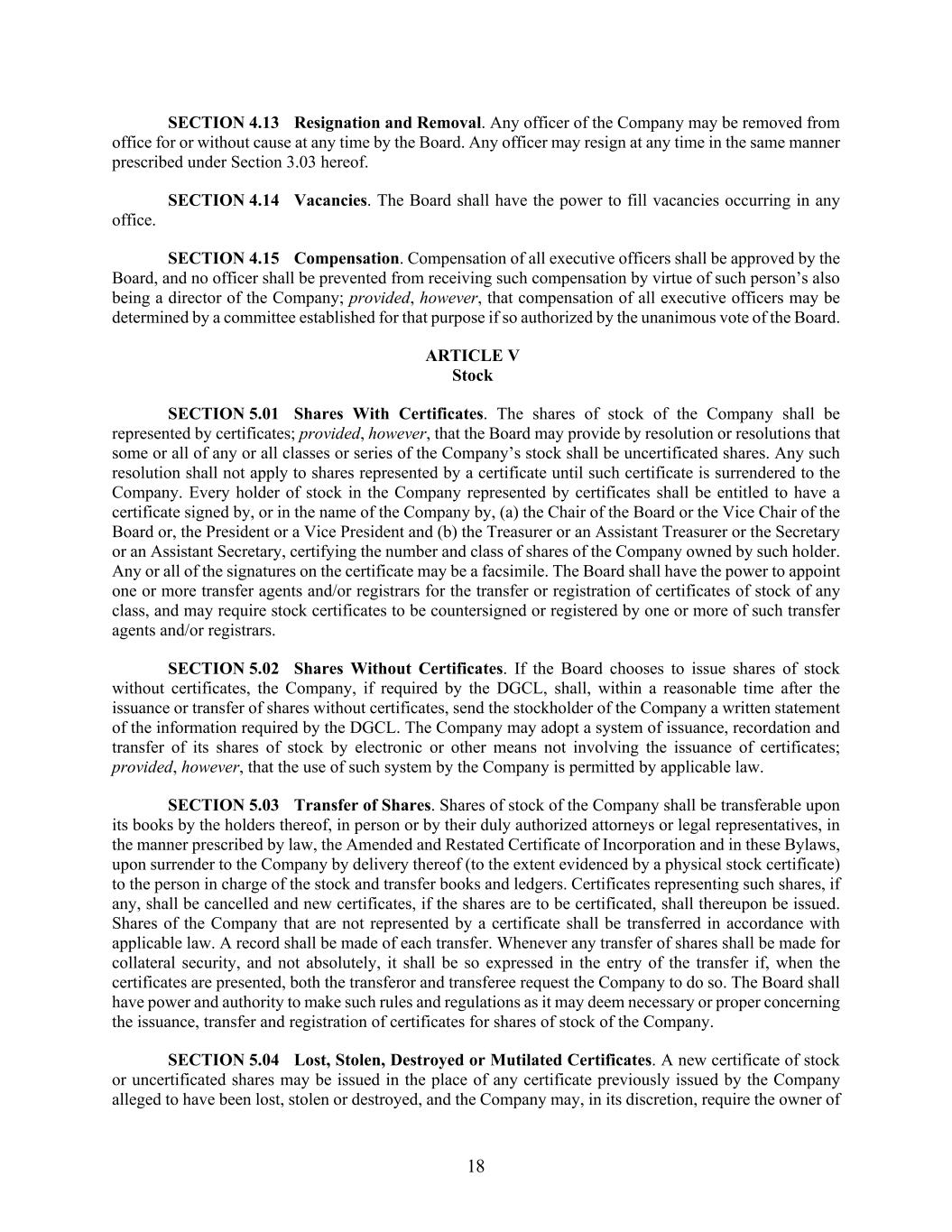 18 SECTION 4.13 Resignation and Removal. Any officer of the Company may be removed from office for or without cause at any time by the Board. Any officer may resign at any time in the same manner prescribed under Section 3.03 hereof. SECTION 4.14 Vacancies. The Board shall have the power to fill vacancies occurring in any office. SECTION 4.15 Compensation. Compensation of all executive officers shall be approved by the Board, and no officer shall be prevented from receiving such compensation by virtue of such person’s also being a director of the Company; provided, however, that compensation of all executive officers may be determined by a committee established for that purpose if so authorized by the unanimous vote of the Board. ARTICLE V Stock SECTION 5.01 Shares With Certificates. The shares of stock of the Company shall be represented by certificates; provided, however, that the Board may provide by resolution or resolutions that some or all of any or all classes or series of the Company’s stock shall be uncertificated shares. Any such resolution shall not apply to shares represented by a certificate until such certificate is surrendered to the Company. Every holder of stock in the Company represented by certificates shall be entitled to have a certificate signed by, or in the name of the Company by, (a) the Chair of the Board or the Vice Chair of the Board or, the President or a Vice President and (b) the Treasurer or an Assistant Treasurer or the Secretary or an Assistant Secretary, certifying the number and class of shares of the Company owned by such holder. Any or all of the signatures on the certificate may be a facsimile. The Board shall have the power to appoint one or more transfer agents and/or registrars for the transfer or registration of certificates of stock of any class, and may require stock certificates to be countersigned or registered by one or more of such transfer agents and/or registrars. SECTION 5.02 Shares Without Certificates. If the Board chooses to issue shares of stock without certificates, the Company, if required by the DGCL, shall, within a reasonable time after the issuance or transfer of shares without certificates, send the stockholder of the Company a written statement of the information required by the DGCL. The Company may adopt a system of issuance, recordation and transfer of its shares of stock by electronic or other means not involving the issuance of certificates; provided, however, that the use of such system by the Company is permitted by applicable law. SECTION 5.03 Transfer of Shares. Shares of stock of the Company shall be transferable upon its books by the holders thereof, in person or by their duly authorized attorneys or legal representatives, in the manner prescribed by law, the Amended and Restated Certificate of Incorporation and in these Bylaws, upon surrender to the Company by delivery thereof (to the extent evidenced by a physical stock certificate) to the person in charge of the stock and transfer books and ledgers. Certificates representing such shares, if any, shall be cancelled and new certificates, if the shares are to be certificated, shall thereupon be issued. Shares of the Company that are not represented by a certificate shall be transferred in accordance with applicable law. A record shall be made of each transfer. Whenever any transfer of shares shall be made for collateral security, and not absolutely, it shall be so expressed in the entry of the transfer if, when the certificates are presented, both the transferor and transferee request the Company to do so. The Board shall have power and authority to make such rules and regulations as it may deem necessary or proper concerning the issuance, transfer and registration of certificates for shares of stock of the Company. SECTION 5.04 Lost, Stolen, Destroyed or Mutilated Certificates. A new certificate of stock or uncertificated shares may be issued in the place of any certificate previously issued by the Company alleged to have been lost, stolen or destroyed, and the Company may, in its discretion, require the owner of