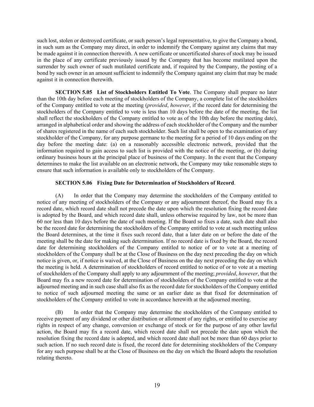 19 such lost, stolen or destroyed certificate, or such person’s legal representative, to give the Company a bond, in such sum as the Company may direct, in order to indemnify the Company against any claims that may be made against it in connection therewith. A new certificate or uncertificated shares of stock may be issued in the place of any certificate previously issued by the Company that has become mutilated upon the surrender by such owner of such mutilated certificate and, if required by the Company, the posting of a bond by such owner in an amount sufficient to indemnify the Company against any claim that may be made against it in connection therewith. SECTION 5.05 List of Stockholders Entitled To Vote. The Company shall prepare no later than the 10th day before each meeting of stockholders of the Company, a complete list of the stockholders of the Company entitled to vote at the meeting (provided, however, if the record date for determining the stockholders of the Company entitled to vote is less than 10 days before the date of the meeting, the list shall reflect the stockholders of the Company entitled to vote as of the 10th day before the meeting date), arranged in alphabetical order and showing the address of each stockholder of the Company and the number of shares registered in the name of each such stockholder. Such list shall be open to the examination of any stockholder of the Company, for any purpose germane to the meeting for a period of 10 days ending on the day before the meeting date: (a) on a reasonably accessible electronic network, provided that the information required to gain access to such list is provided with the notice of the meeting, or (b) during ordinary business hours at the principal place of business of the Company. In the event that the Company determines to make the list available on an electronic network, the Company may take reasonable steps to ensure that such information is available only to stockholders of the Company. SECTION 5.06 Fixing Date for Determination of Stockholders of Record. (A) In order that the Company may determine the stockholders of the Company entitled to notice of any meeting of stockholders of the Company or any adjournment thereof, the Board may fix a record date, which record date shall not precede the date upon which the resolution fixing the record date is adopted by the Board, and which record date shall, unless otherwise required by law, not be more than 60 nor less than 10 days before the date of such meeting. If the Board so fixes a date, such date shall also be the record date for determining the stockholders of the Company entitled to vote at such meeting unless the Board determines, at the time it fixes such record date, that a later date on or before the date of the meeting shall be the date for making such determination. If no record date is fixed by the Board, the record date for determining stockholders of the Company entitled to notice of or to vote at a meeting of stockholders of the Company shall be at the Close of Business on the day next preceding the day on which notice is given, or, if notice is waived, at the Close of Business on the day next preceding the day on which the meeting is held. A determination of stockholders of record entitled to notice of or to vote at a meeting of stockholders of the Company shall apply to any adjournment of the meeting; provided, however, that the Board may fix a new record date for determination of stockholders of the Company entitled to vote at the adjourned meeting and in such case shall also fix as the record date for stockholders of the Company entitled to notice of such adjourned meeting the same or an earlier date as that fixed for determination of stockholders of the Company entitled to vote in accordance herewith at the adjourned meeting. (B) In order that the Company may determine the stockholders of the Company entitled to receive payment of any dividend or other distribution or allotment of any rights, or entitled to exercise any rights in respect of any change, conversion or exchange of stock or for the purpose of any other lawful action, the Board may fix a record date, which record date shall not precede the date upon which the resolution fixing the record date is adopted, and which record date shall not be more than 60 days prior to such action. If no such record date is fixed, the record date for determining stockholders of the Company for any such purpose shall be at the Close of Business on the day on which the Board adopts the resolution relating thereto.