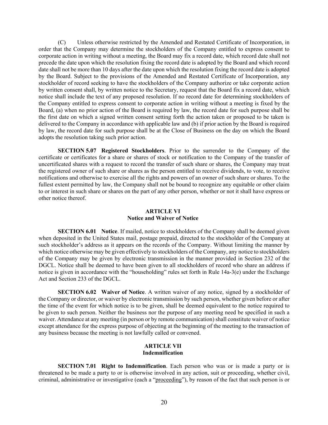 20 (C) Unless otherwise restricted by the Amended and Restated Certificate of Incorporation, in order that the Company may determine the stockholders of the Company entitled to express consent to corporate action in writing without a meeting, the Board may fix a record date, which record date shall not precede the date upon which the resolution fixing the record date is adopted by the Board and which record date shall not be more than 10 days after the date upon which the resolution fixing the record date is adopted by the Board. Subject to the provisions of the Amended and Restated Certificate of Incorporation, any stockholder of record seeking to have the stockholders of the Company authorize or take corporate action by written consent shall, by written notice to the Secretary, request that the Board fix a record date, which notice shall include the text of any proposed resolution. If no record date for determining stockholders of the Company entitled to express consent to corporate action in writing without a meeting is fixed by the Board, (a) when no prior action of the Board is required by law, the record date for such purpose shall be the first date on which a signed written consent setting forth the action taken or proposed to be taken is delivered to the Company in accordance with applicable law and (b) if prior action by the Board is required by law, the record date for such purpose shall be at the Close of Business on the day on which the Board adopts the resolution taking such prior action. SECTION 5.07 Registered Stockholders. Prior to the surrender to the Company of the certificate or certificates for a share or shares of stock or notification to the Company of the transfer of uncertificated shares with a request to record the transfer of such share or shares, the Company may treat the registered owner of such share or shares as the person entitled to receive dividends, to vote, to receive notifications and otherwise to exercise all the rights and powers of an owner of such share or shares. To the fullest extent permitted by law, the Company shall not be bound to recognize any equitable or other claim to or interest in such share or shares on the part of any other person, whether or not it shall have express or other notice thereof. ARTICLE VI Notice and Waiver of Notice SECTION 6.01 Notice. If mailed, notice to stockholders of the Company shall be deemed given when deposited in the United States mail, postage prepaid, directed to the stockholder of the Company at such stockholder’s address as it appears on the records of the Company. Without limiting the manner by which notice otherwise may be given effectively to stockholders of the Company, any notice to stockholders of the Company may be given by electronic transmission in the manner provided in Section 232 of the DGCL. Notice shall be deemed to have been given to all stockholders of record who share an address if notice is given in accordance with the “householding” rules set forth in Rule 14a-3(e) under the Exchange Act and Section 233 of the DGCL. SECTION 6.02 Waiver of Notice. A written waiver of any notice, signed by a stockholder of the Company or director, or waiver by electronic transmission by such person, whether given before or after the time of the event for which notice is to be given, shall be deemed equivalent to the notice required to be given to such person. Neither the business nor the purpose of any meeting need be specified in such a waiver. Attendance at any meeting (in person or by remote communication) shall constitute waiver of notice except attendance for the express purpose of objecting at the beginning of the meeting to the transaction of any business because the meeting is not lawfully called or convened. ARTICLE VII Indemnification SECTION 7.01 Right to Indemnification. Each person who was or is made a party or is threatened to be made a party to or is otherwise involved in any action, suit or proceeding, whether civil, criminal, administrative or investigative (each a “proceeding”), by reason of the fact that such person is or