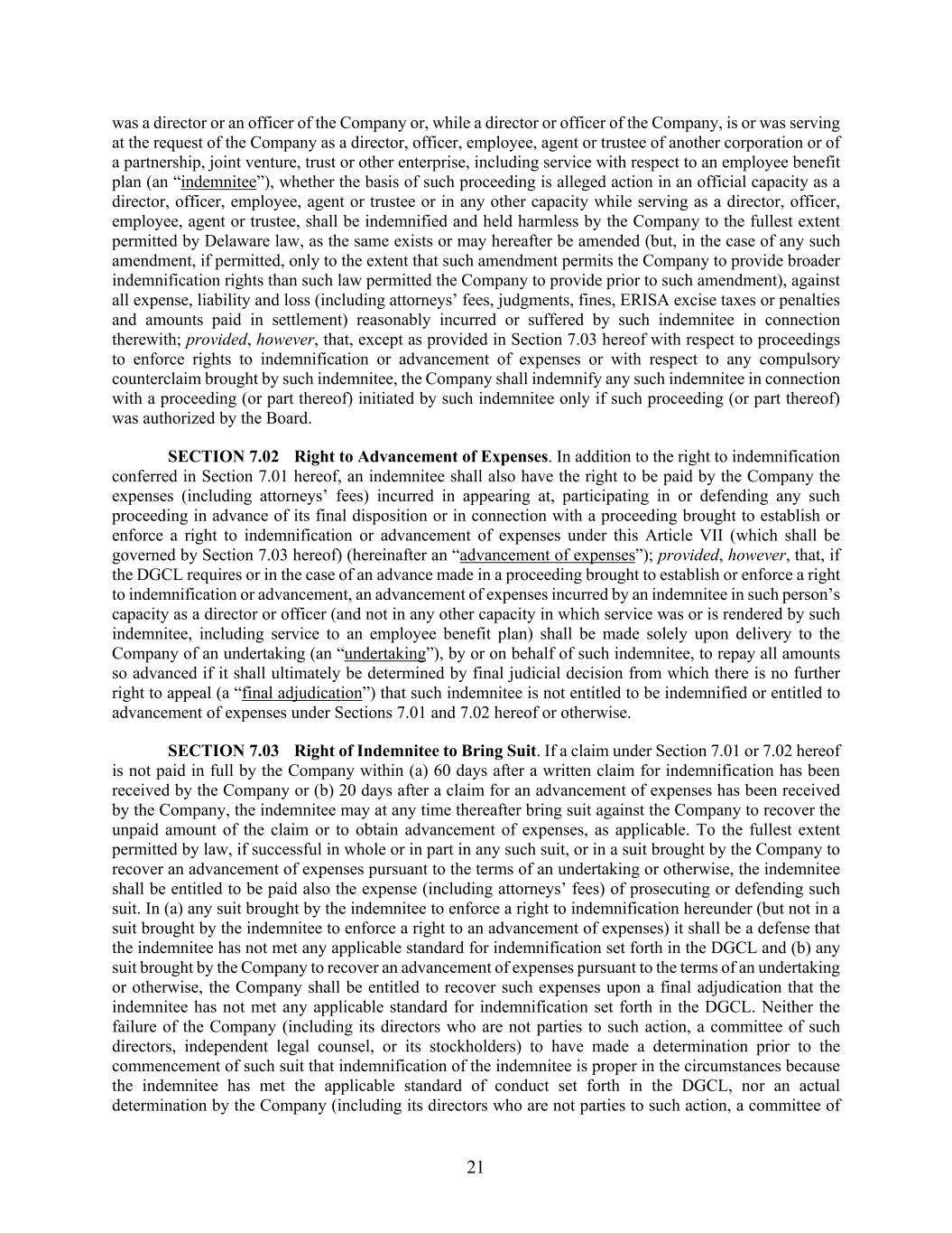 21 was a director or an officer of the Company or, while a director or officer of the Company, is or was serving at the request of the Company as a director, officer, employee, agent or trustee of another corporation or of a partnership, joint venture, trust or other enterprise, including service with respect to an employee benefit plan (an “indemnitee”), whether the basis of such proceeding is alleged action in an official capacity as a director, officer, employee, agent or trustee or in any other capacity while serving as a director, officer, employee, agent or trustee, shall be indemnified and held harmless by the Company to the fullest extent permitted by Delaware law, as the same exists or may hereafter be amended (but, in the case of any such amendment, if permitted, only to the extent that such amendment permits the Company to provide broader indemnification rights than such law permitted the Company to provide prior to such amendment), against all expense, liability and loss (including attorneys’ fees, judgments, fines, ERISA excise taxes or penalties and amounts paid in settlement) reasonably incurred or suffered by such indemnitee in connection therewith; provided, however, that, except as provided in Section 7.03 hereof with respect to proceedings to enforce rights to indemnification or advancement of expenses or with respect to any compulsory counterclaim brought by such indemnitee, the Company shall indemnify any such indemnitee in connection with a proceeding (or part thereof) initiated by such indemnitee only if such proceeding (or part thereof) was authorized by the Board. SECTION 7.02 Right to Advancement of Expenses. In addition to the right to indemnification conferred in Section 7.01 hereof, an indemnitee shall also have the right to be paid by the Company the expenses (including attorneys’ fees) incurred in appearing at, participating in or defending any such proceeding in advance of its final disposition or in connection with a proceeding brought to establish or enforce a right to indemnification or advancement of expenses under this Article VII (which shall be governed by Section 7.03 hereof) (hereinafter an “advancement of expenses”); provided, however, that, if the DGCL requires or in the case of an advance made in a proceeding brought to establish or enforce a right to indemnification or advancement, an advancement of expenses incurred by an indemnitee in such person’s capacity as a director or officer (and not in any other capacity in which service was or is rendered by such indemnitee, including service to an employee benefit plan) shall be made solely upon delivery to the Company of an undertaking (an “undertaking”), by or on behalf of such indemnitee, to repay all amounts so advanced if it shall ultimately be determined by final judicial decision from which there is no further right to appeal (a “final adjudication”) that such indemnitee is not entitled to be indemnified or entitled to advancement of expenses under Sections 7.01 and 7.02 hereof or otherwise. SECTION 7.03 Right of Indemnitee to Bring Suit. If a claim under Section 7.01 or 7.02 hereof is not paid in full by the Company within (a) 60 days after a written claim for indemnification has been received by the Company or (b) 20 days after a claim for an advancement of expenses has been received by the Company, the indemnitee may at any time thereafter bring suit against the Company to recover the unpaid amount of the claim or to obtain advancement of expenses, as applicable. To the fullest extent permitted by law, if successful in whole or in part in any such suit, or in a suit brought by the Company to recover an advancement of expenses pursuant to the terms of an undertaking or otherwise, the indemnitee shall be entitled to be paid also the expense (including attorneys’ fees) of prosecuting or defending such suit. In (a) any suit brought by the indemnitee to enforce a right to indemnification hereunder (but not in a suit brought by the indemnitee to enforce a right to an advancement of expenses) it shall be a defense that the indemnitee has not met any applicable standard for indemnification set forth in the DGCL and (b) any suit brought by the Company to recover an advancement of expenses pursuant to the terms of an undertaking or otherwise, the Company shall be entitled to recover such expenses upon a final adjudication that the indemnitee has not met any applicable standard for indemnification set forth in the DGCL. Neither the failure of the Company (including its directors who are not parties to such action, a committee of such directors, independent legal counsel, or its stockholders) to have made a determination prior to the commencement of such suit that indemnification of the indemnitee is proper in the circumstances because the indemnitee has met the applicable standard of conduct set forth in the DGCL, nor an actual determination by the Company (including its directors who are not parties to such action, a committee of