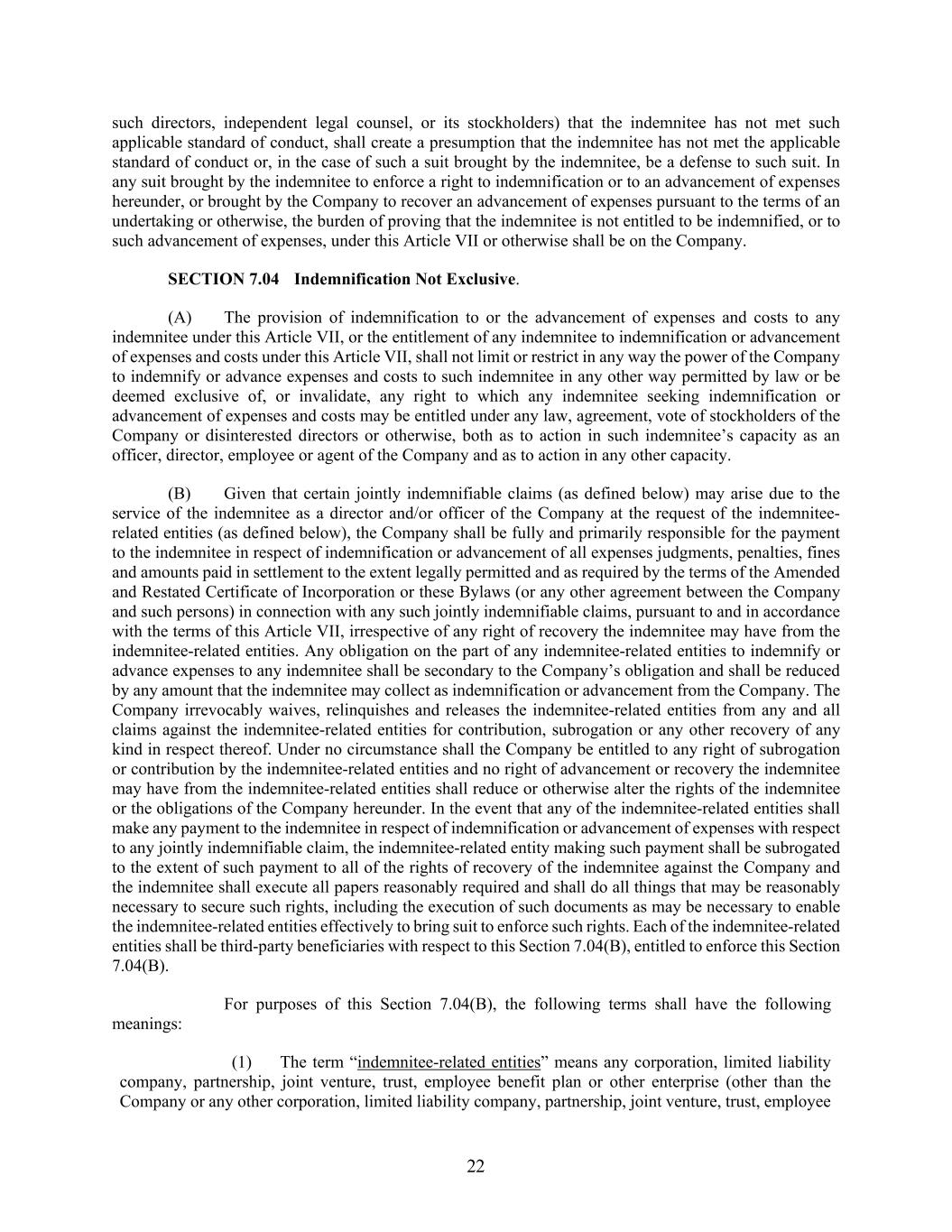 22 such directors, independent legal counsel, or its stockholders) that the indemnitee has not met such applicable standard of conduct, shall create a presumption that the indemnitee has not met the applicable standard of conduct or, in the case of such a suit brought by the indemnitee, be a defense to such suit. In any suit brought by the indemnitee to enforce a right to indemnification or to an advancement of expenses hereunder, or brought by the Company to recover an advancement of expenses pursuant to the terms of an undertaking or otherwise, the burden of proving that the indemnitee is not entitled to be indemnified, or to such advancement of expenses, under this Article VII or otherwise shall be on the Company. SECTION 7.04 Indemnification Not Exclusive. (A) The provision of indemnification to or the advancement of expenses and costs to any indemnitee under this Article VII, or the entitlement of any indemnitee to indemnification or advancement of expenses and costs under this Article VII, shall not limit or restrict in any way the power of the Company to indemnify or advance expenses and costs to such indemnitee in any other way permitted by law or be deemed exclusive of, or invalidate, any right to which any indemnitee seeking indemnification or advancement of expenses and costs may be entitled under any law, agreement, vote of stockholders of the Company or disinterested directors or otherwise, both as to action in such indemnitee’s capacity as an officer, director, employee or agent of the Company and as to action in any other capacity. (B) Given that certain jointly indemnifiable claims (as defined below) may arise due to the service of the indemnitee as a director and/or officer of the Company at the request of the indemnitee- related entities (as defined below), the Company shall be fully and primarily responsible for the payment to the indemnitee in respect of indemnification or advancement of all expenses judgments, penalties, fines and amounts paid in settlement to the extent legally permitted and as required by the terms of the Amended and Restated Certificate of Incorporation or these Bylaws (or any other agreement between the Company and such persons) in connection with any such jointly indemnifiable claims, pursuant to and in accordance with the terms of this Article VII, irrespective of any right of recovery the indemnitee may have from the indemnitee-related entities. Any obligation on the part of any indemnitee-related entities to indemnify or advance expenses to any indemnitee shall be secondary to the Company’s obligation and shall be reduced by any amount that the indemnitee may collect as indemnification or advancement from the Company. The Company irrevocably waives, relinquishes and releases the indemnitee-related entities from any and all claims against the indemnitee-related entities for contribution, subrogation or any other recovery of any kind in respect thereof. Under no circumstance shall the Company be entitled to any right of subrogation or contribution by the indemnitee-related entities and no right of advancement or recovery the indemnitee may have from the indemnitee-related entities shall reduce or otherwise alter the rights of the indemnitee or the obligations of the Company hereunder. In the event that any of the indemnitee-related entities shall make any payment to the indemnitee in respect of indemnification or advancement of expenses with respect to any jointly indemnifiable claim, the indemnitee-related entity making such payment shall be subrogated to the extent of such payment to all of the rights of recovery of the indemnitee against the Company and the indemnitee shall execute all papers reasonably required and shall do all things that may be reasonably necessary to secure such rights, including the execution of such documents as may be necessary to enable the indemnitee-related entities effectively to bring suit to enforce such rights. Each of the indemnitee-related entities shall be third-party beneficiaries with respect to this Section 7.04(B), entitled to enforce this Section 7.04(B). For purposes of this Section 7.04(B), the following terms shall have the following meanings: (1) The term “indemnitee-related entities” means any corporation, limited liability company, partnership, joint venture, trust, employee benefit plan or other enterprise (other than the Company or any other corporation, limited liability company, partnership, joint venture, trust, employee