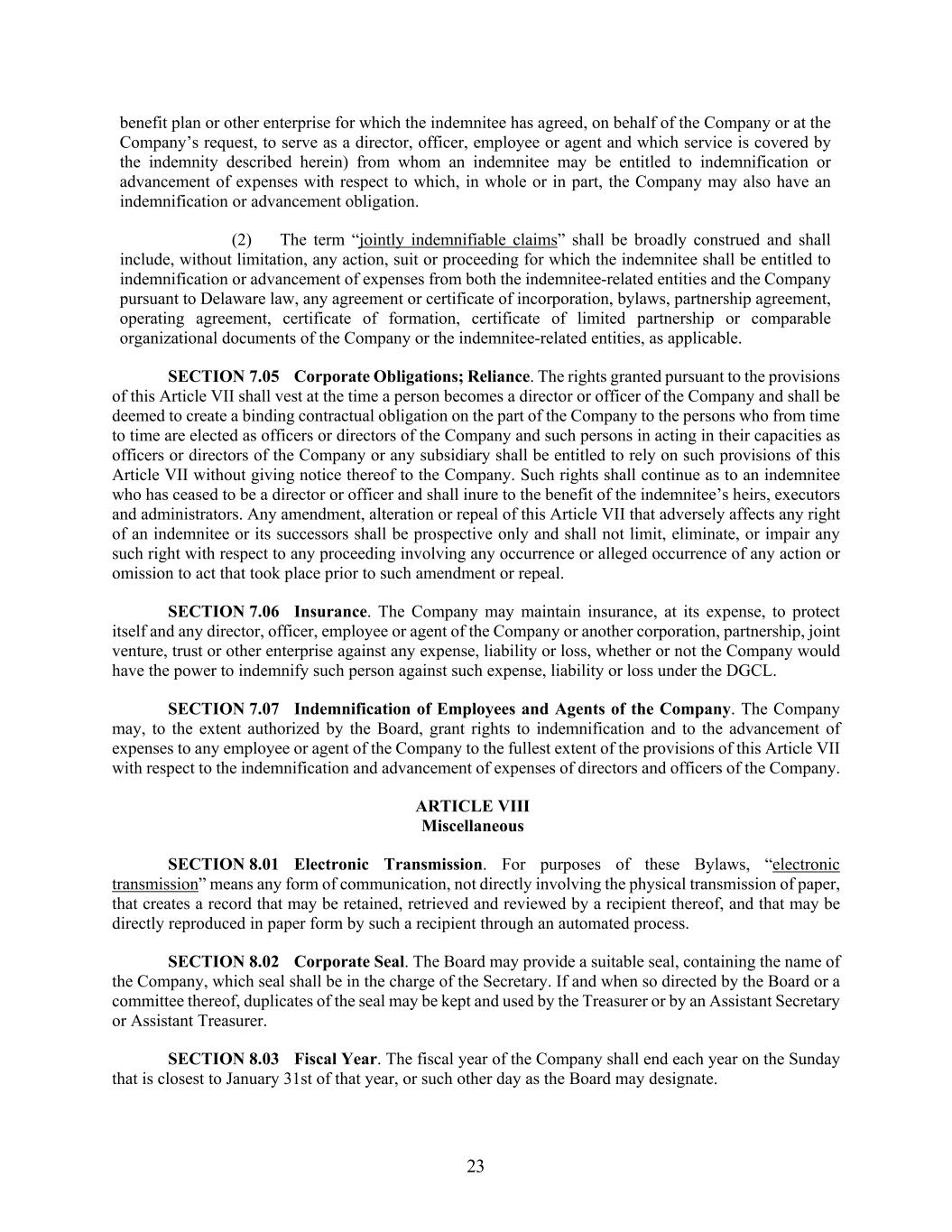 23 benefit plan or other enterprise for which the indemnitee has agreed, on behalf of the Company or at the Company’s request, to serve as a director, officer, employee or agent and which service is covered by the indemnity described herein) from whom an indemnitee may be entitled to indemnification or advancement of expenses with respect to which, in whole or in part, the Company may also have an indemnification or advancement obligation. (2) The term “jointly indemnifiable claims” shall be broadly construed and shall include, without limitation, any action, suit or proceeding for which the indemnitee shall be entitled to indemnification or advancement of expenses from both the indemnitee-related entities and the Company pursuant to Delaware law, any agreement or certificate of incorporation, bylaws, partnership agreement, operating agreement, certificate of formation, certificate of limited partnership or comparable organizational documents of the Company or the indemnitee-related entities, as applicable. SECTION 7.05 Corporate Obligations; Reliance. The rights granted pursuant to the provisions of this Article VII shall vest at the time a person becomes a director or officer of the Company and shall be deemed to create a binding contractual obligation on the part of the Company to the persons who from time to time are elected as officers or directors of the Company and such persons in acting in their capacities as officers or directors of the Company or any subsidiary shall be entitled to rely on such provisions of this Article VII without giving notice thereof to the Company. Such rights shall continue as to an indemnitee who has ceased to be a director or officer and shall inure to the benefit of the indemnitee’s heirs, executors and administrators. Any amendment, alteration or repeal of this Article VII that adversely affects any right of an indemnitee or its successors shall be prospective only and shall not limit, eliminate, or impair any such right with respect to any proceeding involving any occurrence or alleged occurrence of any action or omission to act that took place prior to such amendment or repeal. SECTION 7.06 Insurance. The Company may maintain insurance, at its expense, to protect itself and any director, officer, employee or agent of the Company or another corporation, partnership, joint venture, trust or other enterprise against any expense, liability or loss, whether or not the Company would have the power to indemnify such person against such expense, liability or loss under the DGCL. SECTION 7.07 Indemnification of Employees and Agents of the Company. The Company may, to the extent authorized by the Board, grant rights to indemnification and to the advancement of expenses to any employee or agent of the Company to the fullest extent of the provisions of this Article VII with respect to the indemnification and advancement of expenses of directors and officers of the Company. ARTICLE VIII Miscellaneous SECTION 8.01 Electronic Transmission. For purposes of these Bylaws, “electronic transmission” means any form of communication, not directly involving the physical transmission of paper, that creates a record that may be retained, retrieved and reviewed by a recipient thereof, and that may be directly reproduced in paper form by such a recipient through an automated process. SECTION 8.02 Corporate Seal. The Board may provide a suitable seal, containing the name of the Company, which seal shall be in the charge of the Secretary. If and when so directed by the Board or a committee thereof, duplicates of the seal may be kept and used by the Treasurer or by an Assistant Secretary or Assistant Treasurer. SECTION 8.03 Fiscal Year. The fiscal year of the Company shall end each year on the Sunday that is closest to January 31st of that year, or such other day as the Board may designate.