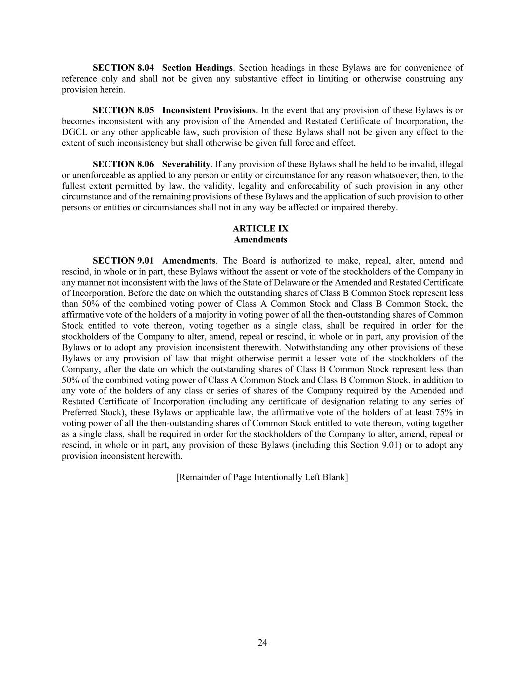 24 SECTION 8.04 Section Headings. Section headings in these Bylaws are for convenience of reference only and shall not be given any substantive effect in limiting or otherwise construing any provision herein. SECTION 8.05 Inconsistent Provisions. In the event that any provision of these Bylaws is or becomes inconsistent with any provision of the Amended and Restated Certificate of Incorporation, the DGCL or any other applicable law, such provision of these Bylaws shall not be given any effect to the extent of such inconsistency but shall otherwise be given full force and effect. SECTION 8.06 Severability. If any provision of these Bylaws shall be held to be invalid, illegal or unenforceable as applied to any person or entity or circumstance for any reason whatsoever, then, to the fullest extent permitted by law, the validity, legality and enforceability of such provision in any other circumstance and of the remaining provisions of these Bylaws and the application of such provision to other persons or entities or circumstances shall not in any way be affected or impaired thereby. ARTICLE IX Amendments SECTION 9.01 Amendments. The Board is authorized to make, repeal, alter, amend and rescind, in whole or in part, these Bylaws without the assent or vote of the stockholders of the Company in any manner not inconsistent with the laws of the State of Delaware or the Amended and Restated Certificate of Incorporation. Before the date on which the outstanding shares of Class B Common Stock represent less than 50% of the combined voting power of Class A Common Stock and Class B Common Stock, the affirmative vote of the holders of a majority in voting power of all the then-outstanding shares of Common Stock entitled to vote thereon, voting together as a single class, shall be required in order for the stockholders of the Company to alter, amend, repeal or rescind, in whole or in part, any provision of the Bylaws or to adopt any provision inconsistent therewith. Notwithstanding any other provisions of these Bylaws or any provision of law that might otherwise permit a lesser vote of the stockholders of the Company, after the date on which the outstanding shares of Class B Common Stock represent less than 50% of the combined voting power of Class A Common Stock and Class B Common Stock, in addition to any vote of the holders of any class or series of shares of the Company required by the Amended and Restated Certificate of Incorporation (including any certificate of designation relating to any series of Preferred Stock), these Bylaws or applicable law, the affirmative vote of the holders of at least 75% in voting power of all the then-outstanding shares of Common Stock entitled to vote thereon, voting together as a single class, shall be required in order for the stockholders of the Company to alter, amend, repeal or rescind, in whole or in part, any provision of these Bylaws (including this Section 9.01) or to adopt any provision inconsistent herewith. [Remainder of Page Intentionally Left Blank]