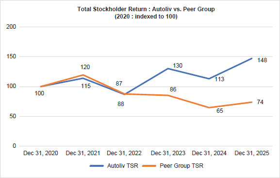 The following chart shows Autoliv’s cumulative TSR in comparison to the cumulative TSR of our selected peer group. The peer group selected for purposes of this disclosure is the Dow Jones U.S. Auto Parts Index (DJUSA-DJX), which is float market capitalization-weighted and aims to provide 95% market capitalization coverage of U.S.-traded stocks for the Auto Parts Subsection (3355). The companies included in the index are Tier 1 and Tier 2 suppliers of non-safety products to the automotive industry and are producers of very different offerings such as drivetrains, electronic and technology systems, fuel systems and many have after-market businesses. This index includes several companies included in our compensation benchmarking for our U.S. based executives.