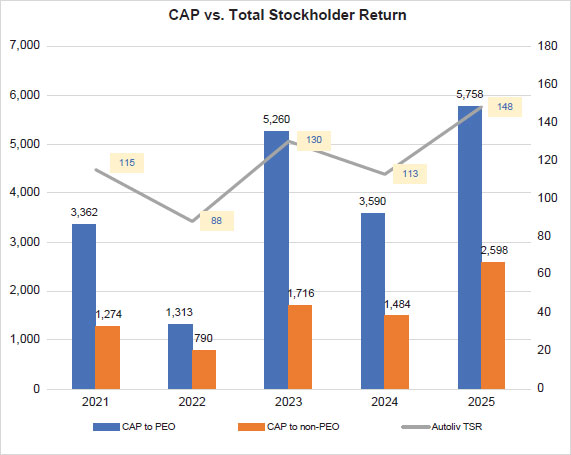 The following chart shows the correlation between CAP to our CEO and average CAP to our non-PEO NEOs in comparison to Autoliv’s cumulative TSR. A significant part of our NEOs compensation structure is stock based and changes in TSR thus have a strong correlation with CAP. During the measurement period, each year with reduction in TSR resulted in reduction in CAP, and vice versa.
