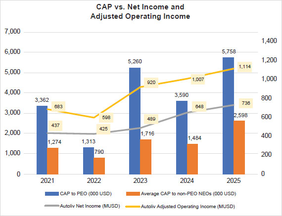 | Compensation Actually Paid vs. Net Income | CAP VS. NET INCOME and ADJUSTED OPERATING INCOME The following chart shows the correlation between CAP to our CEO and average CAP to our non-PEO NEOs in comparison to Autoliv’s Net Income and Adjusted Operating Income.