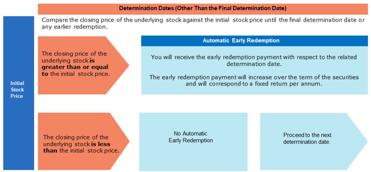 | Automatic early redemption: | If, on any of the determination dates (other than the final determination date), the closing price of the underlying stock is greater than or equal to the initial stock price, the securities will be automatically redeemed for a cash payment equal to the early redemption payment payable on the applicable redemption date. | ||||