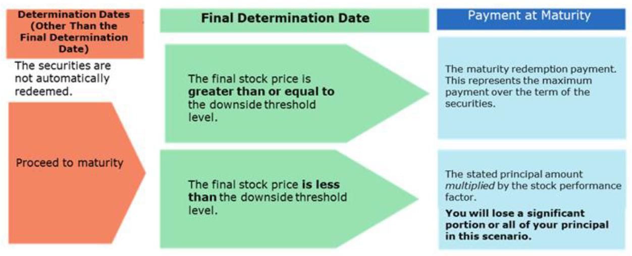 The securities have not been previously automatically redeemed and the final stock price is less than the downside threshold level. § The payment due at maturity will be (i) the stated principal amount multiplied by (ii) the stock performance factor. § Investors will lose more than 50% and possibly all of their principal in this scenario. |