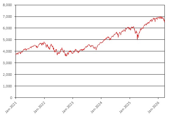 We obtained the information regarding the historical performance of the reference asset in the graph below from Bloomberg, without independent review or verification. The graph below illustrates the performance of the reference asset from January 1, 2021 through March 23, 2026. The closing level of the reference asset on March 23, 2026 was 6,581.00.