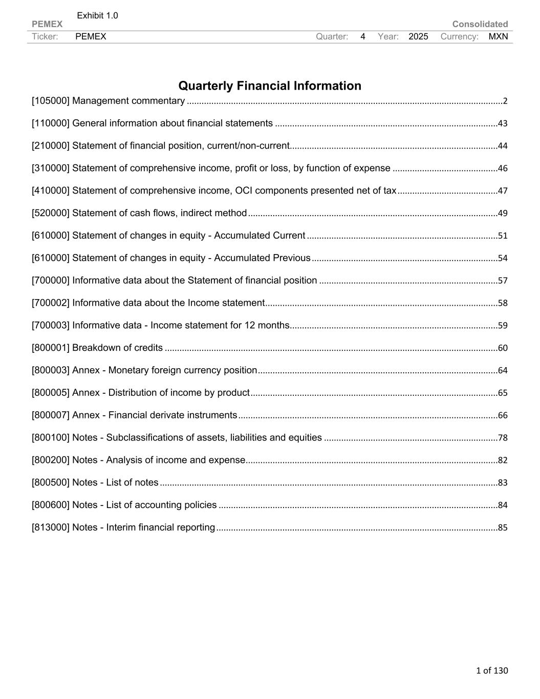 PEMEX Consolidated Ticker: PEMEX Quarter: 4 Year: 2025 Currency: MXN 1 of 130 Quarterly Financial Information [105000] Management commentary .................................................................................................................................2 [110000] General information about financial statements ...........................................................................................43 [210000] Statement of financial position, current/non-current.....................................................................................44 [310000] Statement of comprehensive income, profit or loss, by function of expense ...........................................46 [410000] Statement of comprehensive income, OCI components presented net of tax .........................................47 [520000] Statement of cash flows, indirect method ......................................................................................................49 [610000] Statement of changes in equity - Accumulated Current ..............................................................................51 [610000] Statement of changes in equity - Accumulated Previous ............................................................................54 [700000] Informative data about the Statement of financial position .........................................................................57 [700002] Informative data about the Income statement...............................................................................................58 [700003] Informative data - Income statement for 12 months.....................................................................................59 [800001] Breakdown of credits ........................................................................................................................................60 [800003] Annex - Monetary foreign currency position..................................................................................................64 [800005] Annex - Distribution of income by product .....................................................................................................65 [800007] Annex - Financial derivate instruments ..........................................................................................................66 [800100] Notes - Subclassifications of assets, liabilities and equities .......................................................................78 [800200] Notes - Analysis of income and expense.......................................................................................................82 [800500] Notes - List of notes ..........................................................................................................................................83 [800600] Notes - List of accounting policies ..................................................................................................................84 [813000] Notes - Interim financial reporting ...................................................................................................................85 Exhibit 1.0