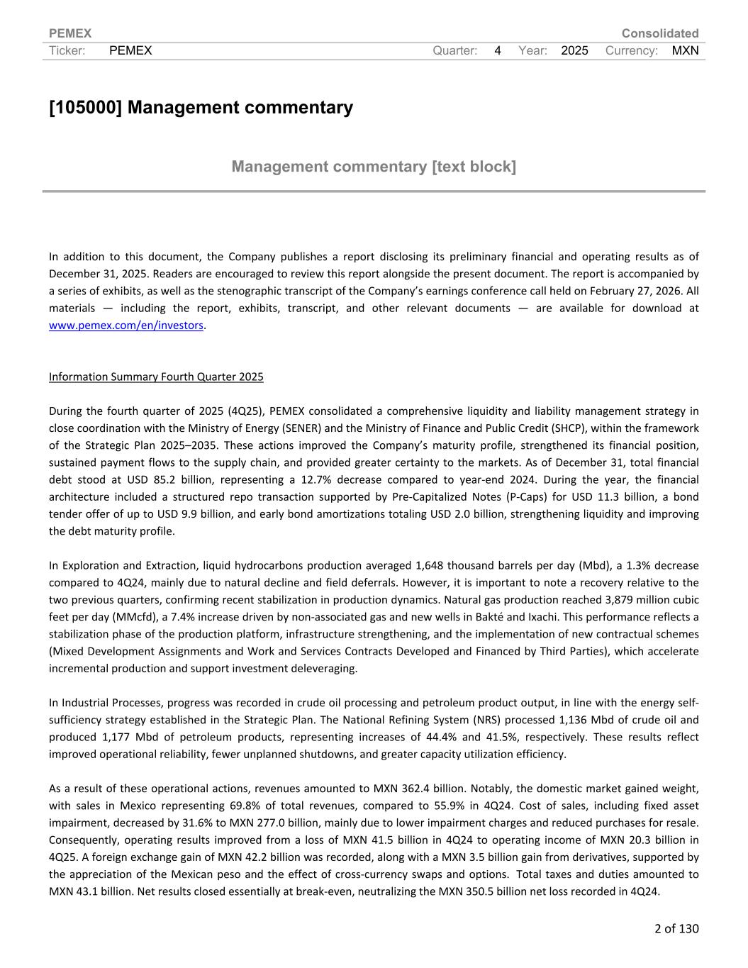 PEMEX Consolidated Ticker: PEMEX Quarter: 4 Year: 2025 Currency: MXN 2 of 130 [105000] Management commentary Management commentary [text block] In addition to this document, the Company publishes a report disclosing its preliminary financial and operating results as of December 31, 2025. Readers are encouraged to review this report alongside the present document. The report is accompanied by a series of exhibits, as well as the stenographic transcript of the Company’s earnings conference call held on February 27, 2026. All materials — including the report, exhibits, transcript, and other relevant documents — are available for download at www.pemex.com/en/investors. Information Summary Fourth Quarter 2025 During the fourth quarter of 2025 (4Q25), PEMEX consolidated a comprehensive liquidity and liability management strategy in close coordination with the Ministry of Energy (SENER) and the Ministry of Finance and Public Credit (SHCP), within the framework of the Strategic Plan 2025–2035. These actions improved the Company’s maturity profile, strengthened its financial position, sustained payment flows to the supply chain, and provided greater certainty to the markets. As of December 31, total financial debt stood at USD 85.2 billion, representing a 12.7% decrease compared to year-end 2024. During the year, the financial architecture included a structured repo transaction supported by Pre-Capitalized Notes (P-Caps) for USD 11.3 billion, a bond tender offer of up to USD 9.9 billion, and early bond amortizations totaling USD 2.0 billion, strengthening liquidity and improving the debt maturity profile. In Exploration and Extraction, liquid hydrocarbons production averaged 1,648 thousand barrels per day (Mbd), a 1.3% decrease compared to 4Q24, mainly due to natural decline and field deferrals. However, it is important to note a recovery relative to the two previous quarters, confirming recent stabilization in production dynamics. Natural gas production reached 3,879 million cubic feet per day (MMcfd), a 7.4% increase driven by non-associated gas and new wells in Bakté and Ixachi. This performance reflects a stabilization phase of the production platform, infrastructure strengthening, and the implementation of new contractual schemes (Mixed Development Assignments and Work and Services Contracts Developed and Financed by Third Parties), which accelerate incremental production and support investment deleveraging. In Industrial Processes, progress was recorded in crude oil processing and petroleum product output, in line with the energy self- sufficiency strategy established in the Strategic Plan. The National Refining System (NRS) processed 1,136 Mbd of crude oil and produced 1,177 Mbd of petroleum products, representing increases of 44.4% and 41.5%, respectively. These results reflect improved operational reliability, fewer unplanned shutdowns, and greater capacity utilization efficiency. As a result of these operational actions, revenues amounted to MXN 362.4 billion. Notably, the domestic market gained weight, with sales in Mexico representing 69.8% of total revenues, compared to 55.9% in 4Q24. Cost of sales, including fixed asset impairment, decreased by 31.6% to MXN 277.0 billion, mainly due to lower impairment charges and reduced purchases for resale. Consequently, operating results improved from a loss of MXN 41.5 billion in 4Q24 to operating income of MXN 20.3 billion in 4Q25. A foreign exchange gain of MXN 42.2 billion was recorded, along with a MXN 3.5 billion gain from derivatives, supported by the appreciation of the Mexican peso and the effect of cross-currency swaps and options. Total taxes and duties amounted to MXN 43.1 billion. Net results closed essentially at break-even, neutralizing the MXN 350.5 billion net loss recorded in 4Q24.