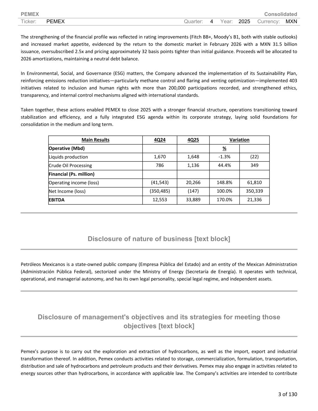 PEMEX Consolidated Ticker: PEMEX Quarter: 4 Year: 2025 Currency: MXN 3 of 130 The strengthening of the financial profile was reflected in rating improvements (Fitch BB+, Moody’s B1, both with stable outlooks) and increased market appetite, evidenced by the return to the domestic market in February 2026 with a MXN 31.5 billion issuance, oversubscribed 2.5x and pricing approximately 32 basis points tighter than initial guidance. Proceeds will be allocated to 2026 amortizations, maintaining a neutral debt balance. In Environmental, Social, and Governance (ESG) matters, the Company advanced the implementation of its Sustainability Plan, reinforcing emissions reduction initiatives—particularly methane control and flaring and venting optimization—implemented 403 initiatives related to inclusion and human rights with more than 200,000 participations recorded, and strengthened ethics, transparency, and internal control mechanisms aligned with international standards. Taken together, these actions enabled PEMEX to close 2025 with a stronger financial structure, operations transitioning toward stabilization and efficiency, and a fully integrated ESG agenda within its corporate strategy, laying solid foundations for consolidation in the medium and long term. Main Results 4Q24 4Q25 Variation Operative (Mbd) % Liquids production 1,670 1,648 -1.3% (22) Crude Oil Processing 786 1,136 44.4% 349 Financial (Ps. million) Operating income (loss) (41,543) 20,266 148.8% 61,810 Net Income (loss) (350,485) (147) 100.0% 350,339 EBITDA 12,553 33,889 170.0% 21,336 Disclosure of nature of business [text block] Petróleos Mexicanos is a state-owned public company (Empresa Pública del Estado) and an entity of the Mexican Administration (Administración Pública Federal), sectorized under the Ministry of Energy (Secretaría de Energía). It operates with technical, operational, and managerial autonomy, and has its own legal personality, special legal regime, and independent assets. Disclosure of management's objectives and its strategies for meeting those objectives [text block] Pemex’s purpose is to carry out the exploration and extraction of hydrocarbons, as well as the import, export and industrial transformation thereof. In addition, Pemex conducts activities related to storage, commercialization, formulation, transportation, distribution and sale of hydrocarbons and petroleum products and their derivatives. Pemex may also engage in activities related to energy sources other than hydrocarbons, in accordance with applicable law. The Company’s activities are intended to contribute