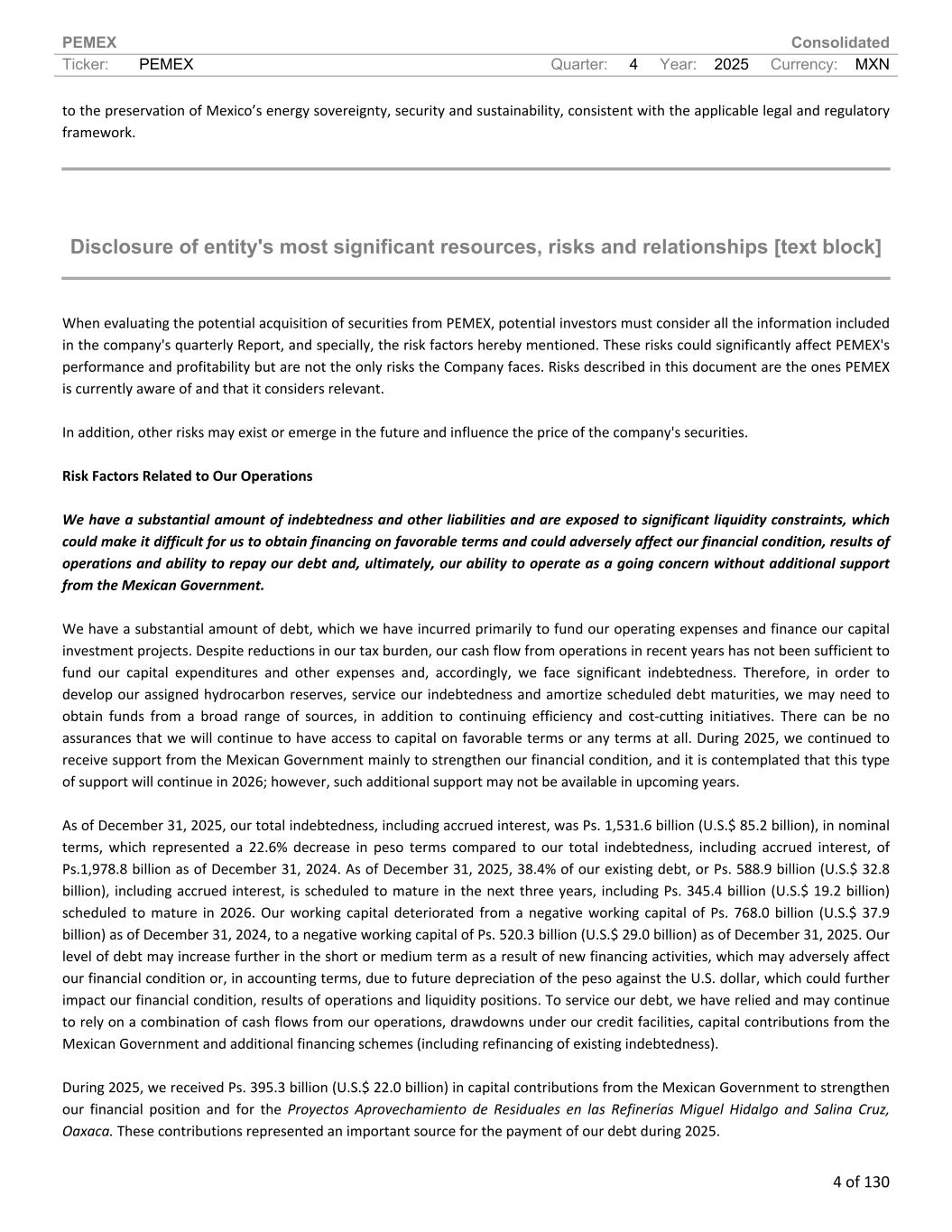 PEMEX Consolidated Ticker: PEMEX Quarter: 4 Year: 2025 Currency: MXN 4 of 130 to the preservation of Mexico’s energy sovereignty, security and sustainability, consistent with the applicable legal and regulatory framework. Disclosure of entity's most significant resources, risks and relationships [text block] When evaluating the potential acquisition of securities from PEMEX, potential investors must consider all the information included in the company's quarterly Report, and specially, the risk factors hereby mentioned. These risks could significantly affect PEMEX's performance and profitability but are not the only risks the Company faces. Risks described in this document are the ones PEMEX is currently aware of and that it considers relevant. In addition, other risks may exist or emerge in the future and influence the price of the company's securities. Risk Factors Related to Our Operations We have a substantial amount of indebtedness and other liabilities and are exposed to significant liquidity constraints, which could make it difficult for us to obtain financing on favorable terms and could adversely affect our financial condition, results of operations and ability to repay our debt and, ultimately, our ability to operate as a going concern without additional support from the Mexican Government. We have a substantial amount of debt, which we have incurred primarily to fund our operating expenses and finance our capital investment projects. Despite reductions in our tax burden, our cash flow from operations in recent years has not been sufficient to fund our capital expenditures and other expenses and, accordingly, we face significant indebtedness. Therefore, in order to develop our assigned hydrocarbon reserves, service our indebtedness and amortize scheduled debt maturities, we may need to obtain funds from a broad range of sources, in addition to continuing efficiency and cost-cutting initiatives. There can be no assurances that we will continue to have access to capital on favorable terms or any terms at all. During 2025, we continued to receive support from the Mexican Government mainly to strengthen our financial condition, and it is contemplated that this type of support will continue in 2026; however, such additional support may not be available in upcoming years. As of December 31, 2025, our total indebtedness, including accrued interest, was Ps. 1,531.6 billion (U.S.$ 85.2 billion), in nominal terms, which represented a 22.6% decrease in peso terms compared to our total indebtedness, including accrued interest, of Ps.1,978.8 billion as of December 31, 2024. As of December 31, 2025, 38.4% of our existing debt, or Ps. 588.9 billion (U.S.$ 32.8 billion), including accrued interest, is scheduled to mature in the next three years, including Ps. 345.4 billion (U.S.$ 19.2 billion) scheduled to mature in 2026. Our working capital deteriorated from a negative working capital of Ps. 768.0 billion (U.S.$ 37.9 billion) as of December 31, 2024, to a negative working capital of Ps. 520.3 billion (U.S.$ 29.0 billion) as of December 31, 2025. Our level of debt may increase further in the short or medium term as a result of new financing activities, which may adversely affect our financial condition or, in accounting terms, due to future depreciation of the peso against the U.S. dollar, which could further impact our financial condition, results of operations and liquidity positions. To service our debt, we have relied and may continue to rely on a combination of cash flows from our operations, drawdowns under our credit facilities, capital contributions from the Mexican Government and additional financing schemes (including refinancing of existing indebtedness). During 2025, we received Ps. 395.3 billion (U.S.$ 22.0 billion) in capital contributions from the Mexican Government to strengthen our financial position and for the Proyectos Aprovechamiento de Residuales en las Refinerías Miguel Hidalgo and Salina Cruz, Oaxaca. These contributions represented an important source for the payment of our debt during 2025.